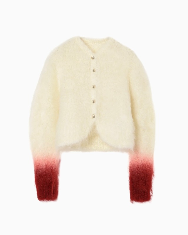 【色】white 【素材】モヘヤ 59% ウール 38% ナイロン 3% 【サイズ】1 【採寸】 1 着丈: 48.5cm 肩巾: 40cm 袖丈: 64cm バスト: 46cm 裾: 38cm 衣類の採寸は、すべて平台に平置きし、外寸を測定しております。 アイテムによっては、若干の誤差(1-2cm)がある場合がございます。 パソコンでの閲覧という特性上、商品の画像が実際の色目と多少異なる場合が有ります。 【商品説明】 軽やかな印象を与える起毛ニットカーディガン。 1点ずつ丁寧に手作業で起毛加工を施すことで、軽やかで柔らかな質感と、立体的で豊かな表情を生み出した。光沢感とハリのあるモヘア糸を使用し、丸みのある袖のフォルムと、フィット感のあるコンパクトな身頃がデザインにメリハリを与える。袖口に吊るし染めによる鮮やかな色彩をあしらうことで、シンプルながらも気品ある印象に仕上げている。シンプルなシルエットは、カジュアルからエレガントまで幅広いスタイルに寄り添う一着。 TOLMA.オンラインストアの商品は、実店舗でも販売しております。 画面上で在庫がある状態になっている場合でもタイミングによっては在庫切れの場合もございます。予めご了承下さい。