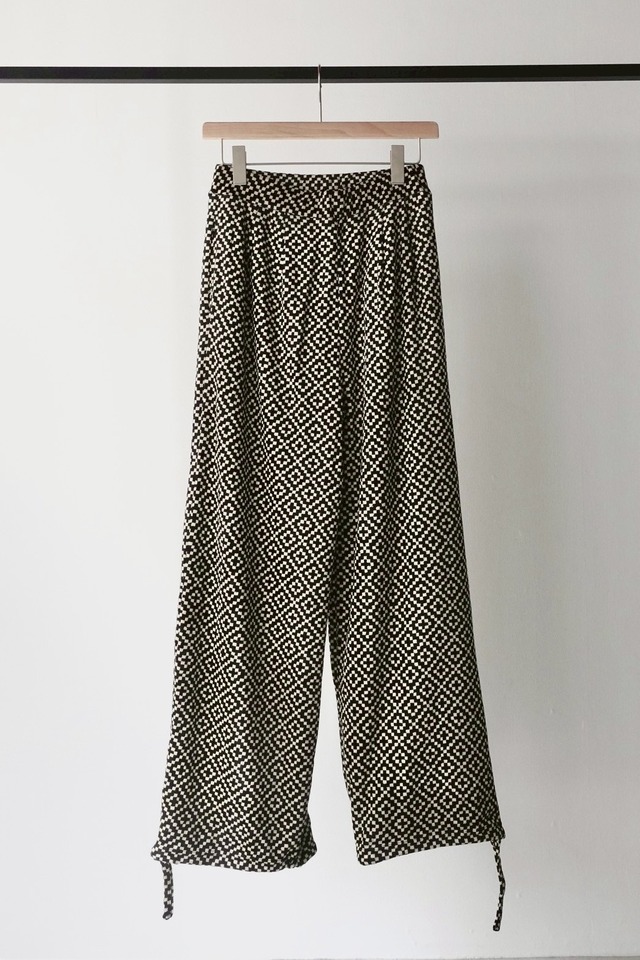 素材 :RAYON 62% COTTON38% サイズ : one 採寸: 脇丈102cm〜105cm ウエストゴム33cm わたり33.5cm 裾幅30cm 【商品説明】 今期のテーマでもある、ロシア北部やスカンジナビア地域に住んでいたポモール人が着ていた伝統的なウールのセーターからインスピレーションを受けた オリジナルのベロア素材。レーヨンとコットン素材のベロアなので肌触りも良くやわらかく、静電気も起こりにくく上品なベロア素材です。 いつかこの服たちもヴィンテージになるような、飽きのこない柄、素材を大切にしています。 ウエストと裾にドローコードのついたワイドパンツ。 お尻まわりはすっきりしたシルエットです。 裾のドローコードを絞ることにより印象が変わります。 衣類の採寸は、すべて平台に平置きし、外寸を測定しております。 アイテムによっては、若干の誤差(1-2cm)がある場合がございます。 パソコンでの閲覧という特性上、商品の画像が実際の色目と多少異なる場合が有ります。 TOLMA.オンラインストアの商品は、実店舗でも販売しております。 画面上で在庫がある状態になっている場合でもタイミングによっては在庫切れの場合もございます。予めご了承下さい。
