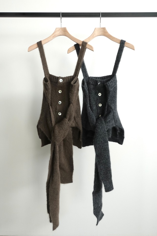 素材 :表地 Kid-mohair 55% Wool 15% Nylon 30% サイズ : 38 採寸: 着丈(CB) 40 cm 身巾 36cm〜 肩幅(肩ヒモ) 21cm 肩ヒモ長さ 41 cm ベルト長さ 70cm 【商品説明】 ・キッドモヘアを贅沢に使用したニットキャミトップ(フェアアイルニットの柄の中にも同じ糸を使用しています) ・カーディガンを解体して作成したため、名残りのあるディテールが特徴的です (袖のような形状のウエストベルト、前脇の飾りポケット、総針の肩ヒモ) ・ウエストベルトは前でも後でも巻いて楽しめます ・胸元のリブがしっかりとなじむため、インナーに合わせて前開きの第一ボタンを調整してください Made in Japan 衣類の採寸は、すべて平台に平置きし、外寸を測定しております。 アイテムによっては、若干の誤差(1-2cm)がある場合がございます。 パソコンでの閲覧という特性上、商品の画像が実際の色目と多少異なる場合が有ります。 TOLMA.オンラインストアの商品は、実店舗でも販売しております。 画面上で在庫がある状態になっている場合でもタイミングによっては在庫切れの場合もございます。予めご了承下さい。