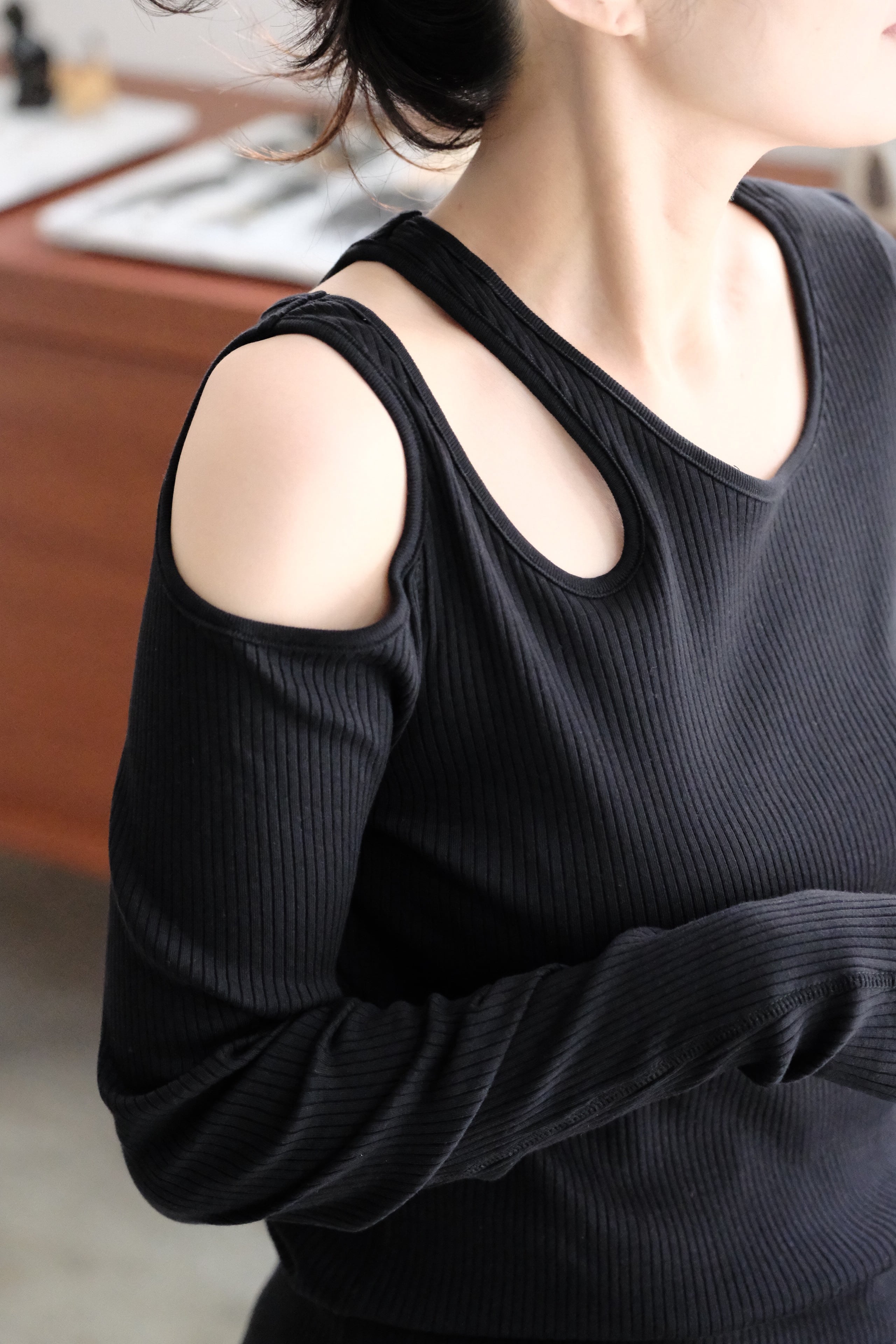 GOTS認証を取得しているインドのオーガニック超長綿糸を使用した長袖プルオーバー。ショルダーホールをアシンメトリーにデザインしたアイテム。1枚でも様になり、インナーとしてもコーディネートしやすくおすすめの新型です。