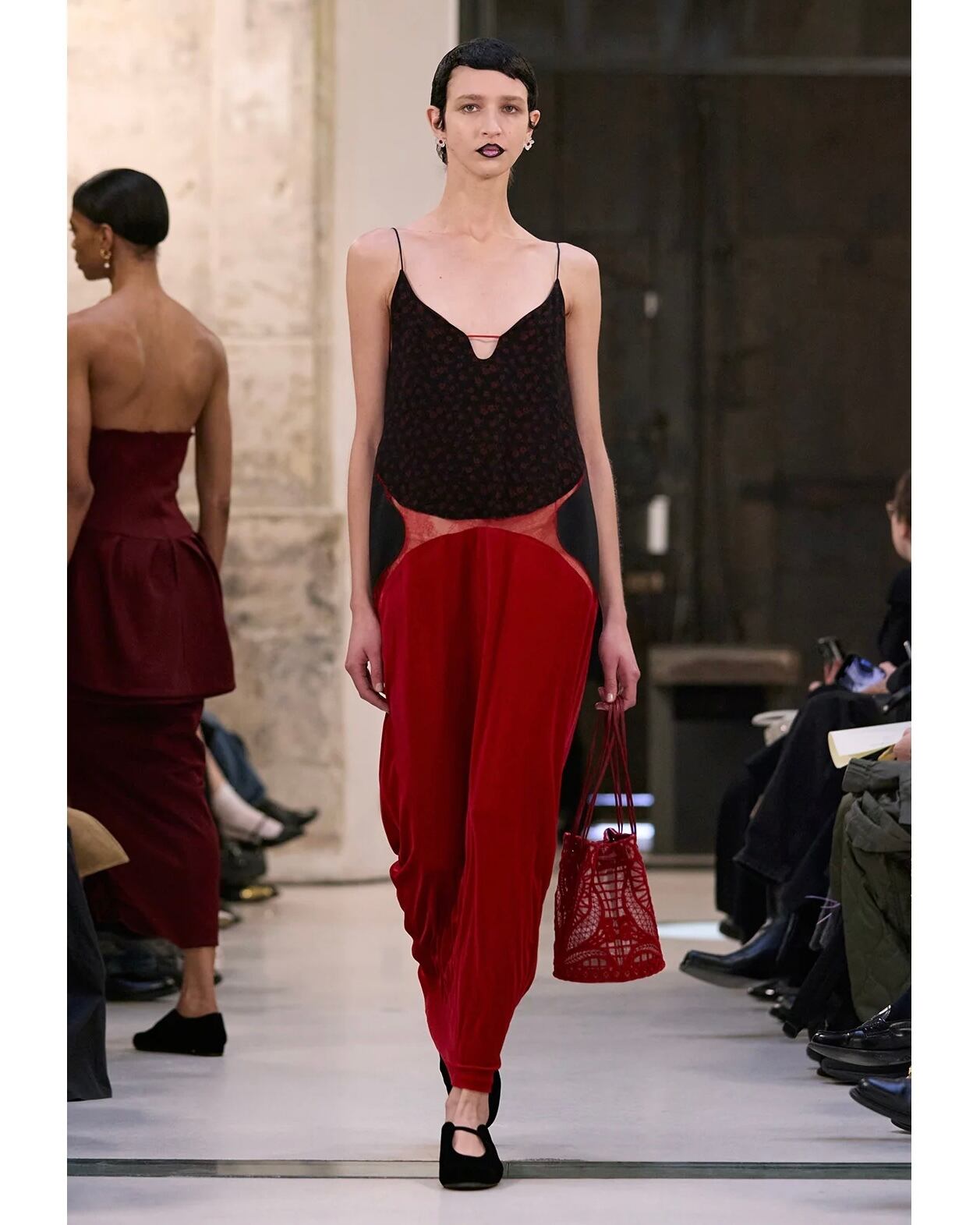 ガラスで形成された花びらと中央にあしらった赤いビジューの愛らしいデザインがいつもの装いに華やぎを与える。ガラスのモチーフは職⼈の⼿作業によって1点1点形成され、細かい砂を当て研磨するフロスト加工を施すことですりガラスのような儚げな印象に。キャッチには淡水パールを使用し、柔らかな光沢が上品な印象を与える1点。