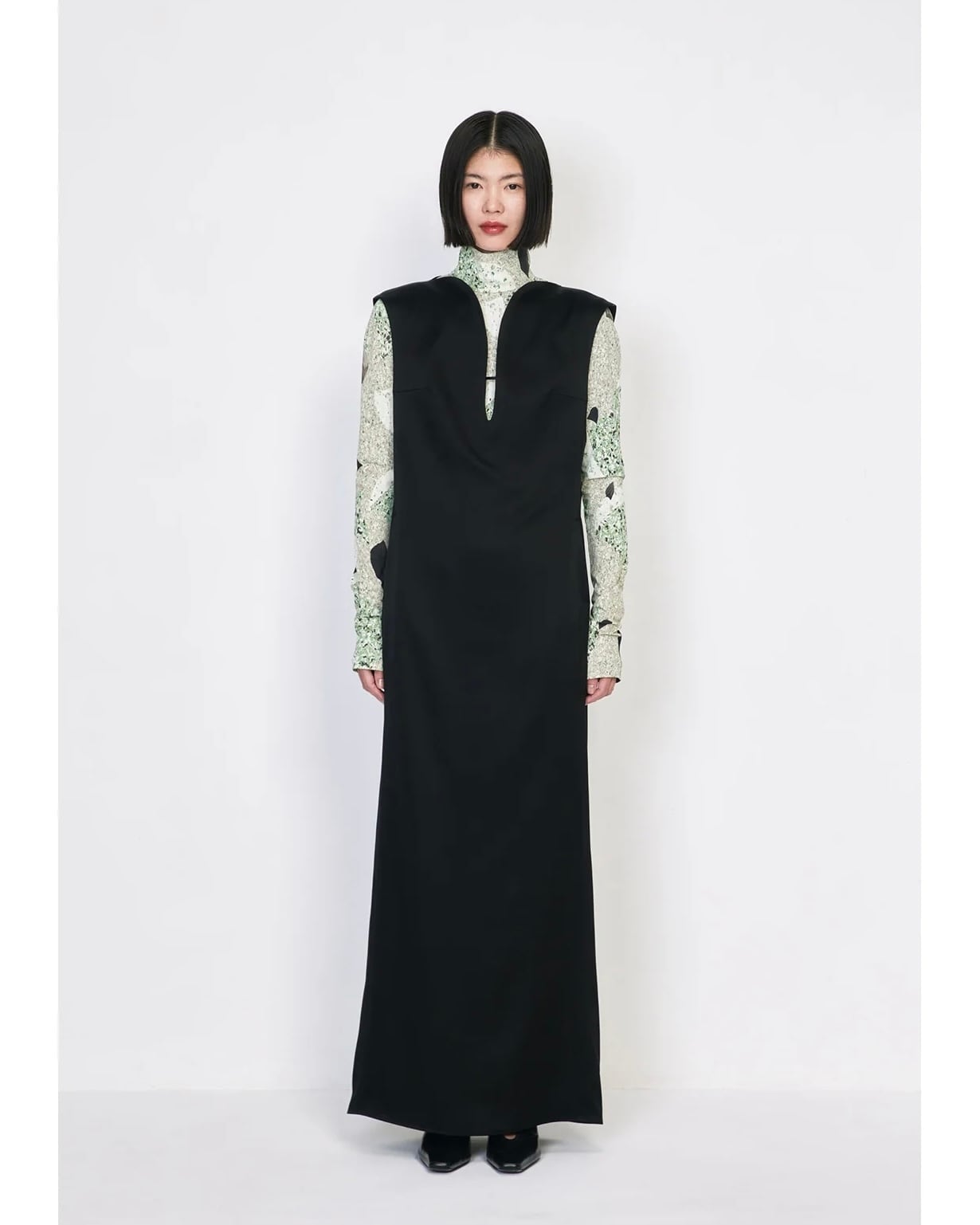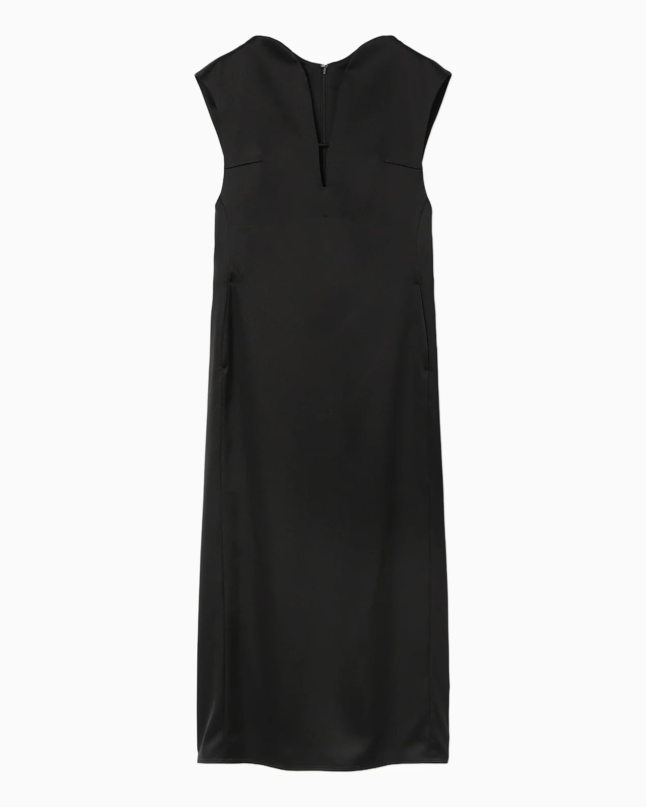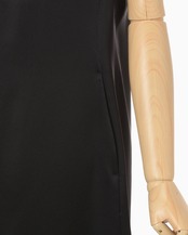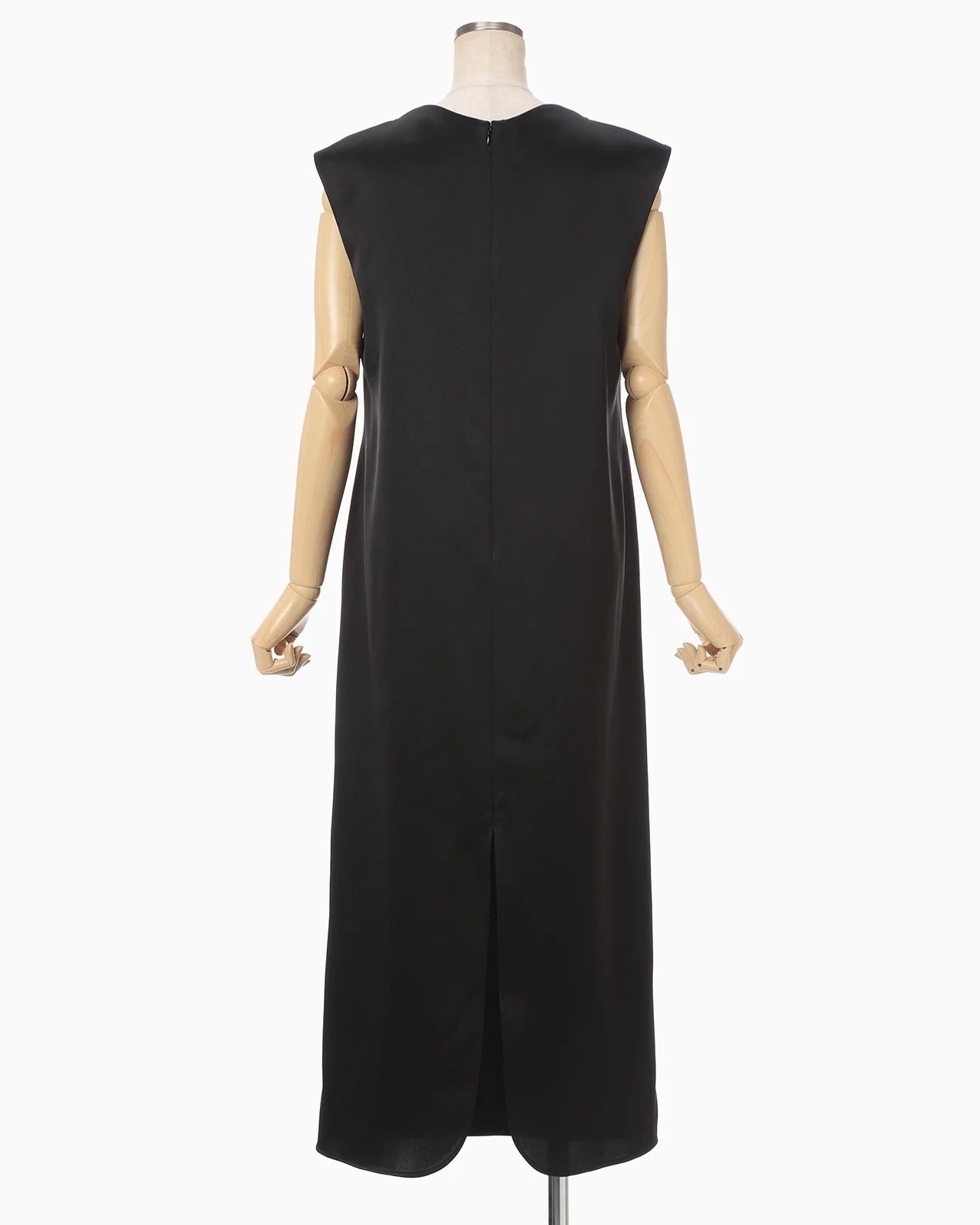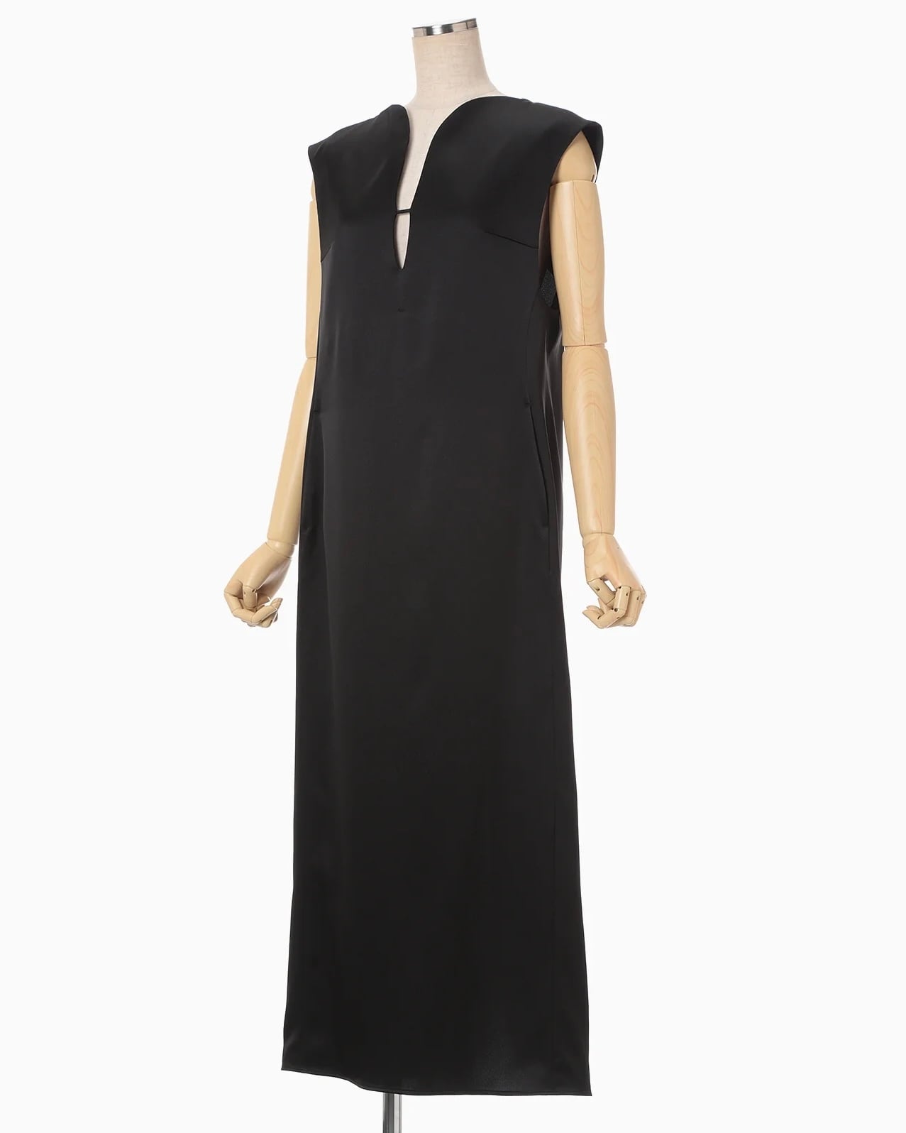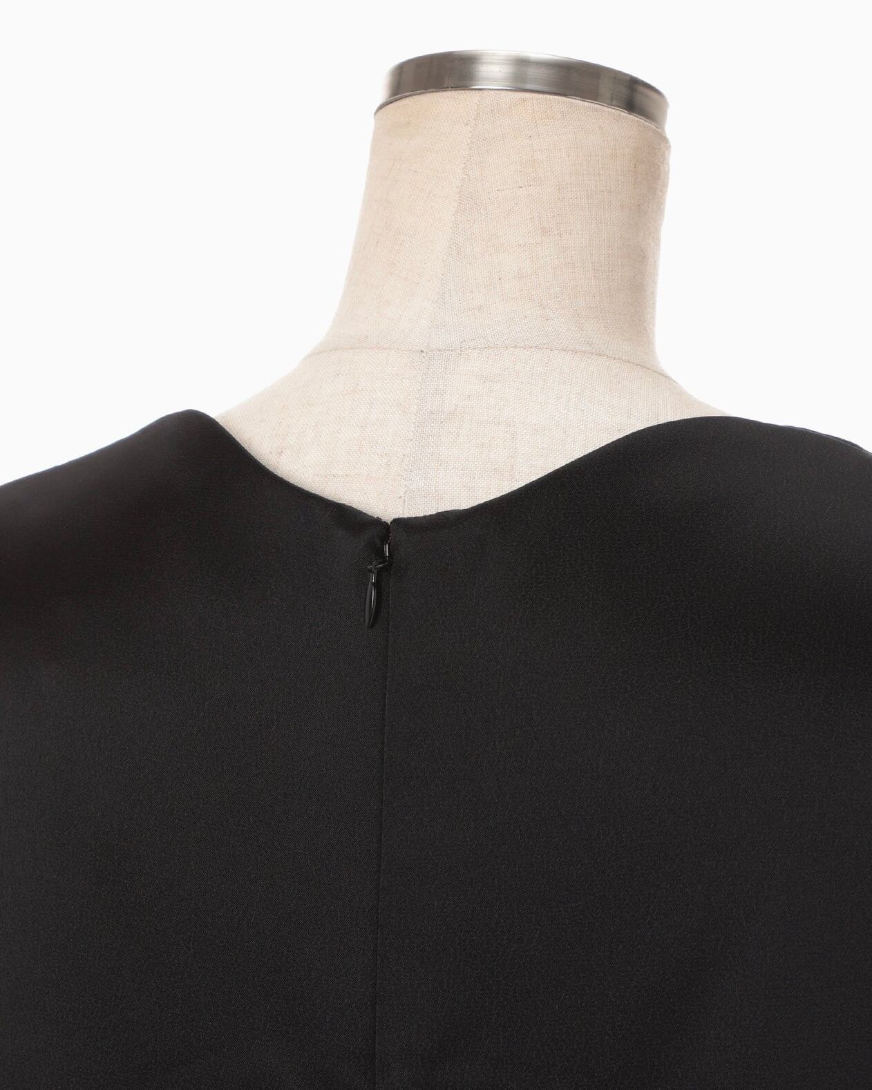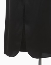 トリアセテート⾼混率のサテン地にエンボス加⼯を施しスムースレザーのような表情に。シルクの⽷断⾯に近いトリアセテートをベースにすることでなめらかな艶を持ちながら、エンボスの凹凸が立体的で独特な光沢が深みを与えるIラインドレスは、胸元のカーブするラインから流れるような深いスリットに、すっきりとした縦のラインが印象的。バックスリットにもカーブラインを配したエレガントな1着。
