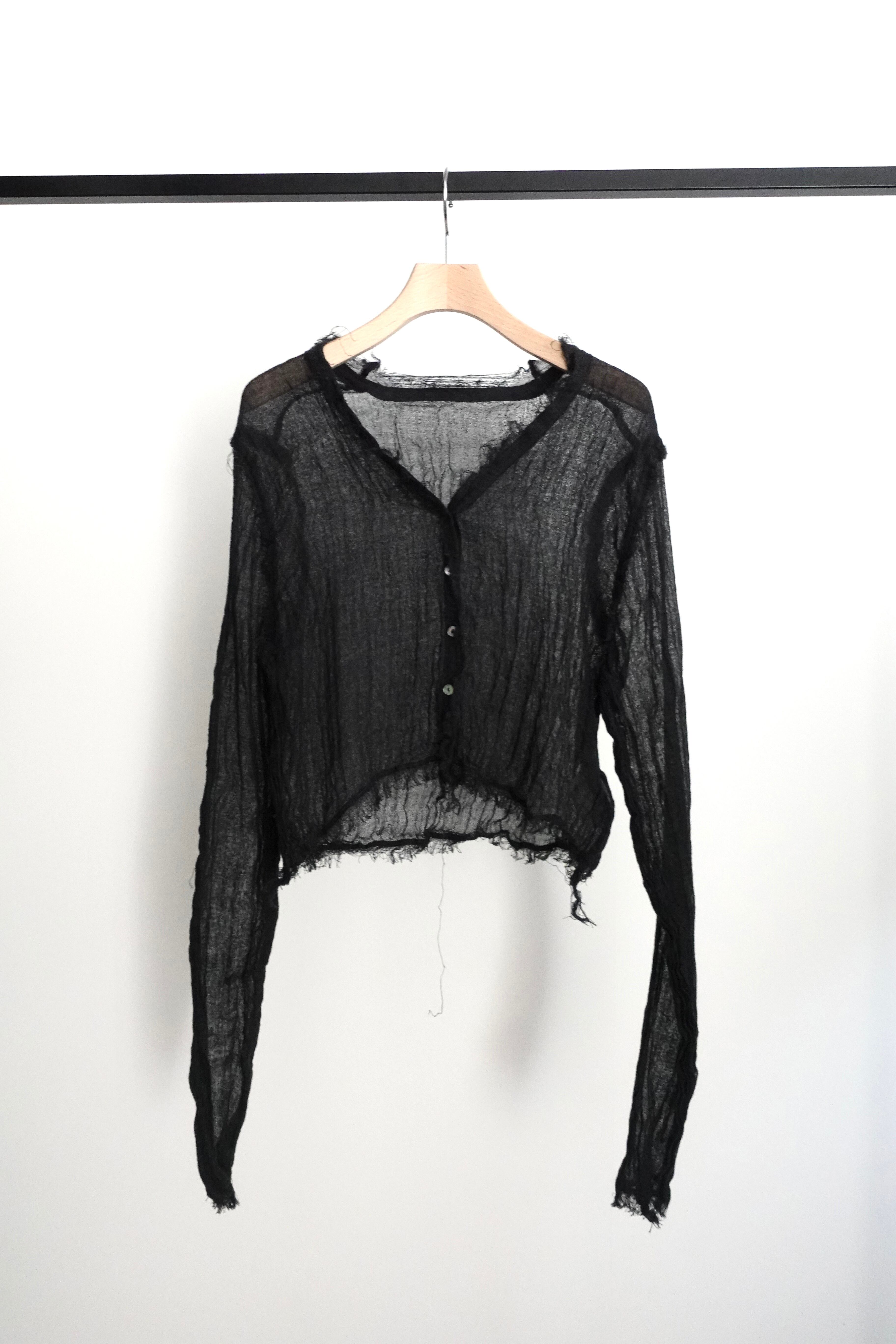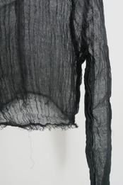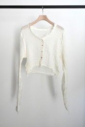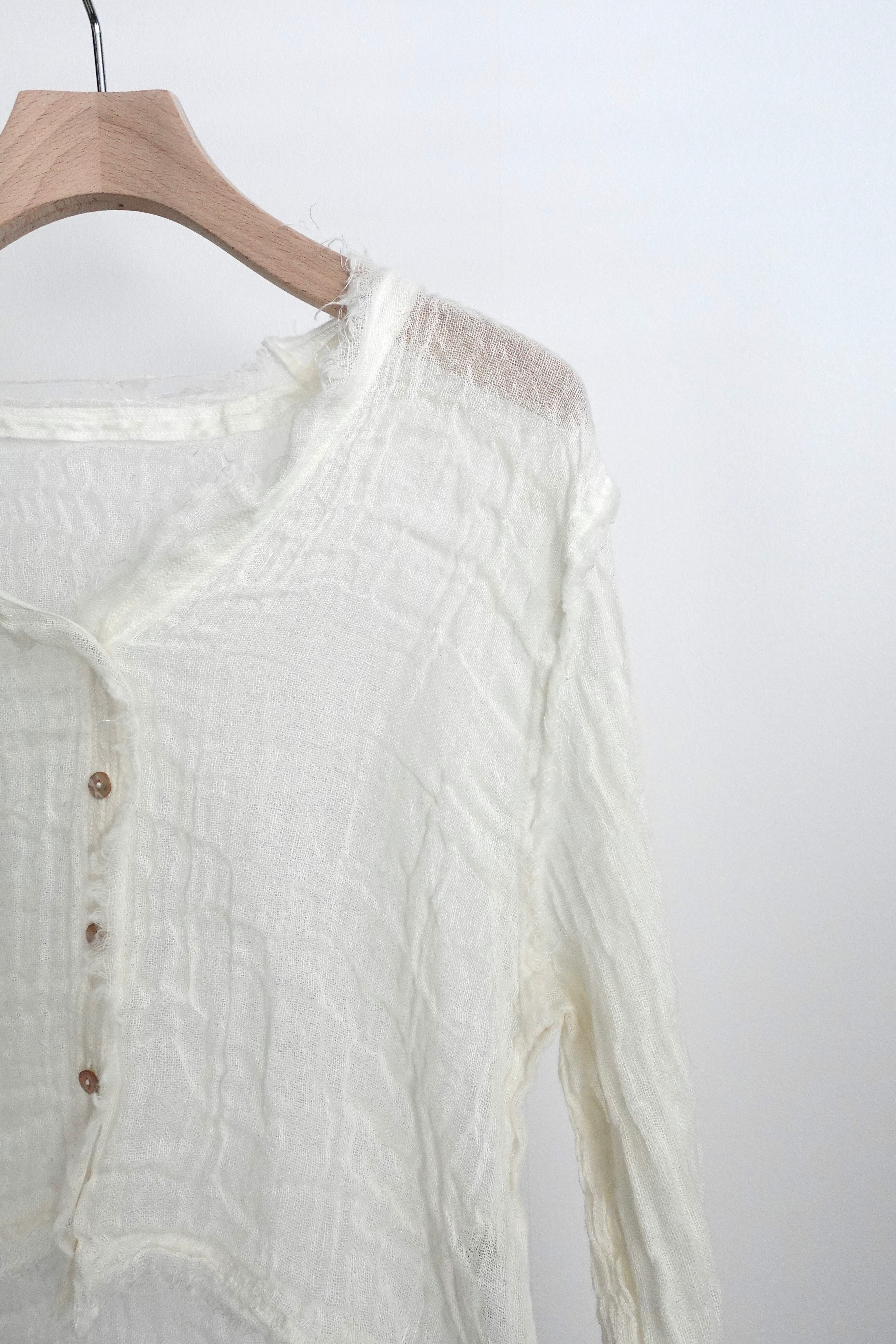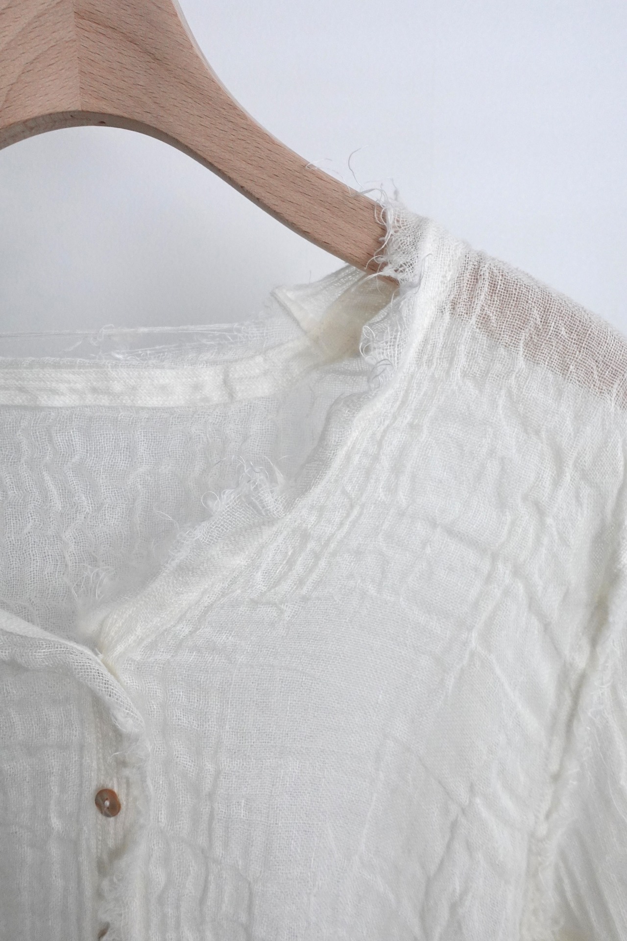 製品にした後、湯洗い加工することにより、生地に膨らみがでて1点1点異なるシワが現れます。とても肌障りの良い、透け感があっても暖かい、唯一無二な仕上がりになりました。