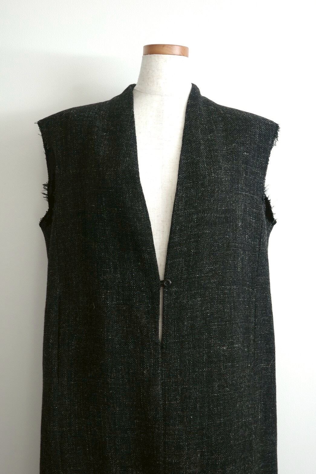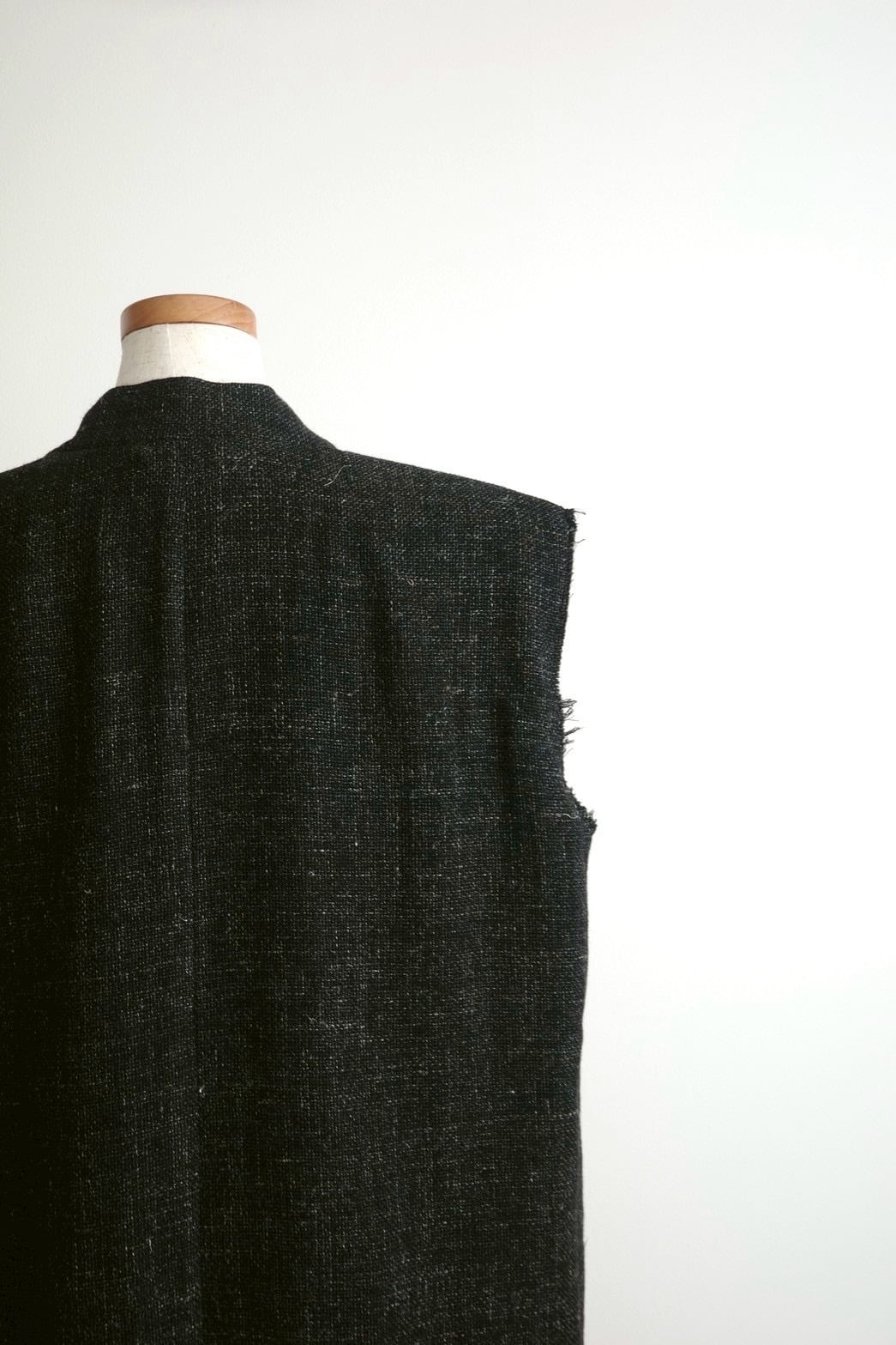 袖口を立ち切りにし、あえて肩パッドの断面を見せている。