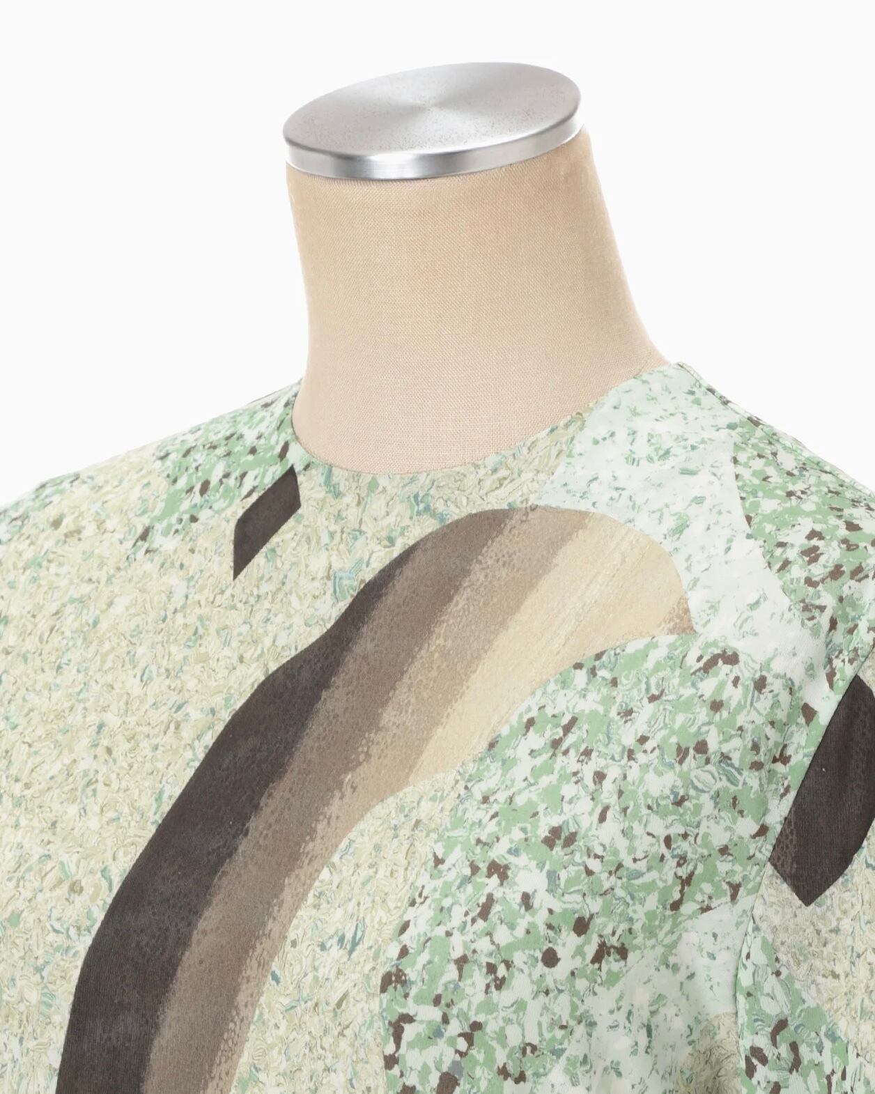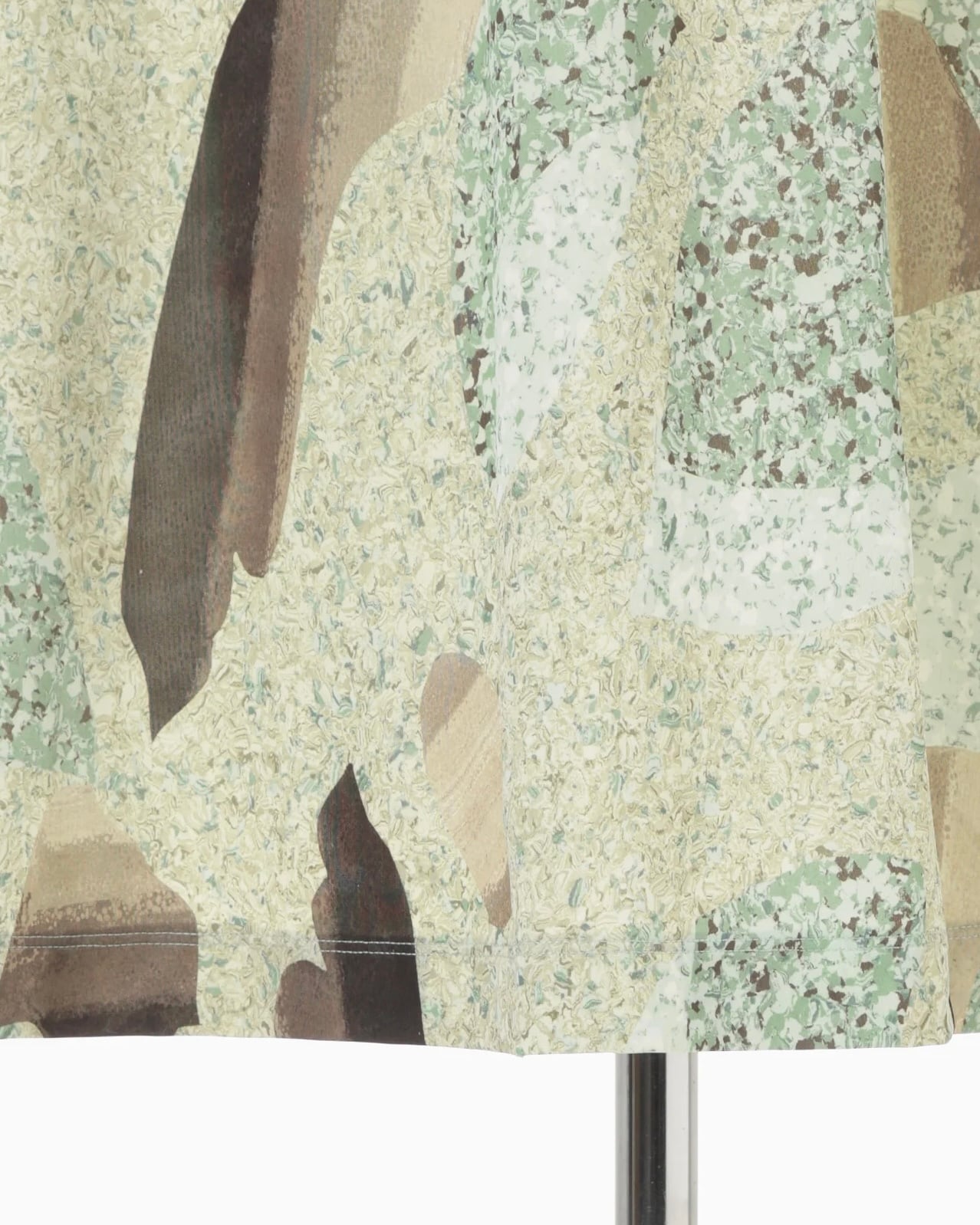 長野で出会った地層模様の石のテクスチャーや断面の景色をブランドオリジナル柄で表現。世界でも1社のみが有する手作業のプリント技術により、繊細な柄表現が可能に。軽やかなリサイクルポリエステルとリサイクルポリウレタンの生地にプリントされたマーブルは、大胆な柄ながら手作業の繊細さが際立つ美しい1着。裾に向かってフレアするシルエットのドレスは、Aラインにすることでゆったりとした着用感を叶え、1枚で華やかな印象を与え忽ち装いをコンセプチュアルへと押し上げる。