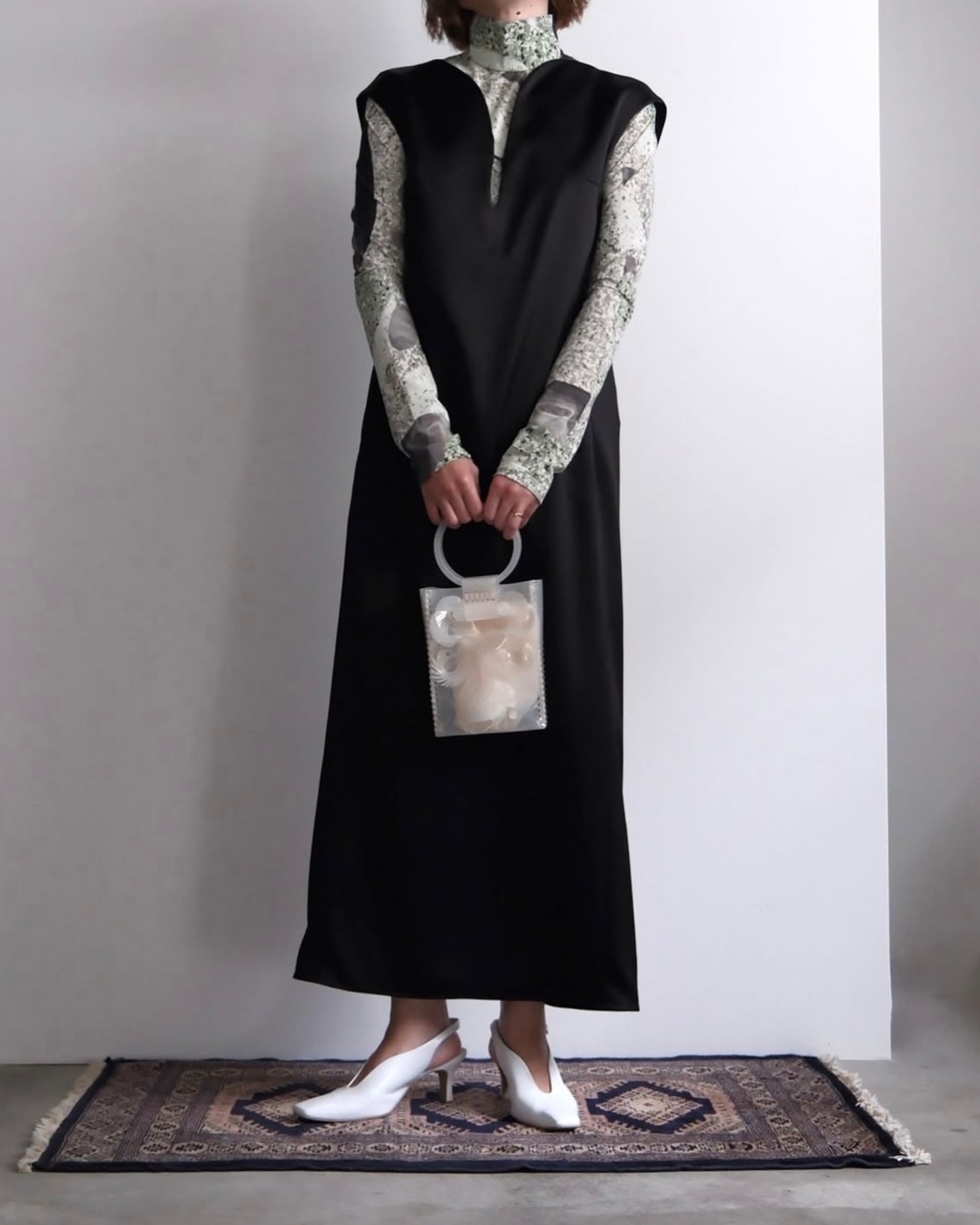 長野で出会った地層模様の石のテクスチャーや断面の景色をブランドオリジナル柄で表現。世界でも1社のみが有する手作業のプリント技術により、繊細な柄表現が可能に。軽やかなリサイクルポリエステルとリサイクルポリウレタンの生地にプリントされたマーブルは、大胆な柄ながら手作業の繊細さが際立つ美しい1着。身体に沿うようにフィットするハイネックトップは、タイトな作りが様々なレイヤードスタイルを可能にしながら1枚で華やかな印象を与え、忽ち装いをコンセプチュアルへと押し上げる。