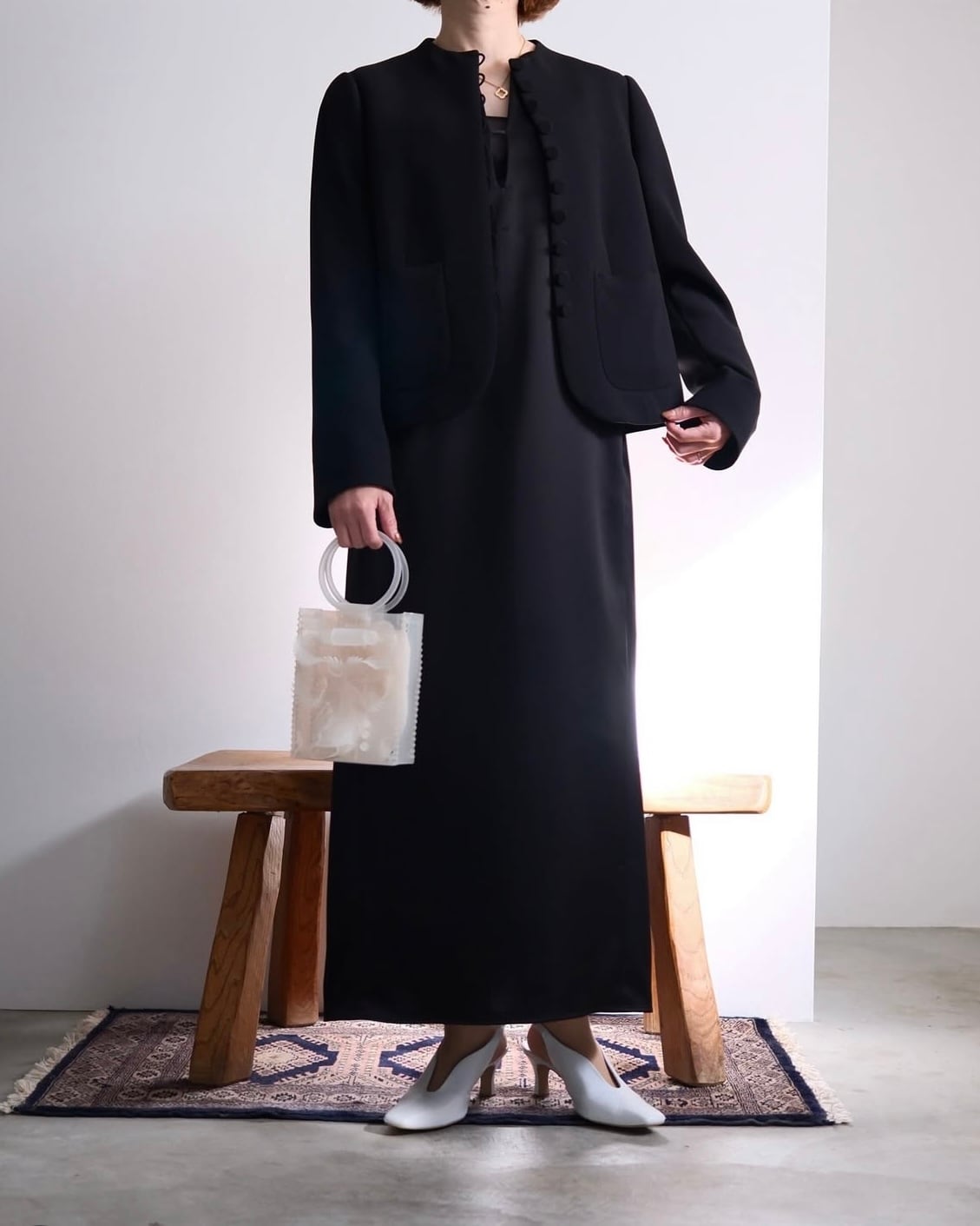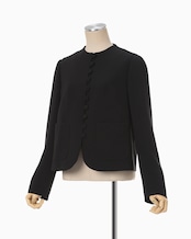 ストレッチ性を備えながらシワになりにくく、イージーケアを実現する機能素材が、日常使いにも最適な一着に仕上げている。コンパクトな着丈と連なるくるみボタンがクラシカルなスタイルを実現。胸下にダーツを入れることで、立体的なカッティングが身体を優しく包み込み、カジュアルになりすぎないエレガントさを兼ね備えたシーズンレスな1着。