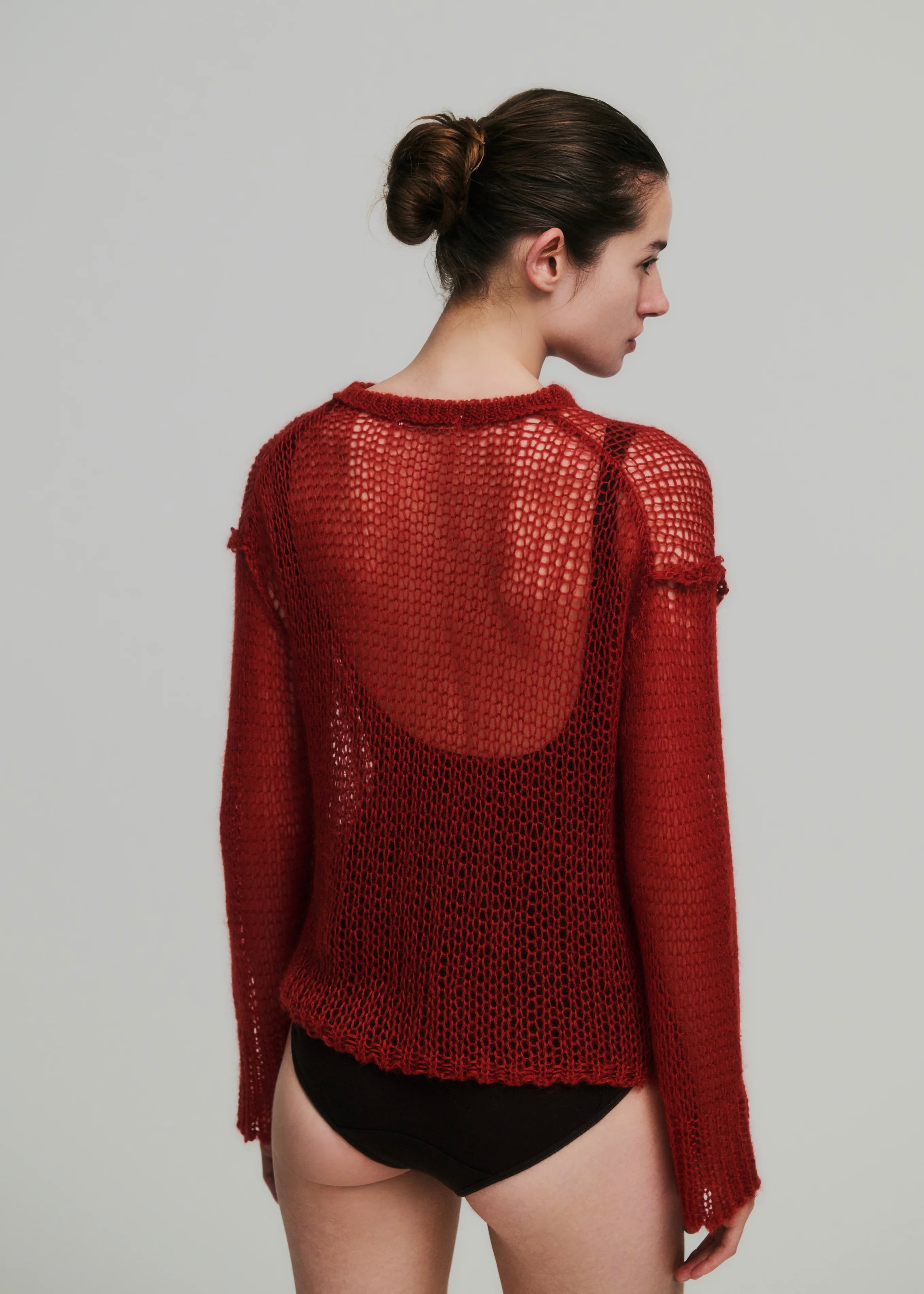 極細繊維のSUPER KID MOHAIR にウールとナイロンを混紡し弾力性を出したシャギーヤーンで編み立てたルーズなロングスリーブニットとマッチングカラーのボディスーツとのセットアップ。インナーのボディはシルク素材を使用した柔らかなリブニットのインナーシリーズです。