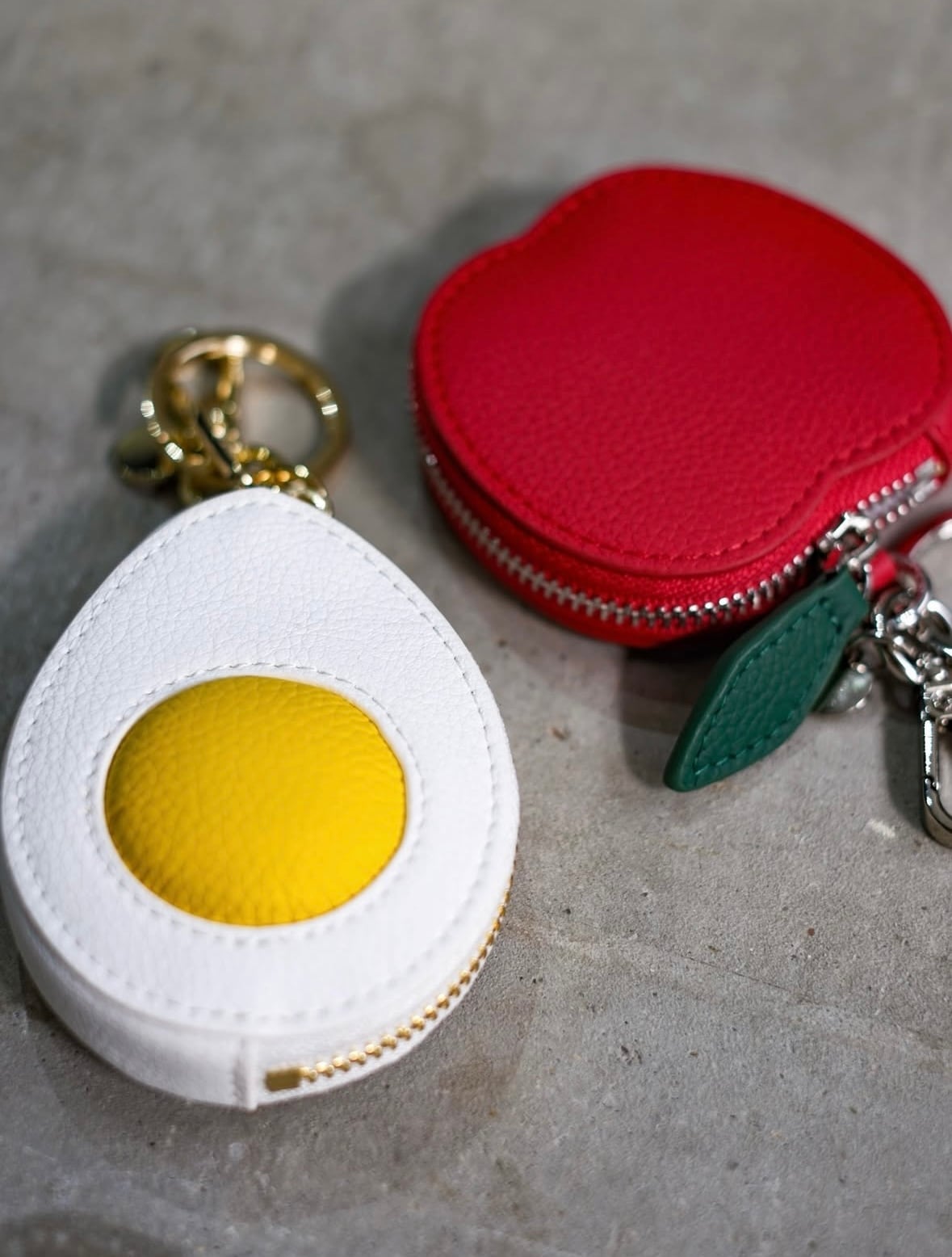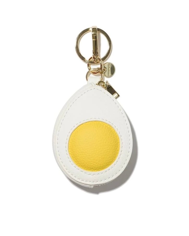 黄身部分がぽこっとしていて可愛らしいたまご型チャーム。本体表面はフランス産シュリンクレザー(牛革)を使用しています。