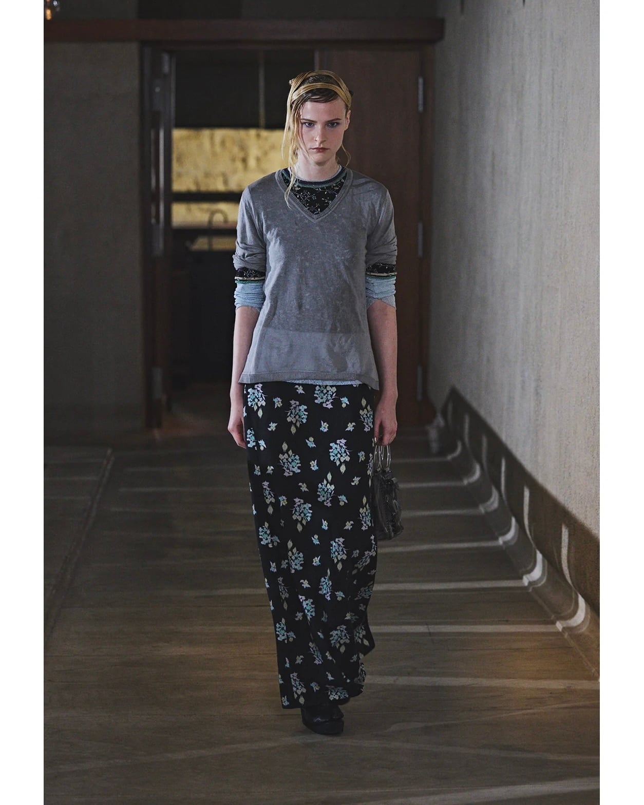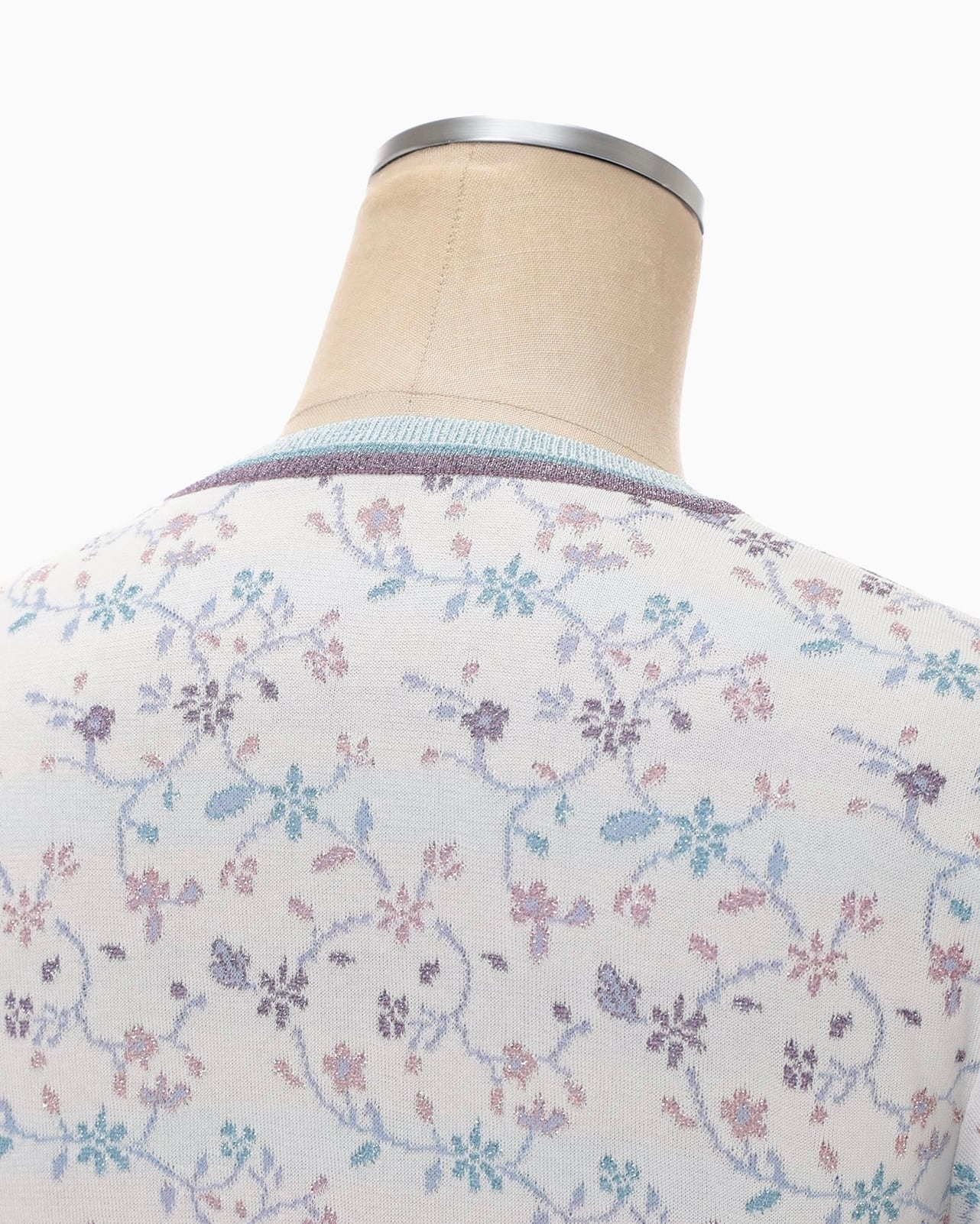 ペールトーンの配色とラメ糸を用いた総柄に、ショート丈のコンパクトなシルエットのバランスが愛らしい1着。