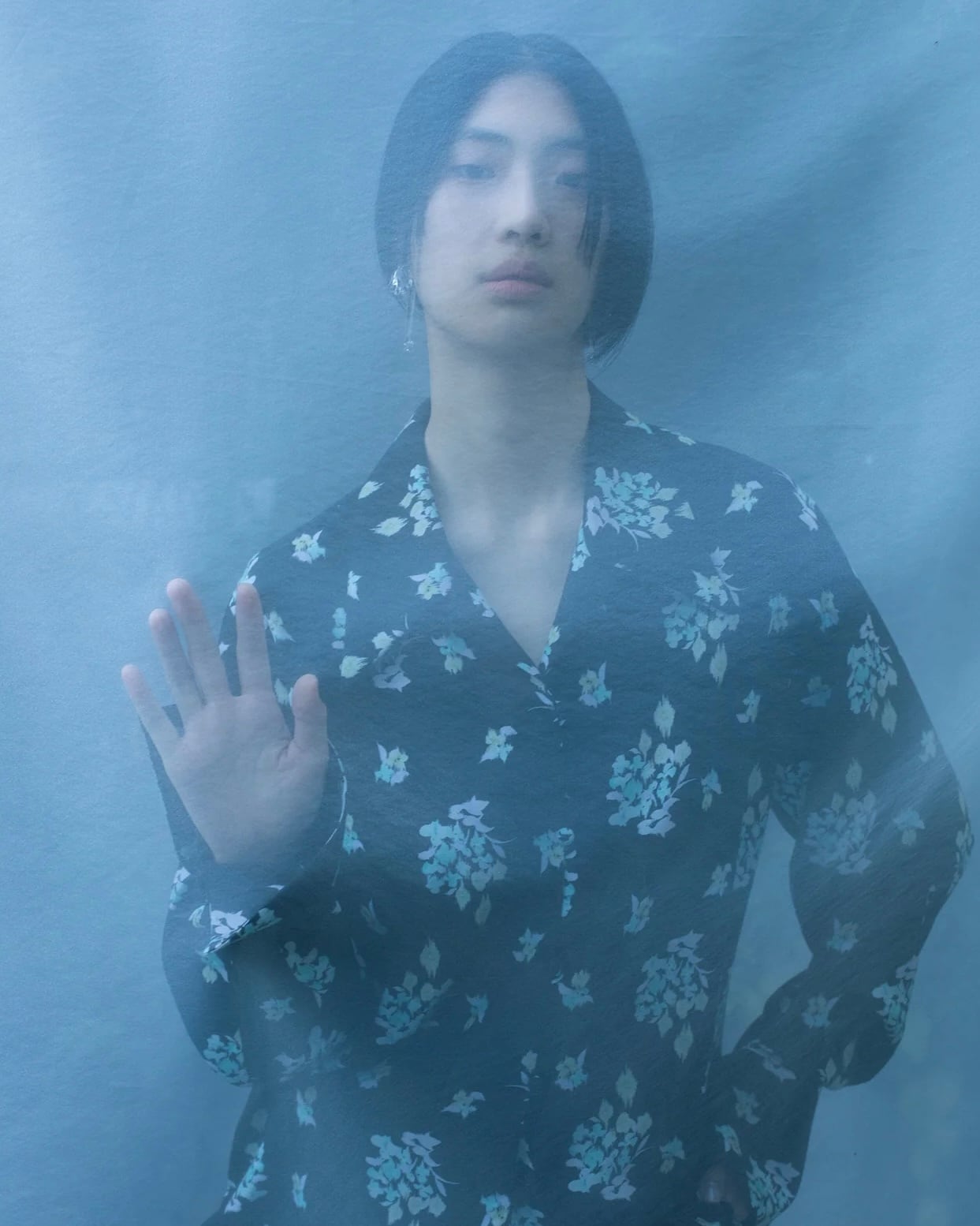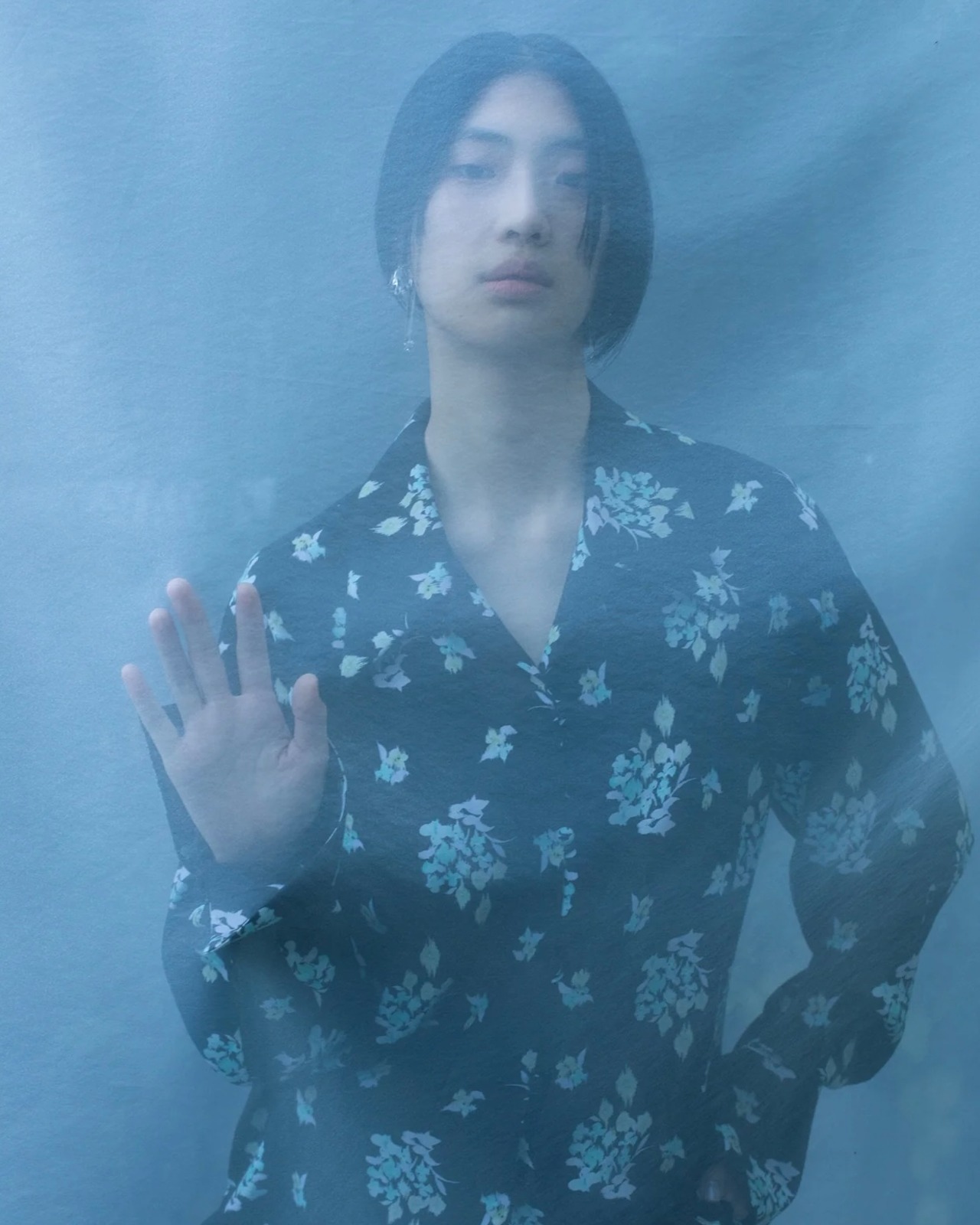 江戸時代の和ガラスのように淡く、絣のような花柄をプリントしたオーバーサイズシャツ。