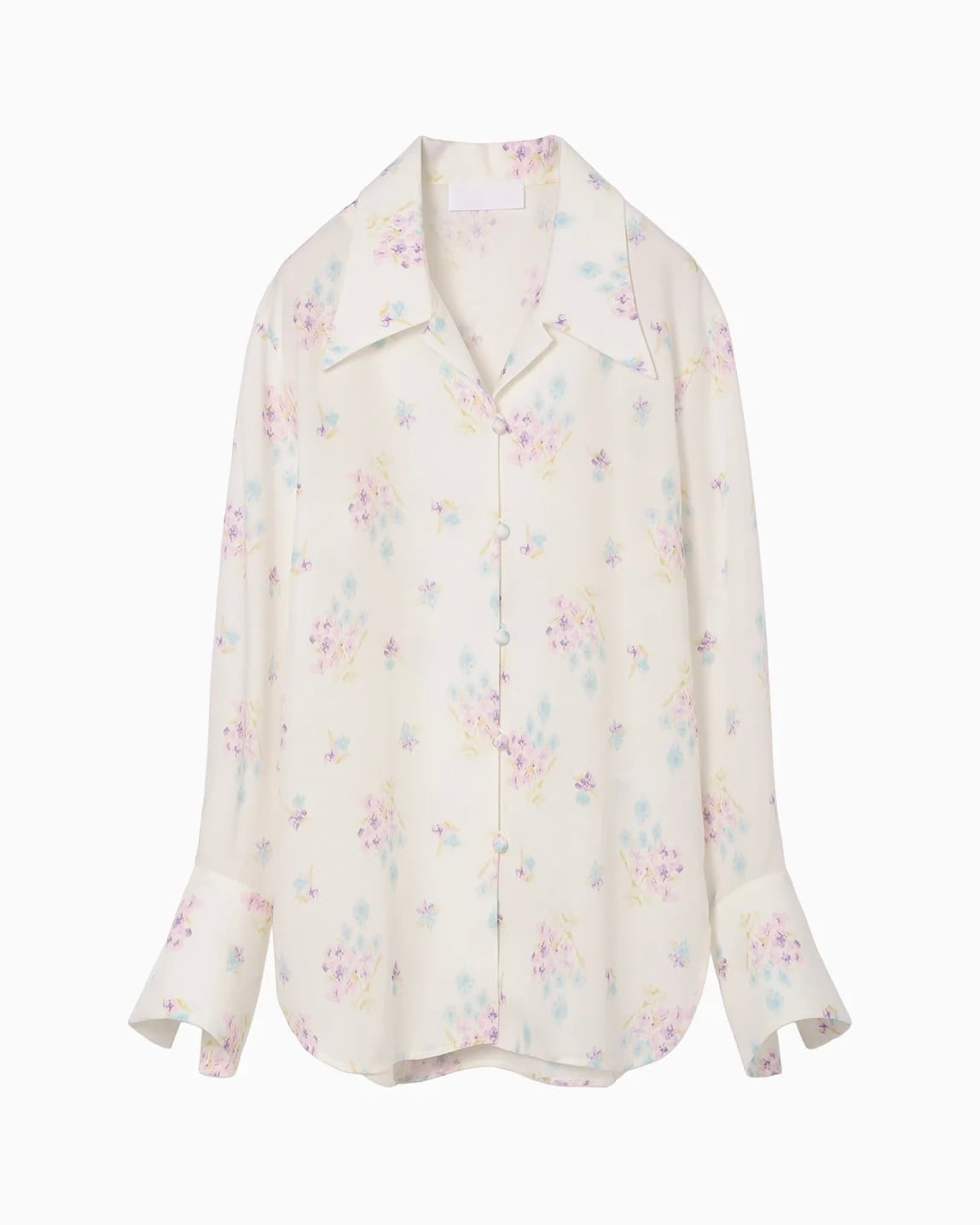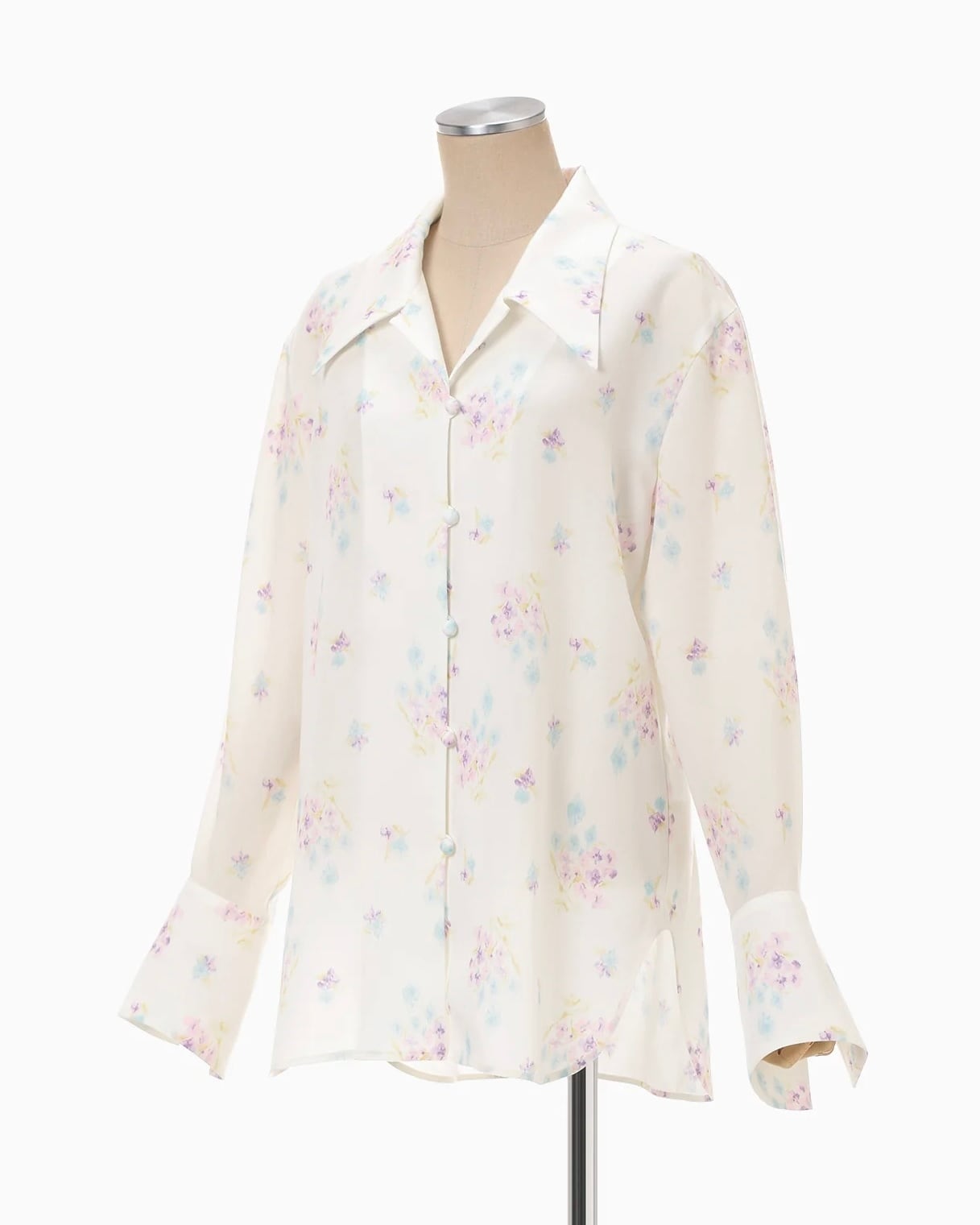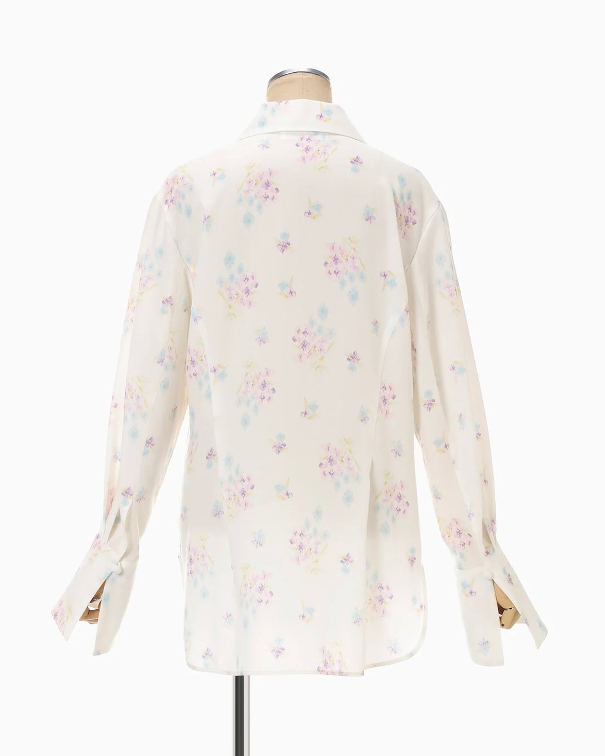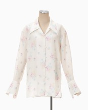 江戸時代の和ガラスのように淡く、絣のような花柄をプリントしたオーバーサイズシャツ。