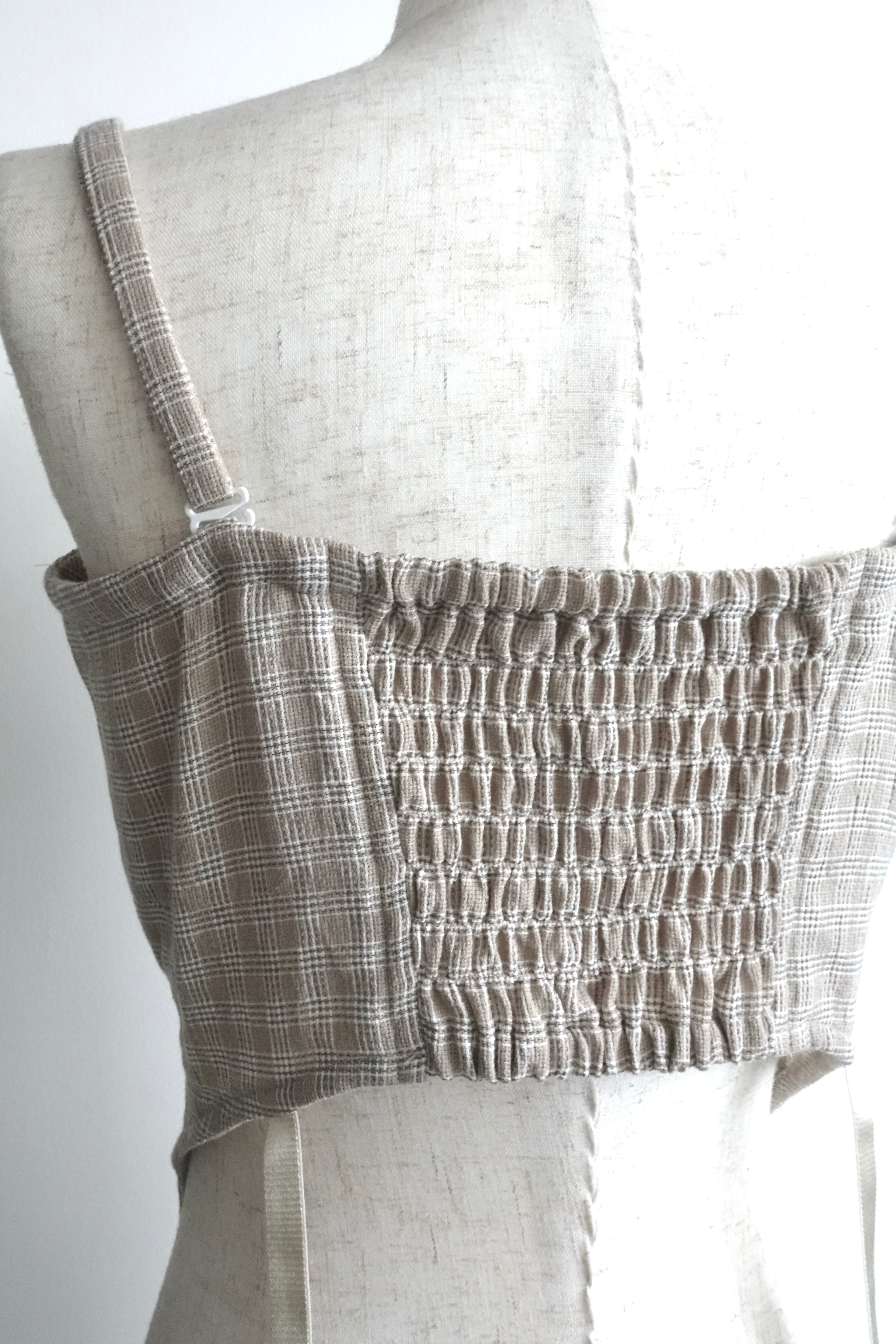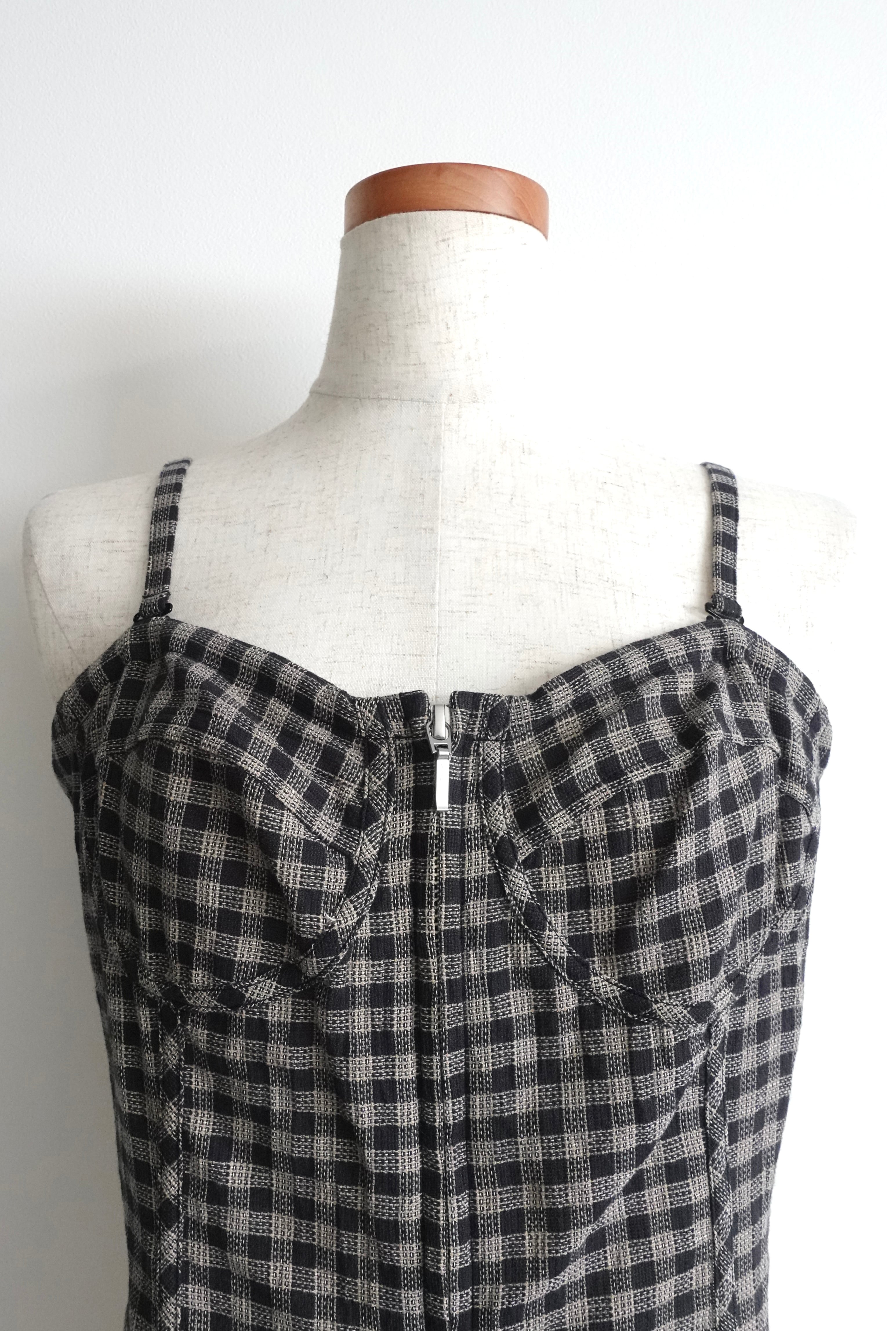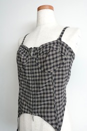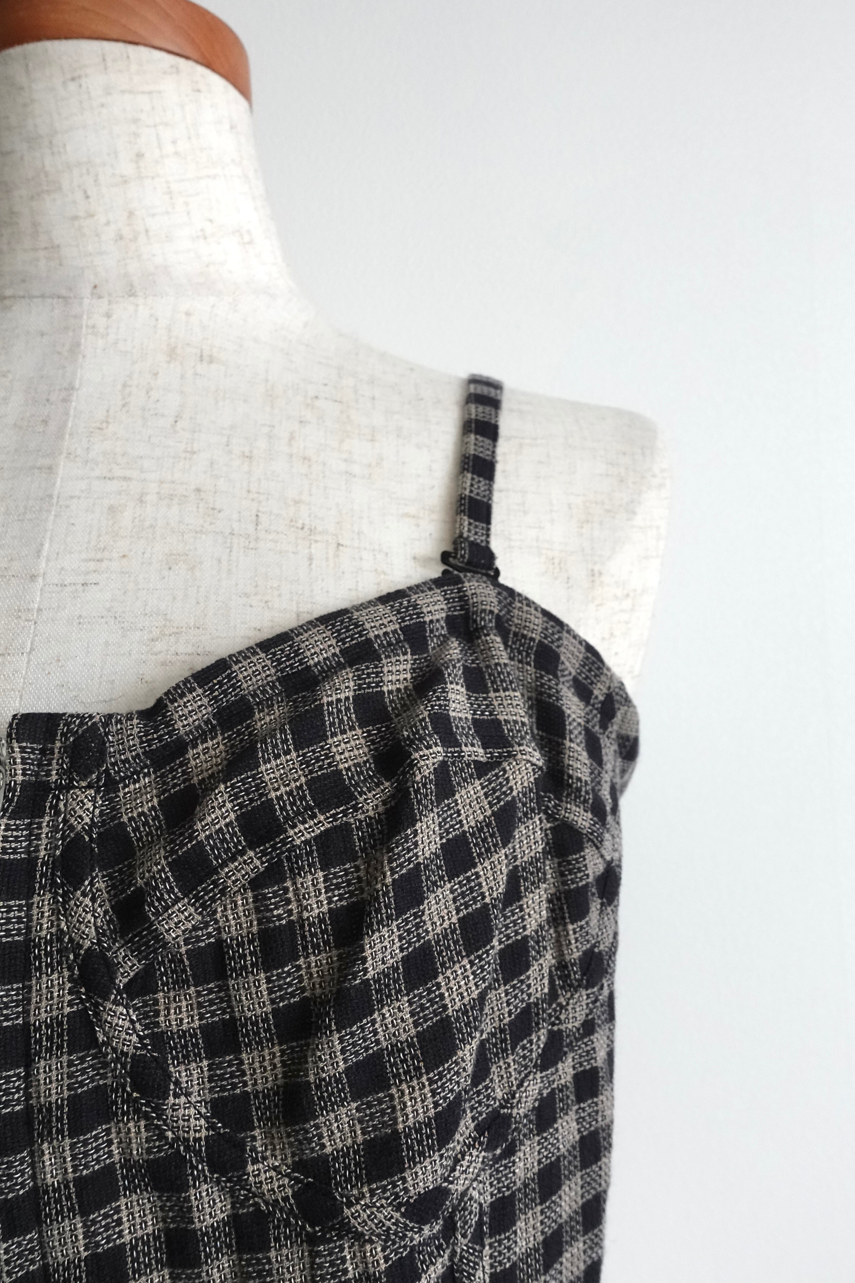 オリジナルの疑紗(ギシャ)組織のコットンチェック生地。この生地の組織の一番の特徴は、紗のように外観から見て、目が開いて透けて見えることが最大のポイントです。