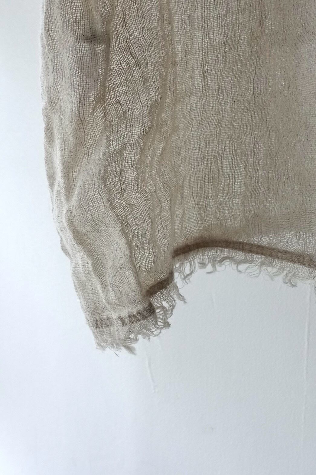 製品にした後、湯洗い加工することにより、生地に膨らみがでて1点1点異なるシワが現れます。とても肌障りの良い、透け感があっても暖かい、唯一無二な仕上がりになりました。