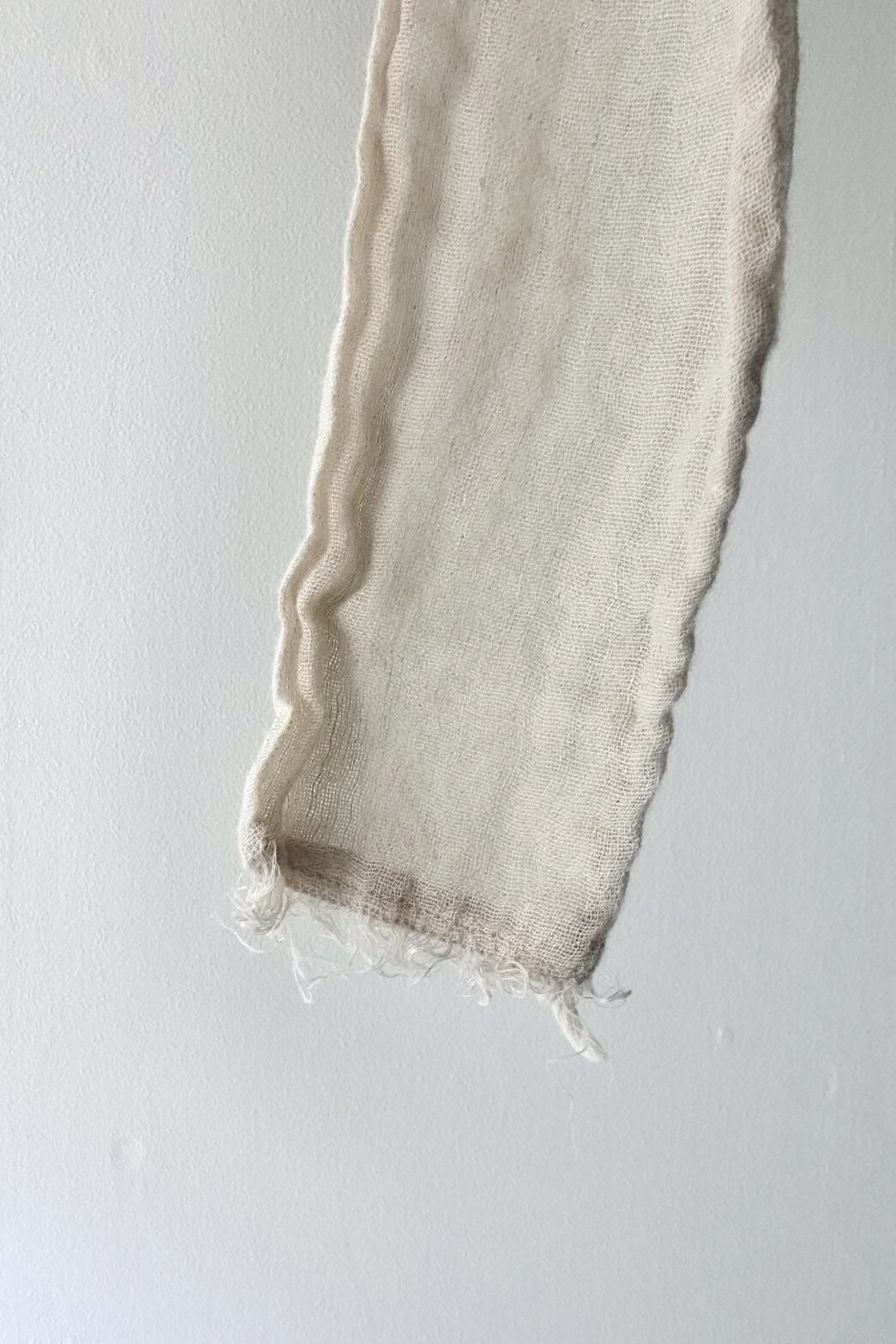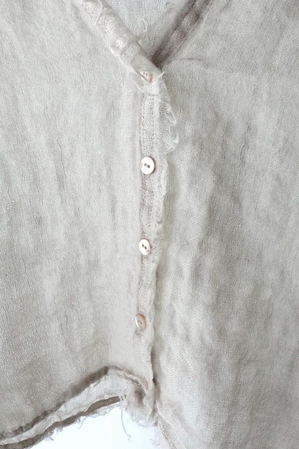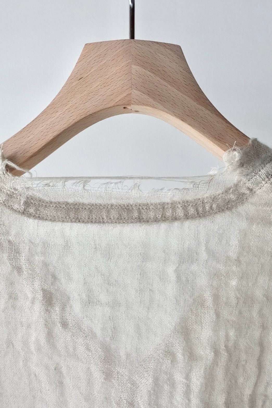製品にした後、湯洗い加工することにより、生地に膨らみがでて1点1点異なるシワが現れます。とても肌障りの良い、透け感があっても暖かい、唯一無二な仕上がりになりました。