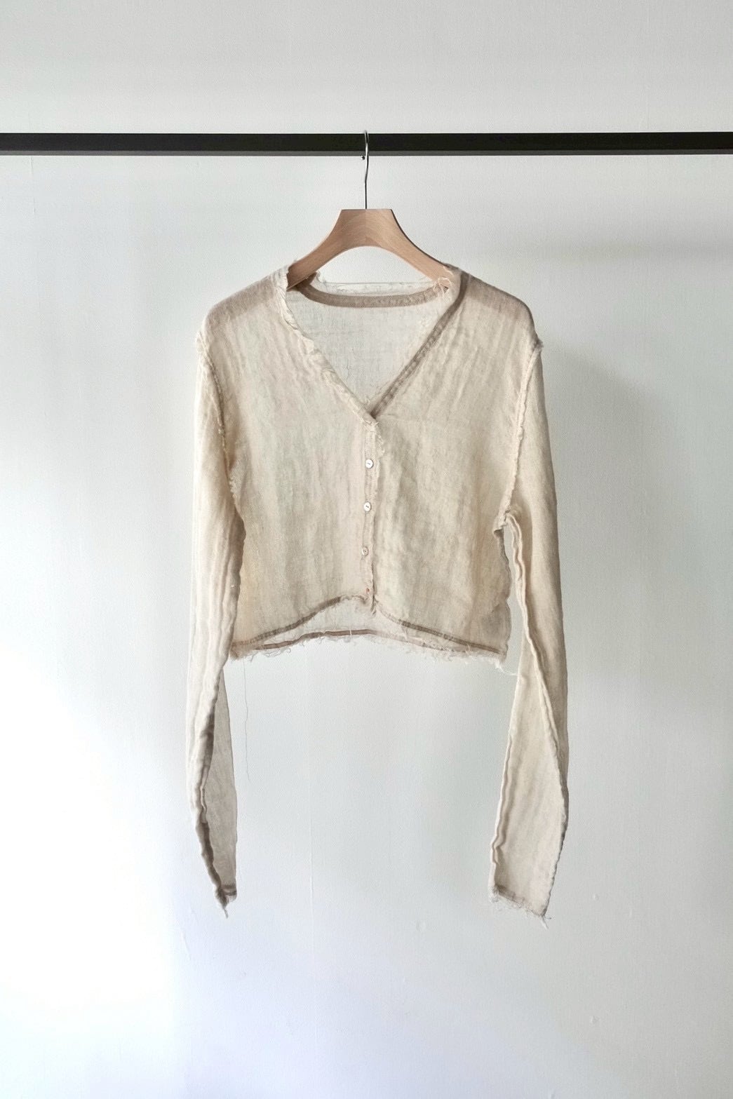襟ぐりや袖口、裾は断ち切りにした着丈が短めのカーディガン。