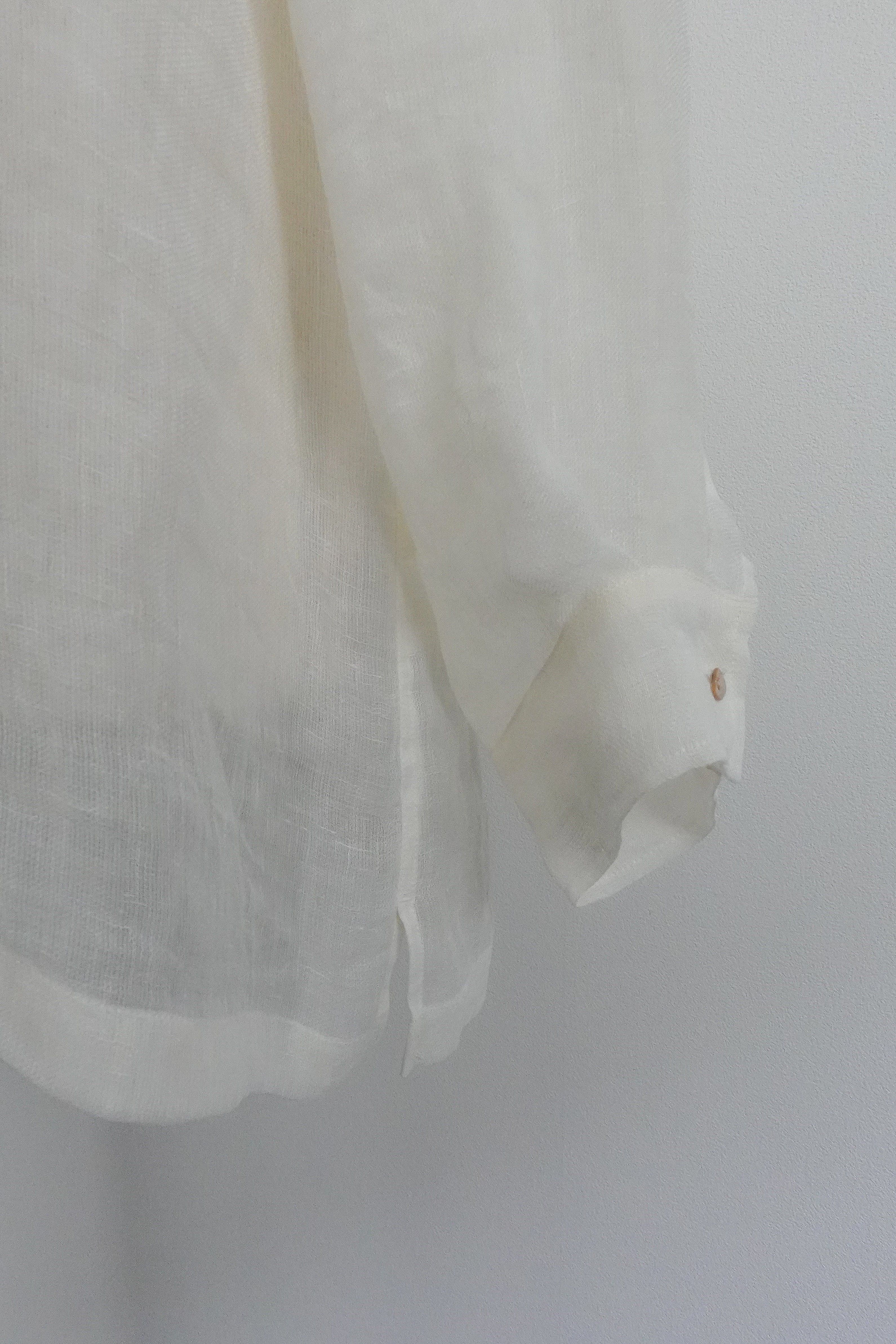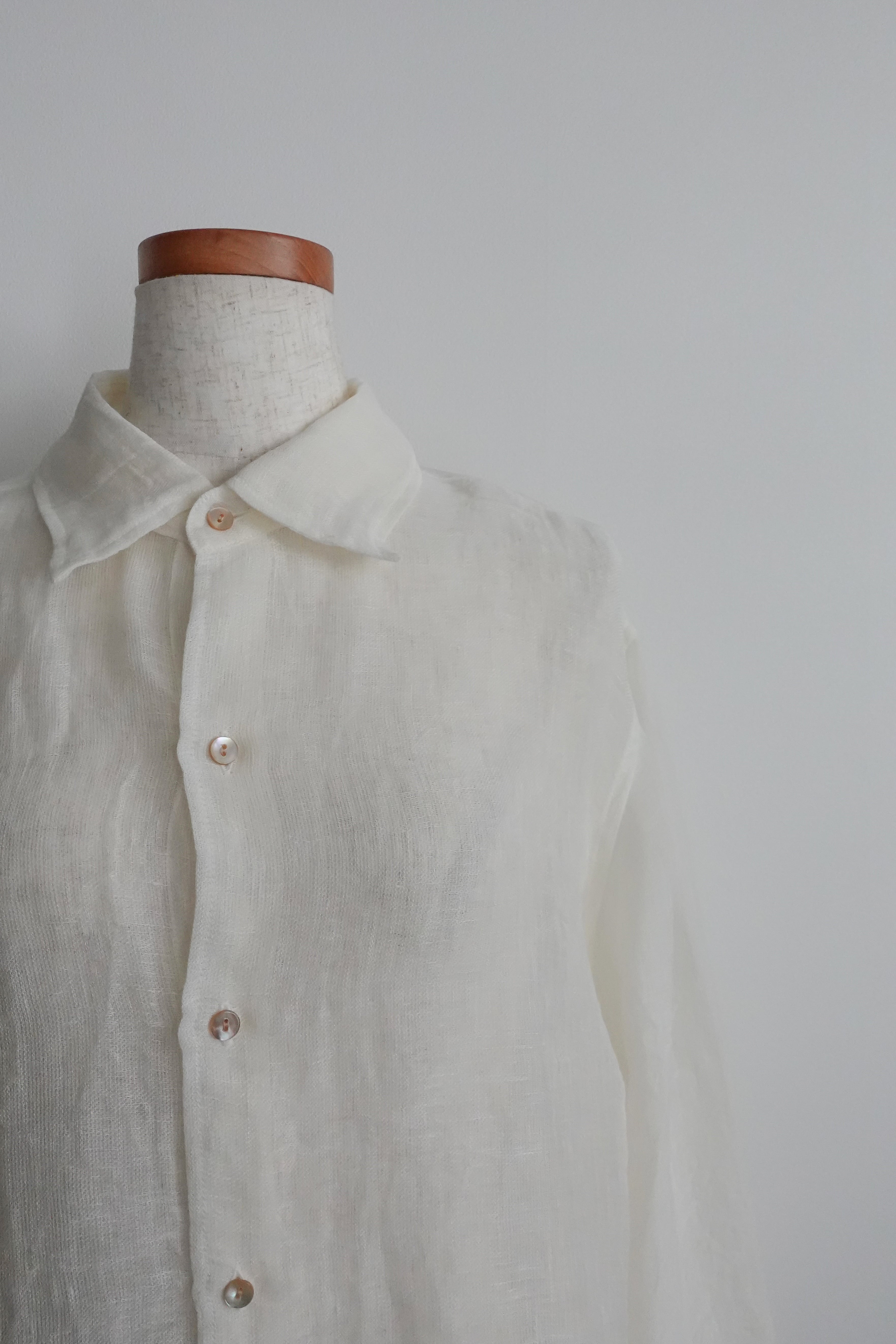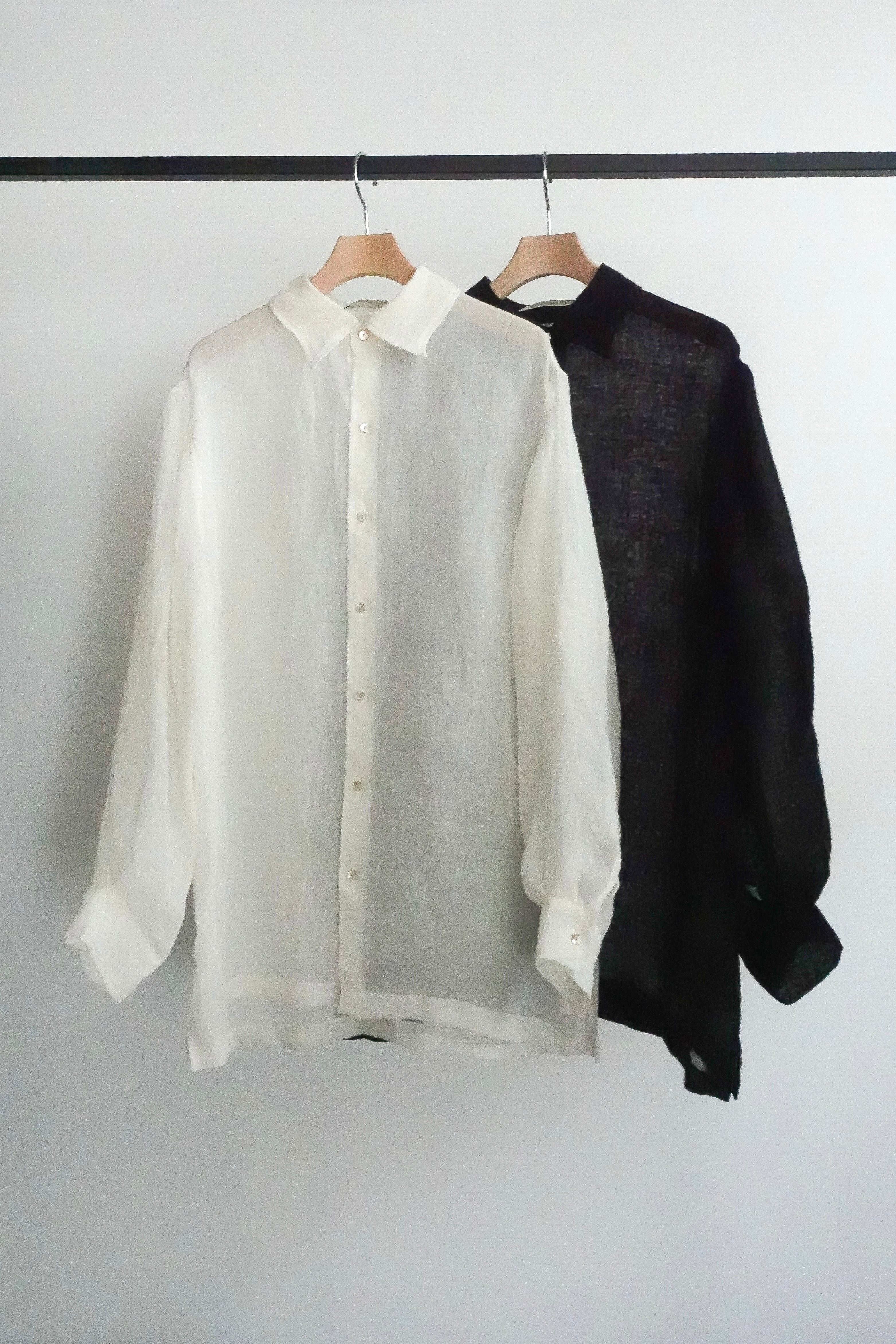 程よい透け感と、リネン生地の素材感は日本の猛暑も耐え抜く、涼を感じる肌障りの心地よさがあります。