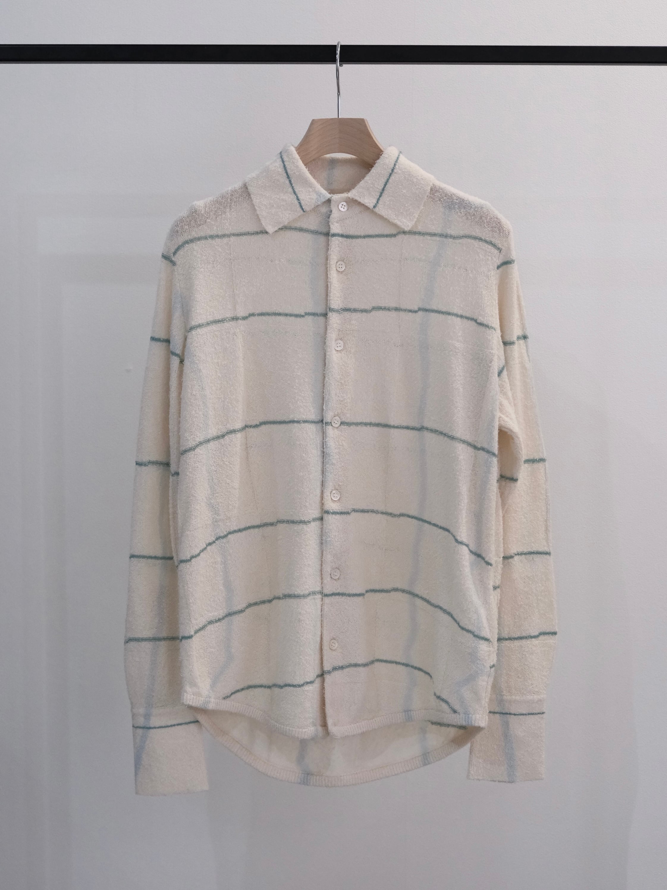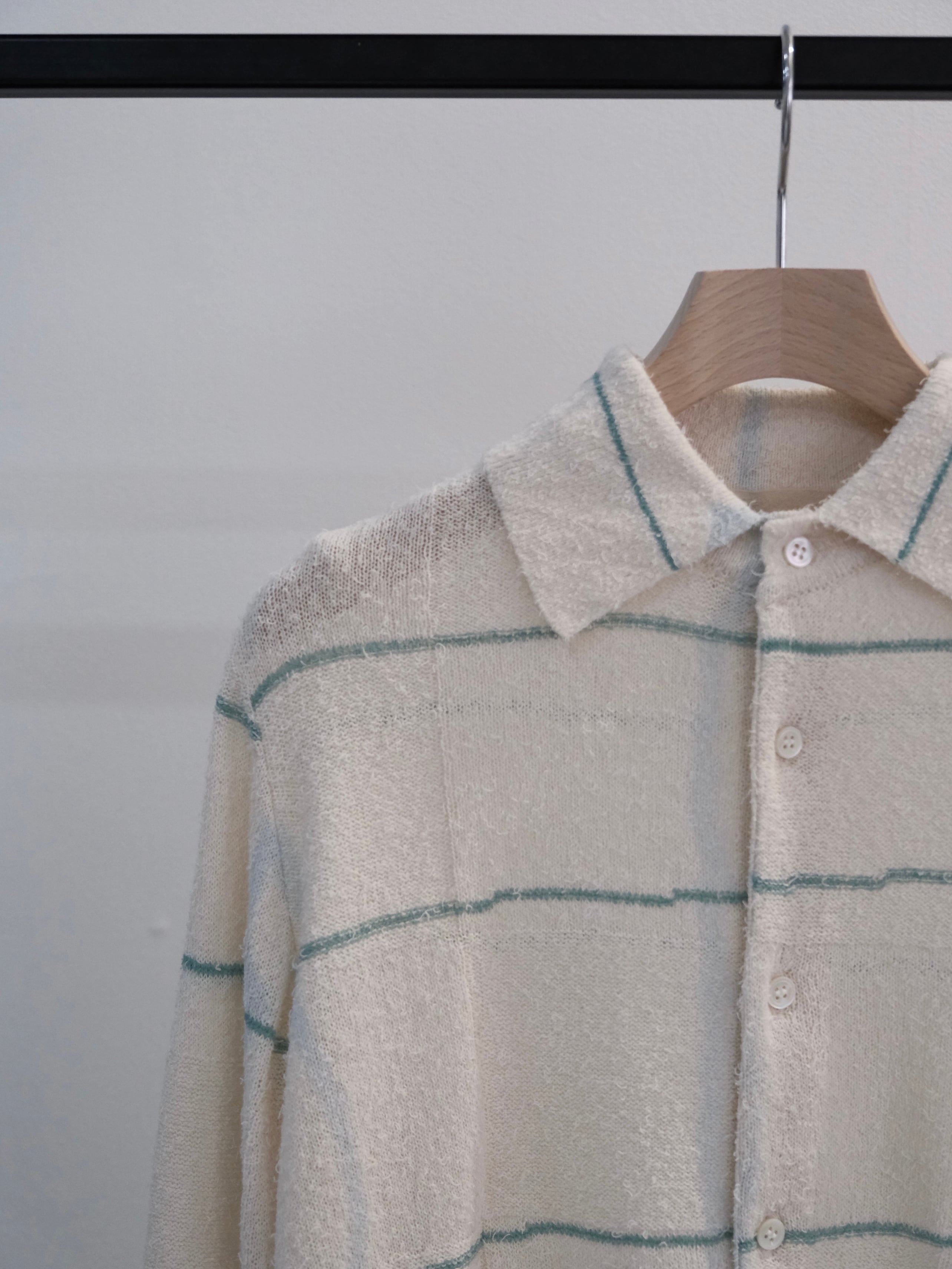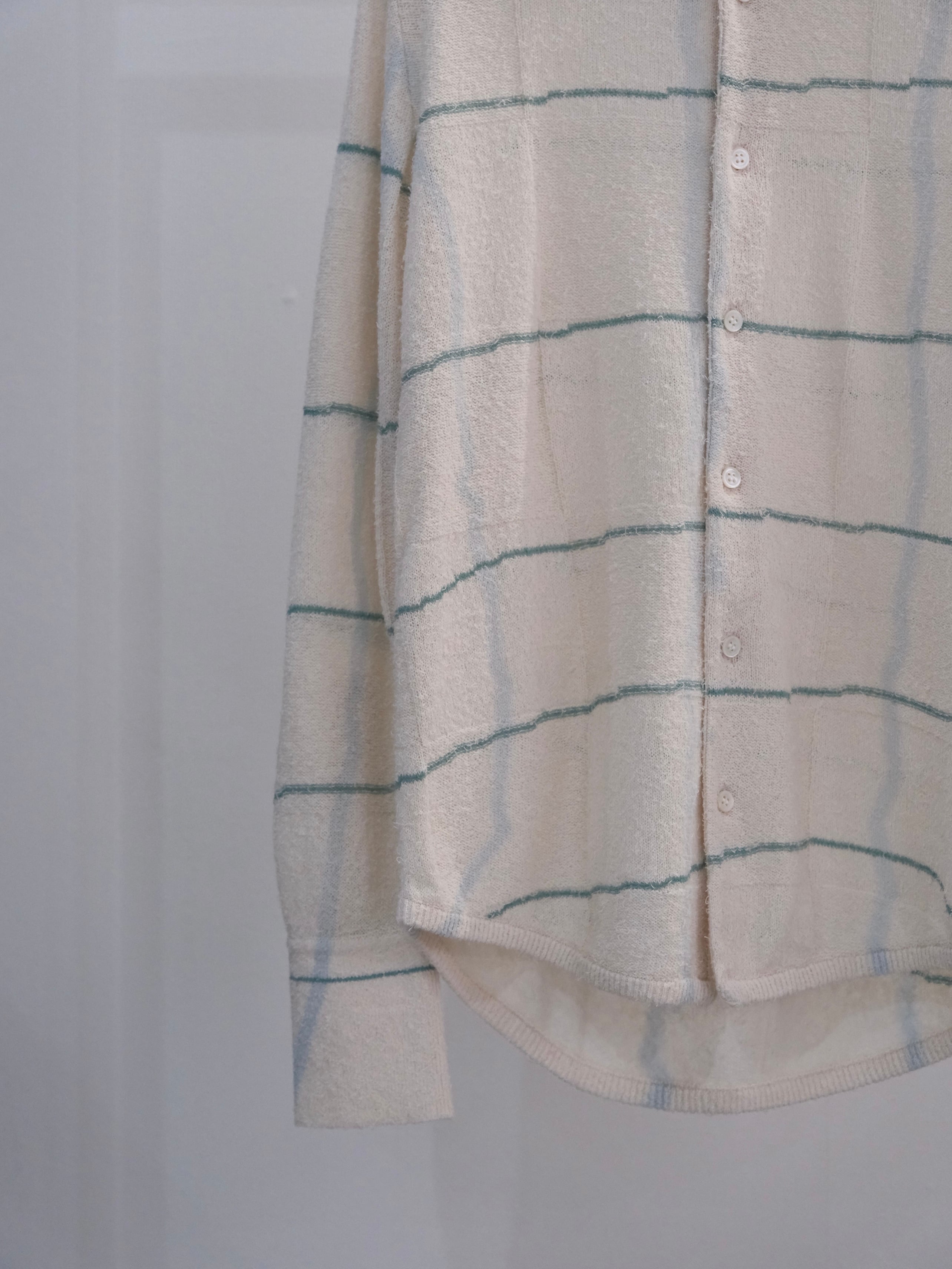 このシャツでは横のラインはニットで表現し、縦のラインは注染で表現。