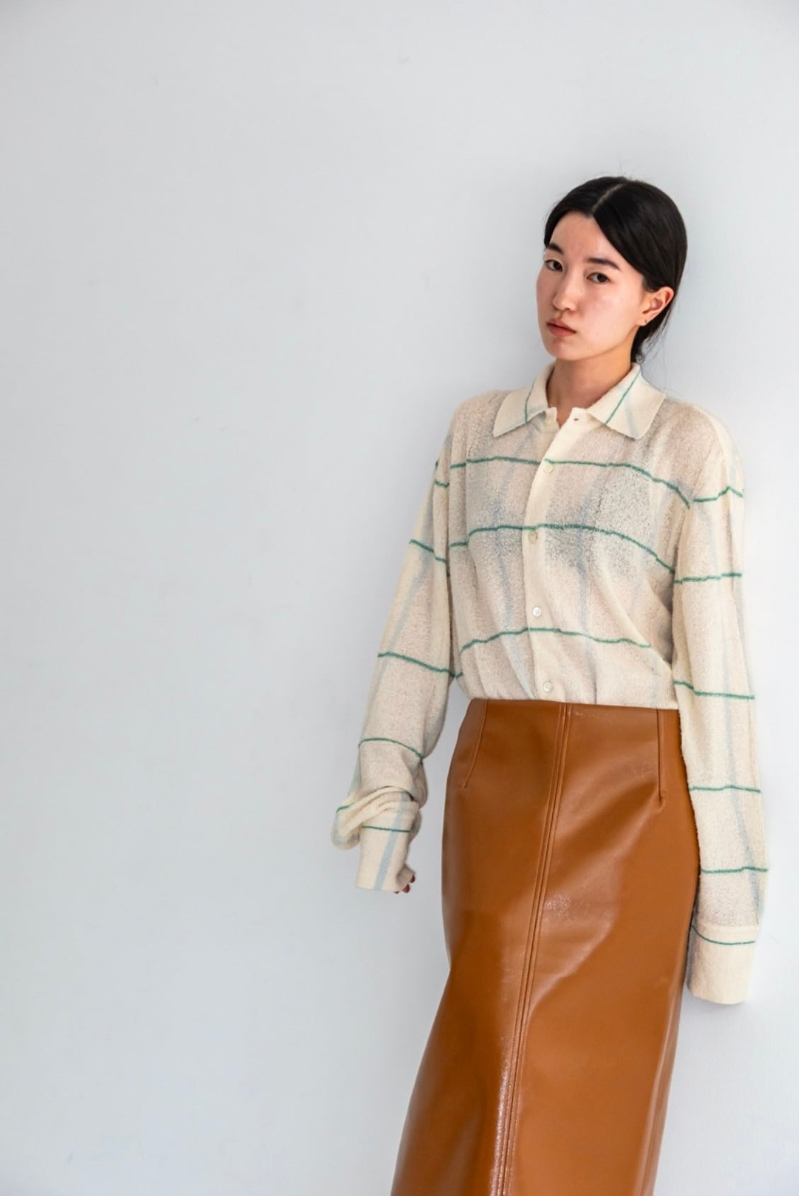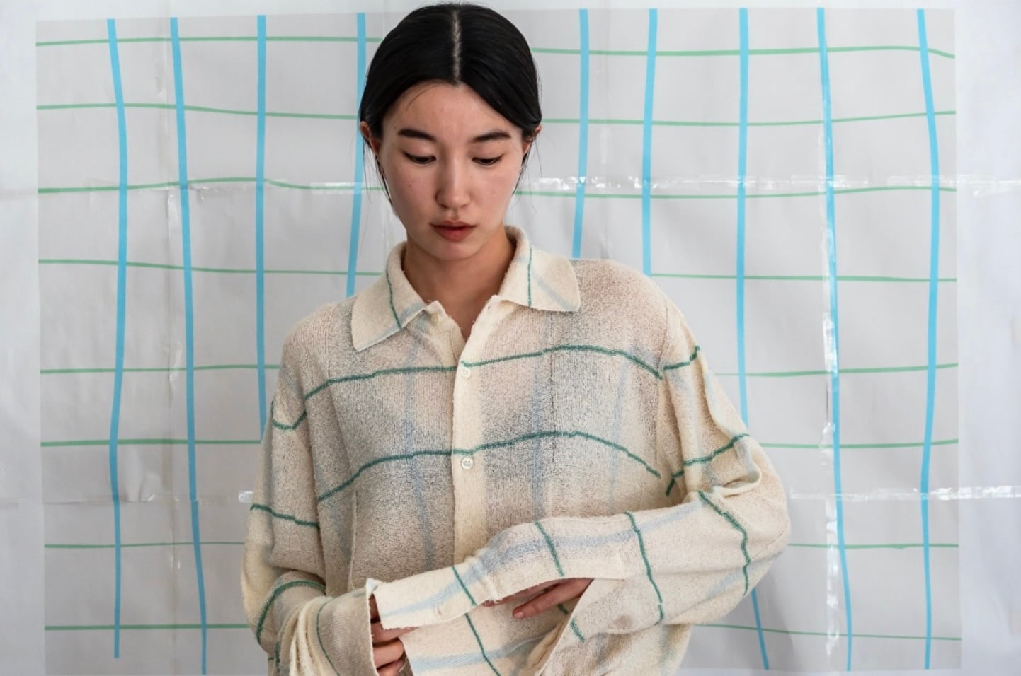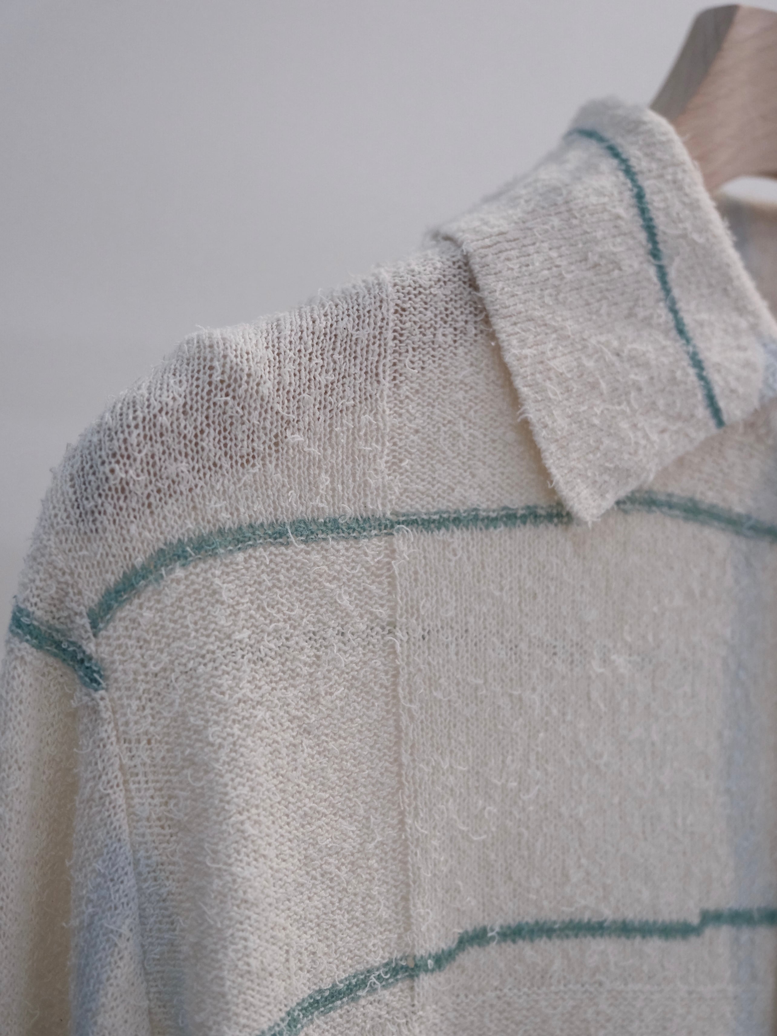 このシャツでは横のラインはニットで表現し、縦のラインは注染で表現。
