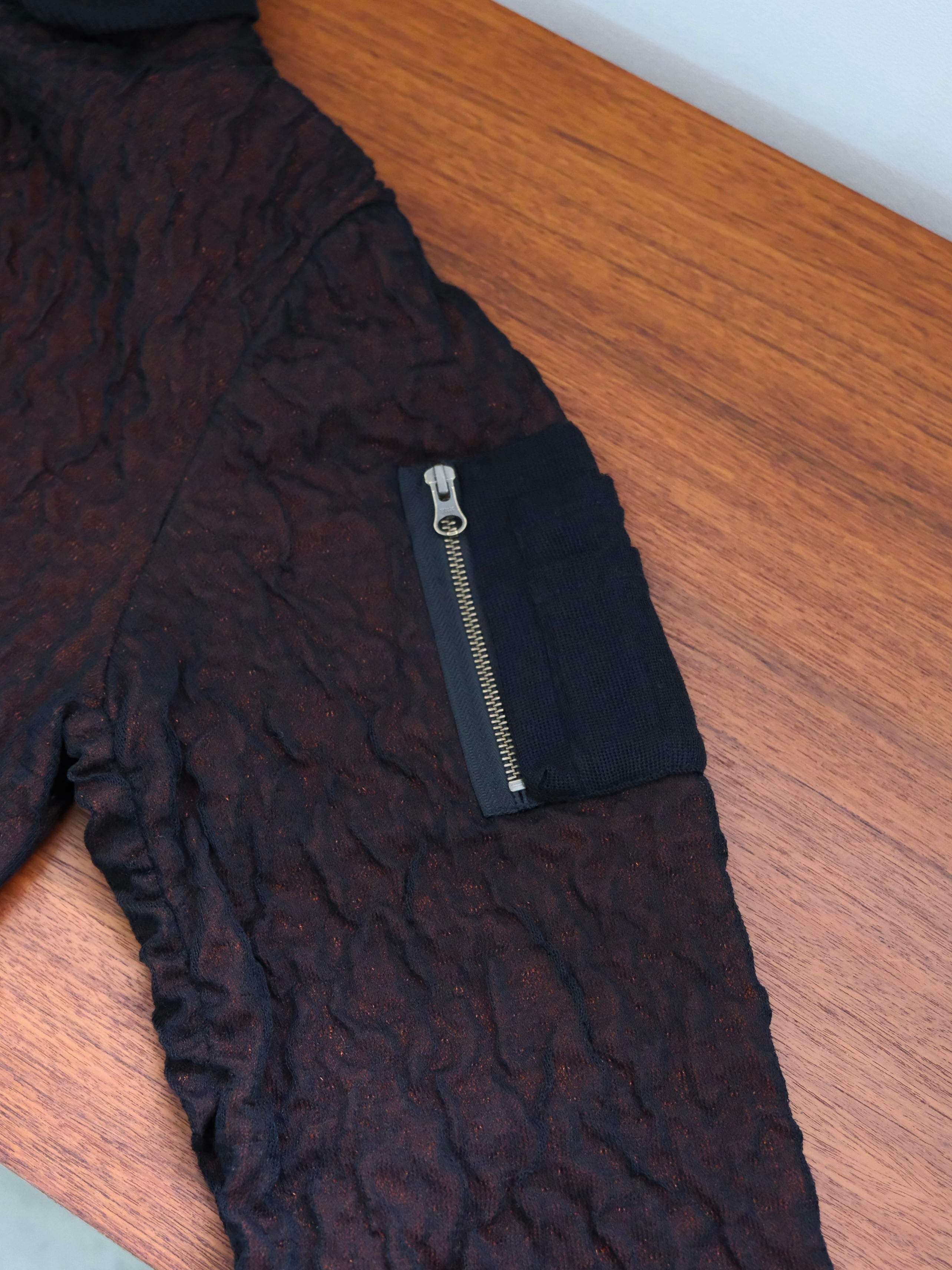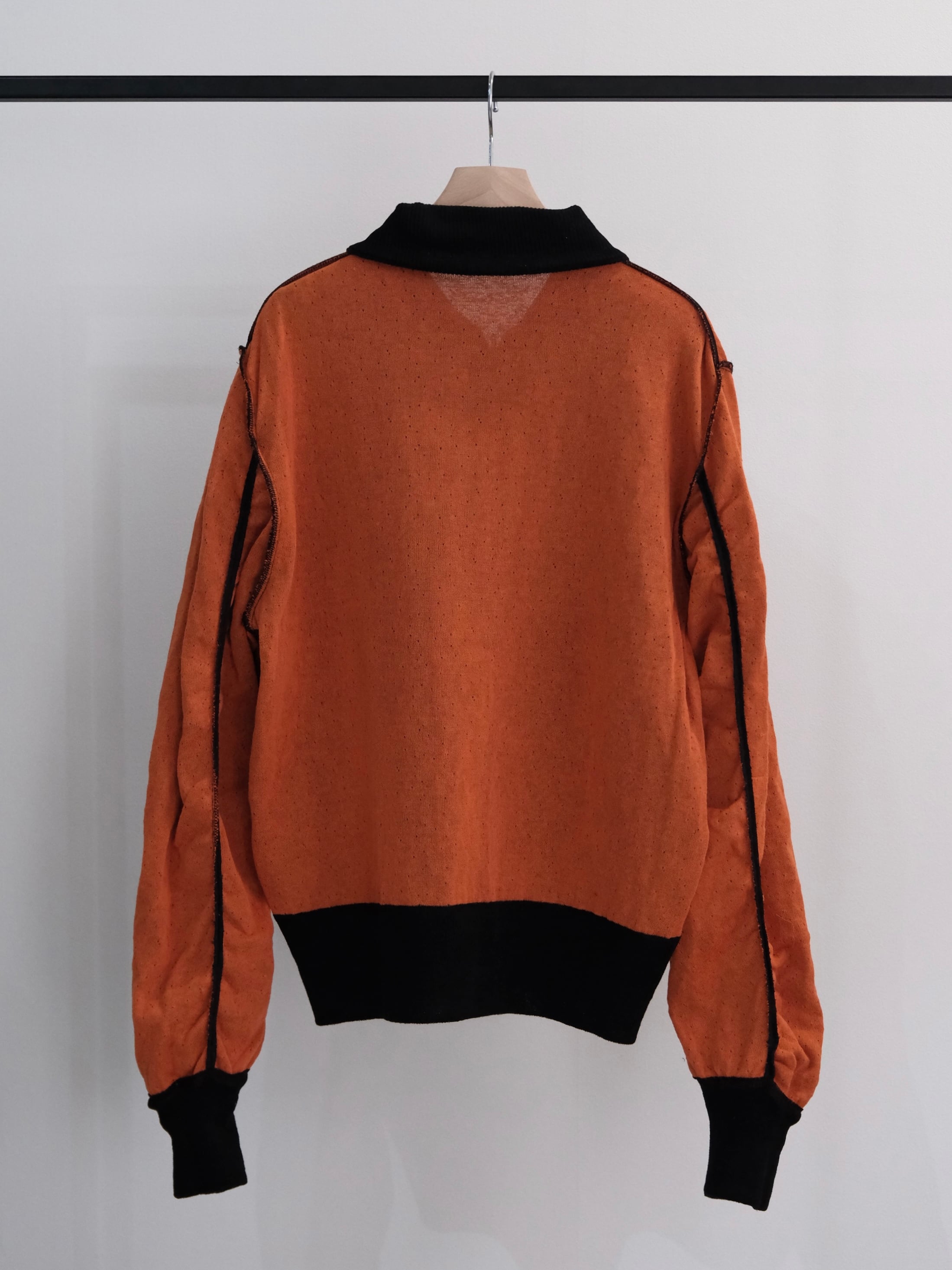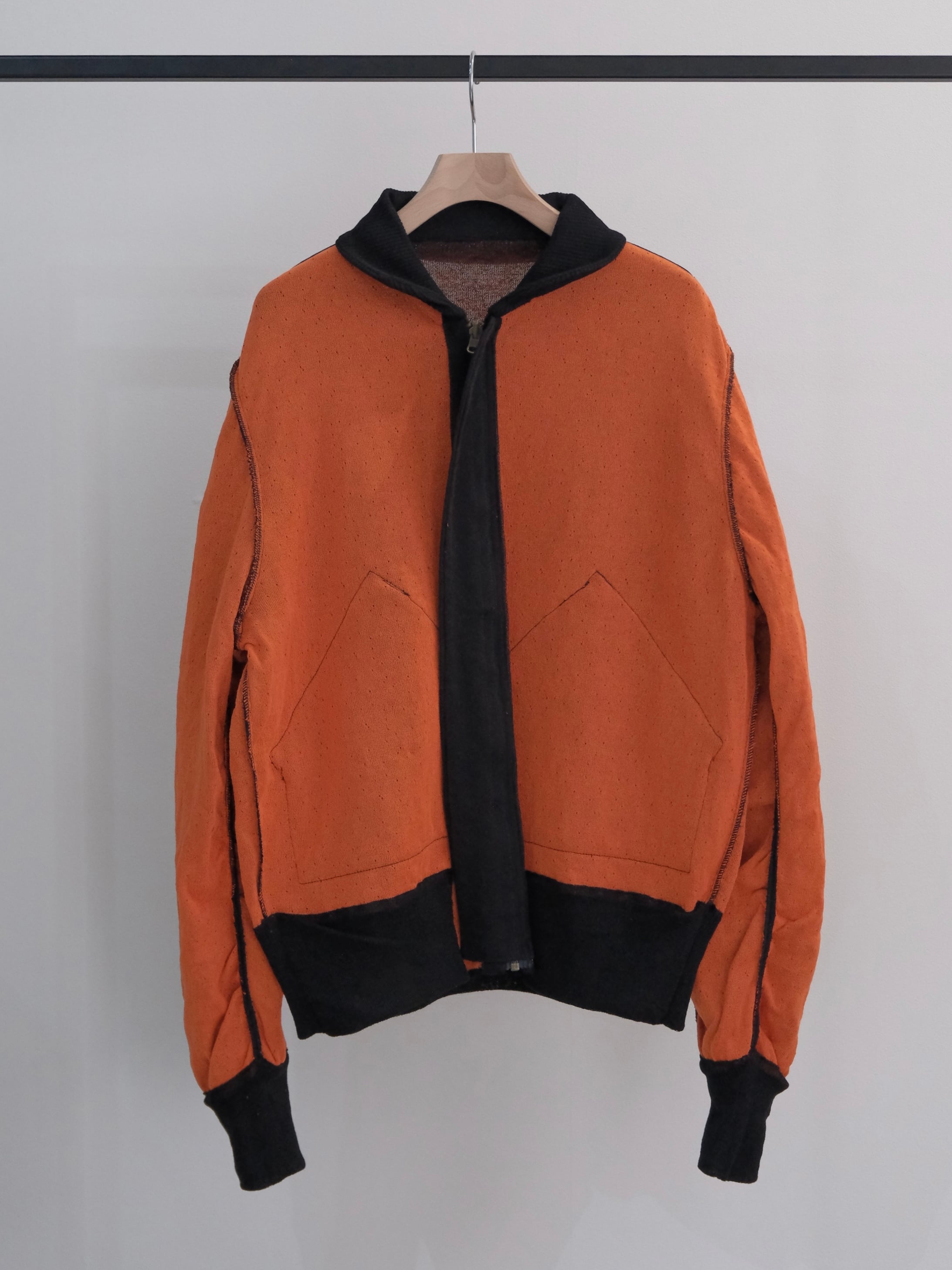 フライトジャケットは救出されるときに裏返して着ると目立つ様に裏地オレンジらしいので、このジャケットもリバーシブルのジップにしました。