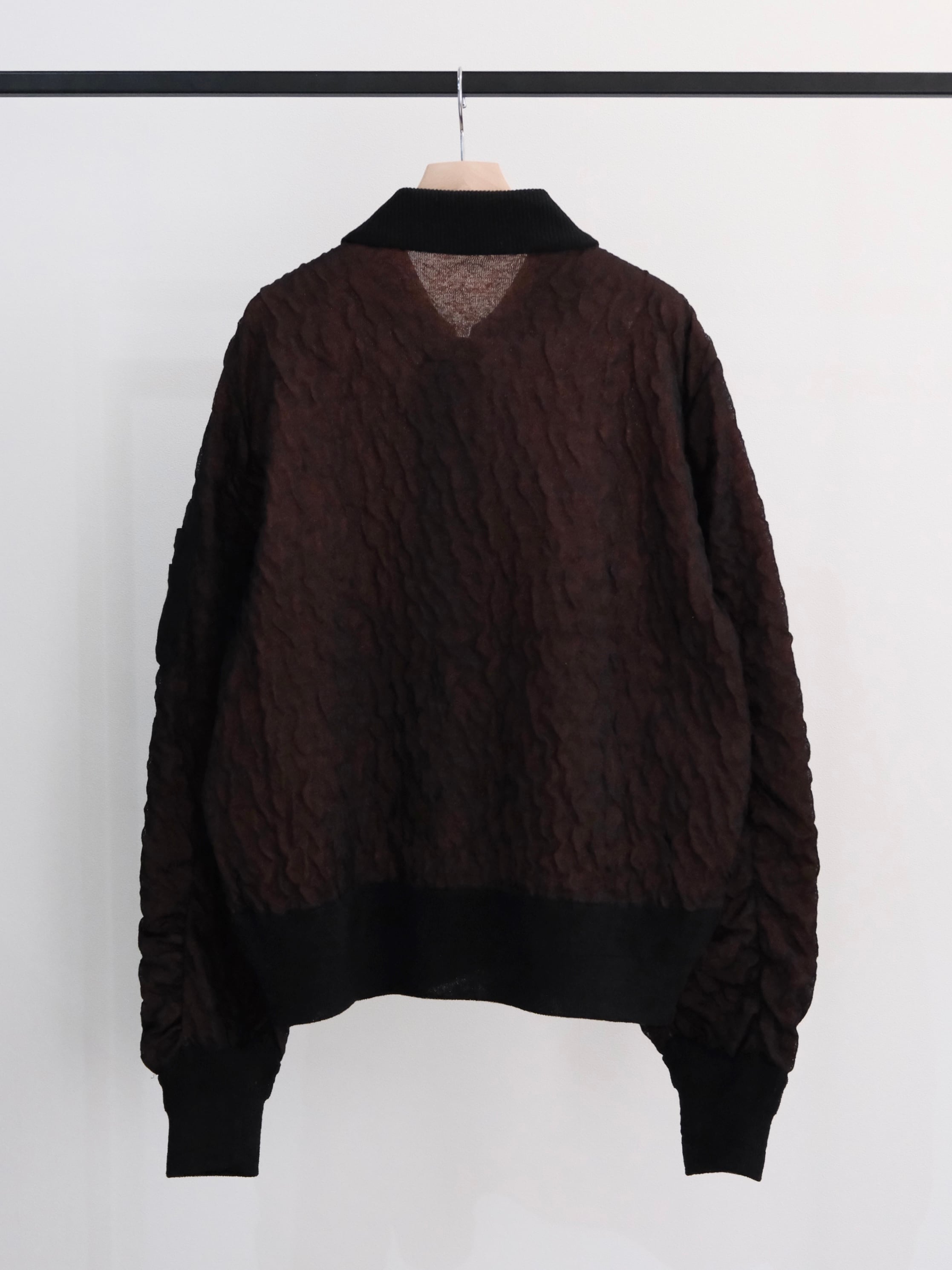 ニットでパッカリング(縫製のシワ)を表現するのは難しく編み地自体がパッカリングしている様な編み地を作り、パターン的にもパッカリング風が表現できる様なパターンにしていただきました。