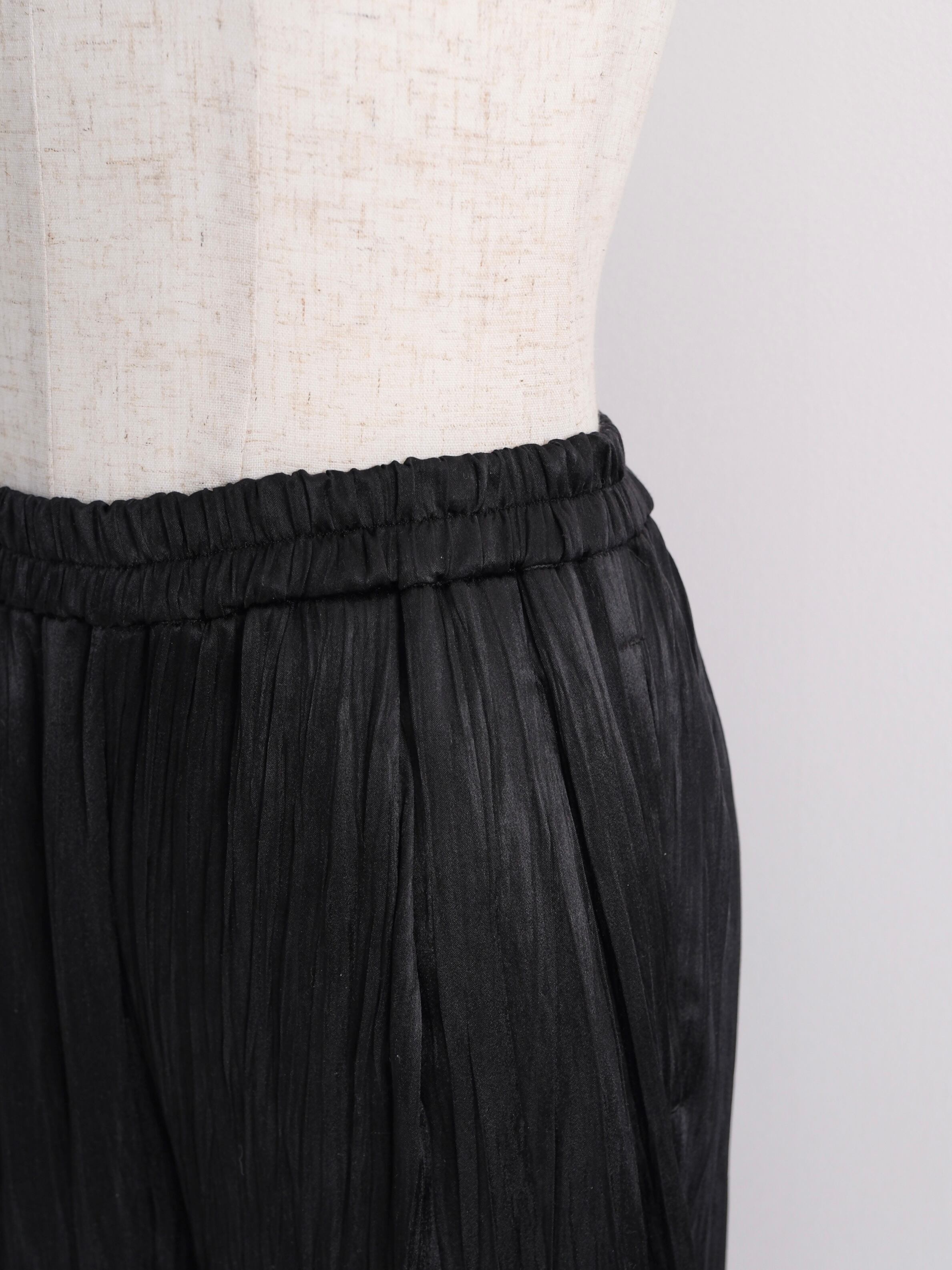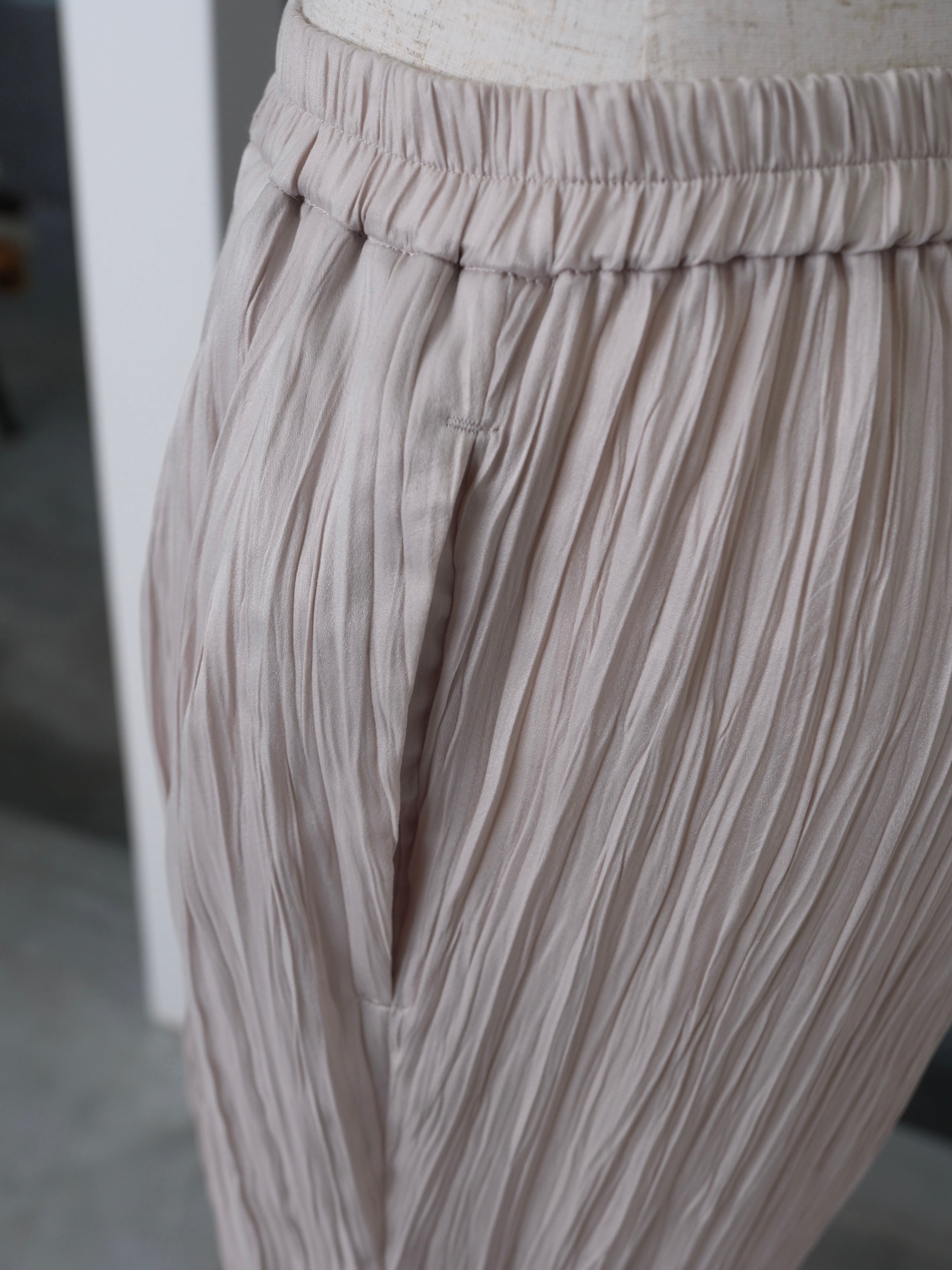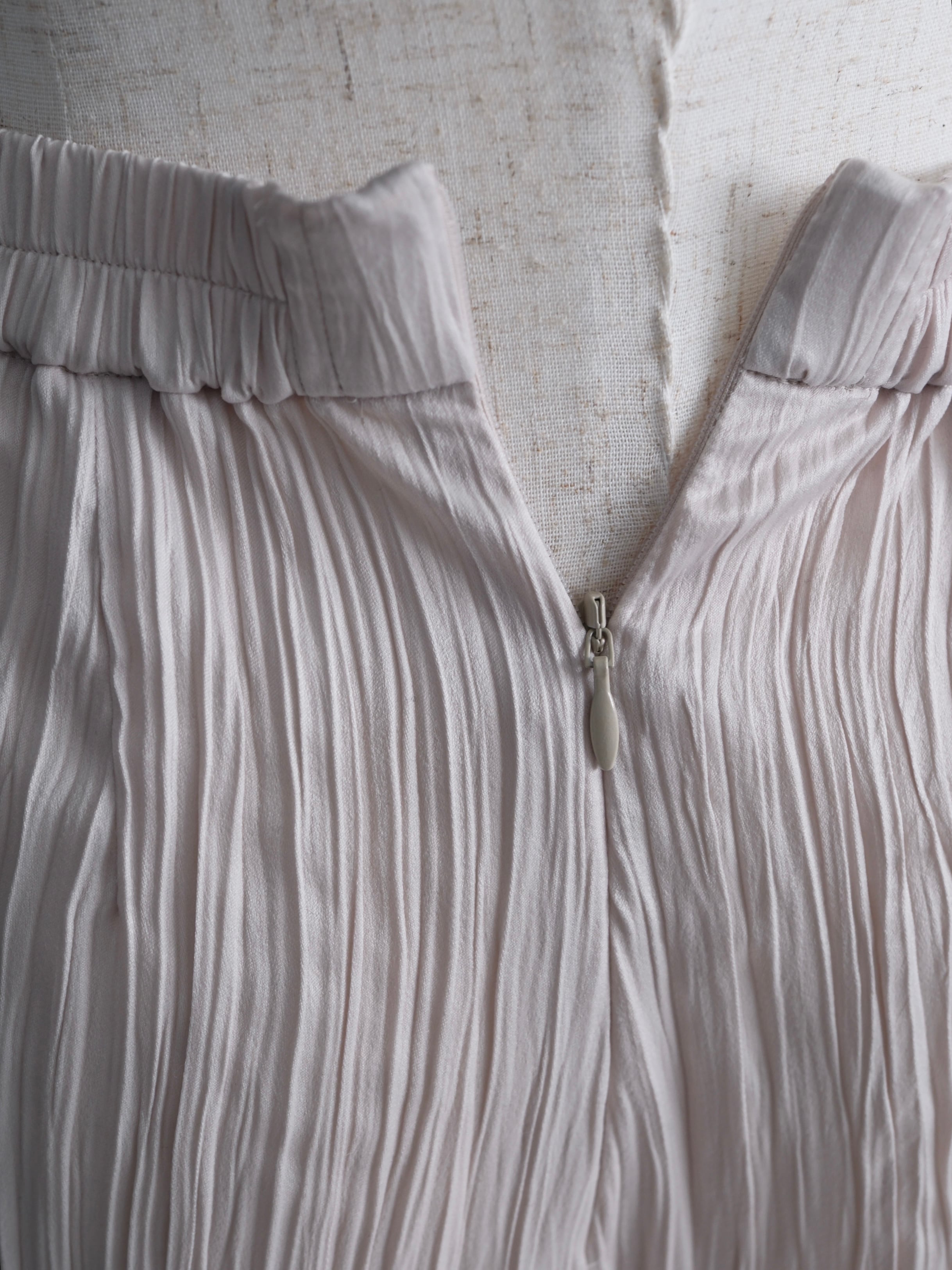 ・薄地で軽い、ツヤのあるポリエステルスエードにランダムなタテジワ(プリーツ加工)を施しました
