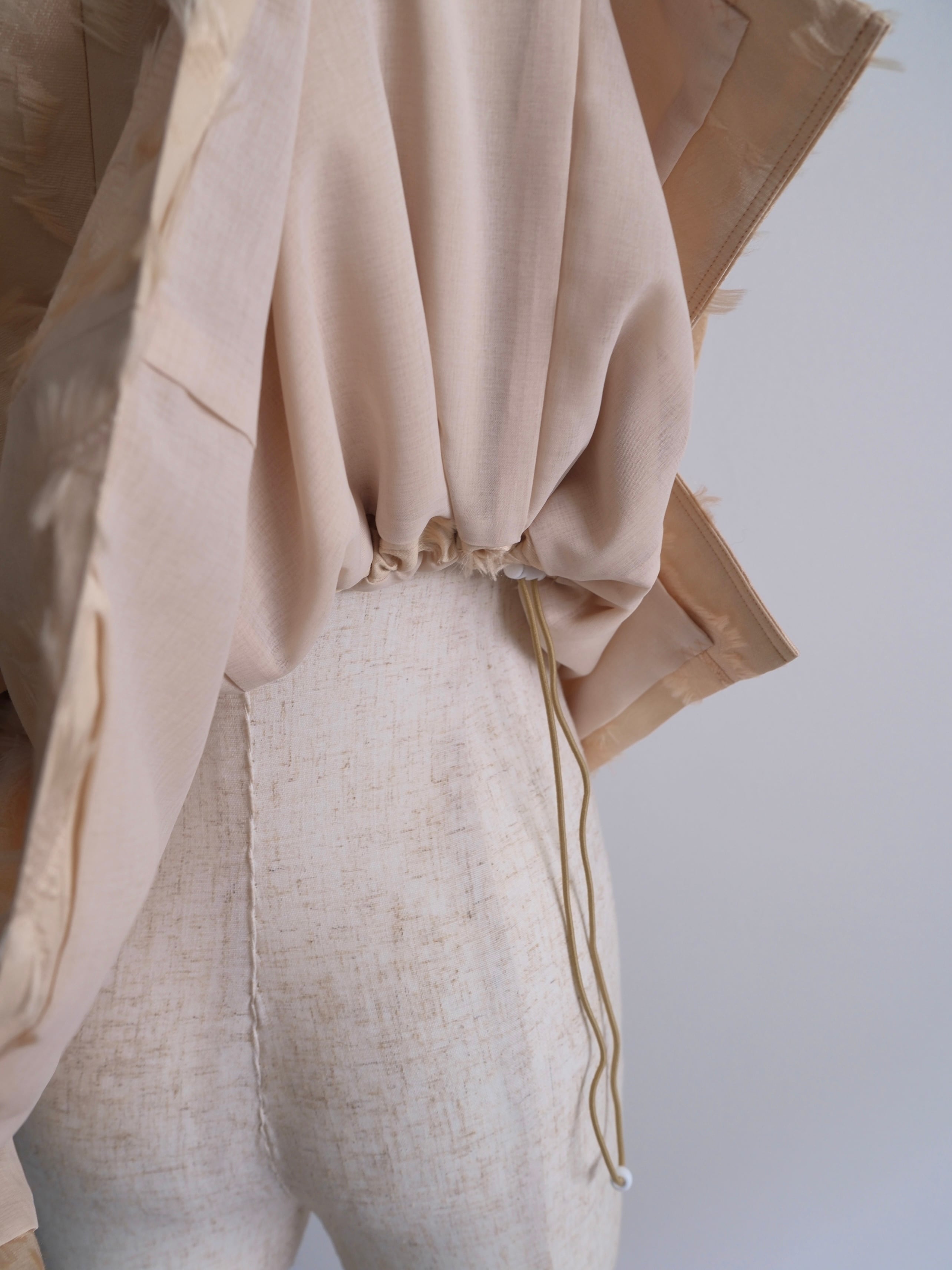 ・胸元の深めのV開きは、衿とラペルを取り払ったようなミニマルなノーカラーです