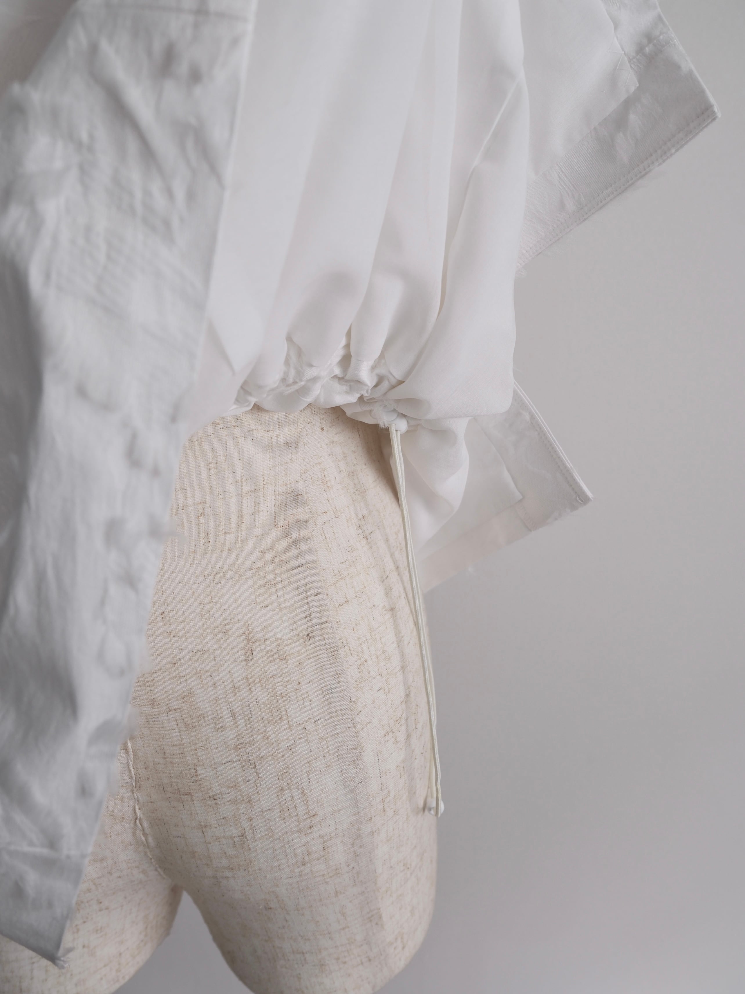 ・ウエスト下にゴムタイプのドローストリング内臓、伸縮性あるので脱ぎ着は問題ないです