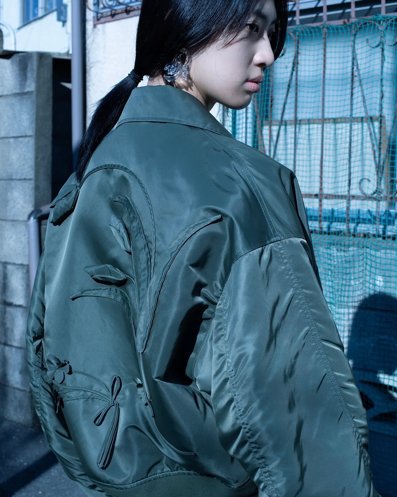 高密度のナイロンツイルを使用したしっかりと肉感のある生地を使用し、記憶の中の景色に広がるチューリップをバックスタイルに立体刺繍することで、ヴィンテージ感漂うミリタリースタイルの中に華やかな印象が広がる。今季のコレクションムードも伝えながら、中綿入りで防寒性も備えており、ゆったりとデイリー使いしやすい1着。