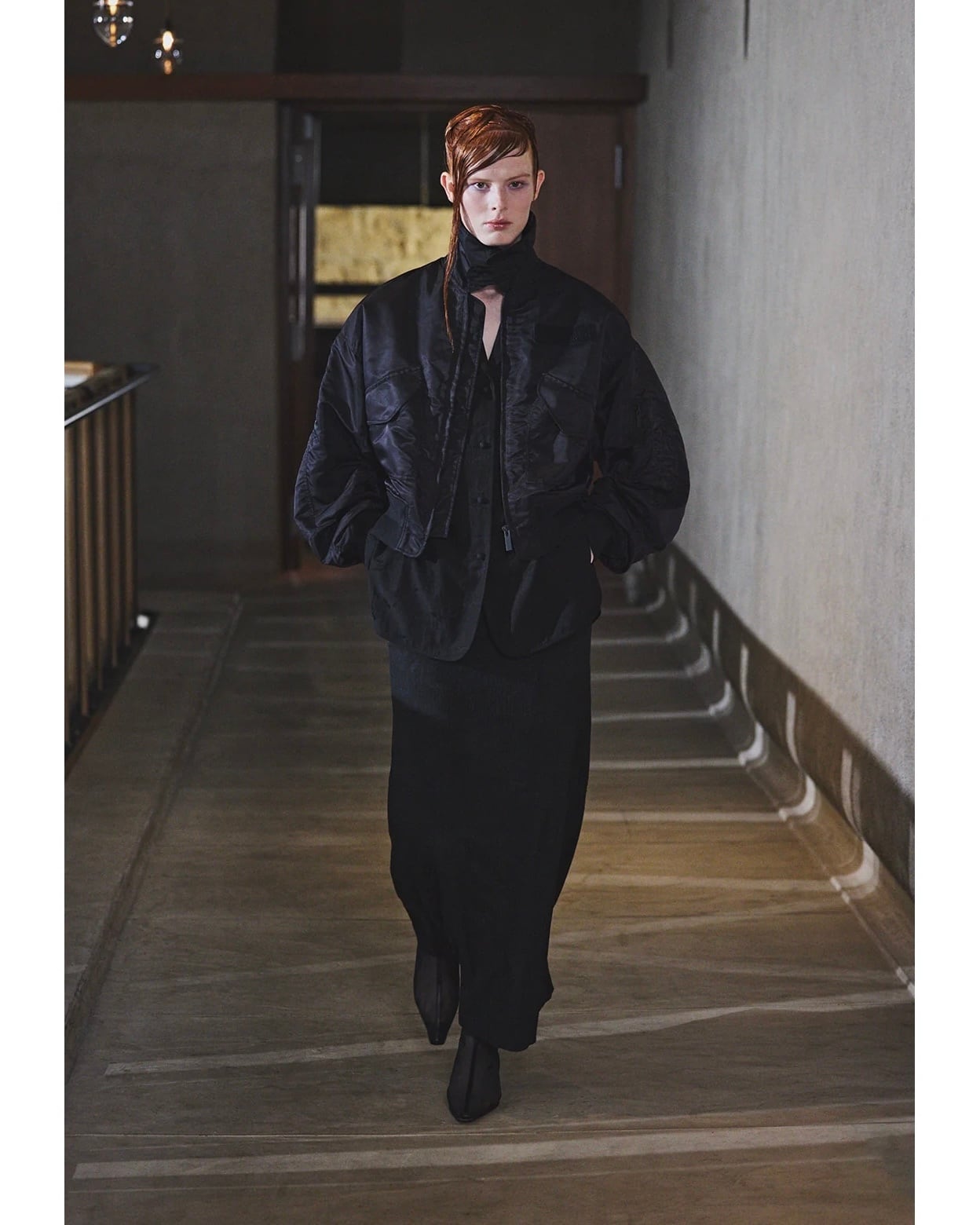 伝統的に着物や器の柄に用いられる唐子柄と草木柄をさなざまな組織を用いて表現した生地は、落ち着いた光沢とコットンの柔らかな風合いを感じさせる。ゆったりとしたシルエットに、抜け感のある襟元が首まわりをすっきりとみせる。前後差のある着丈はヒップ周りをカバーし、カジュアルからエレガントまで幅広い着こなしを可能にする1着。
