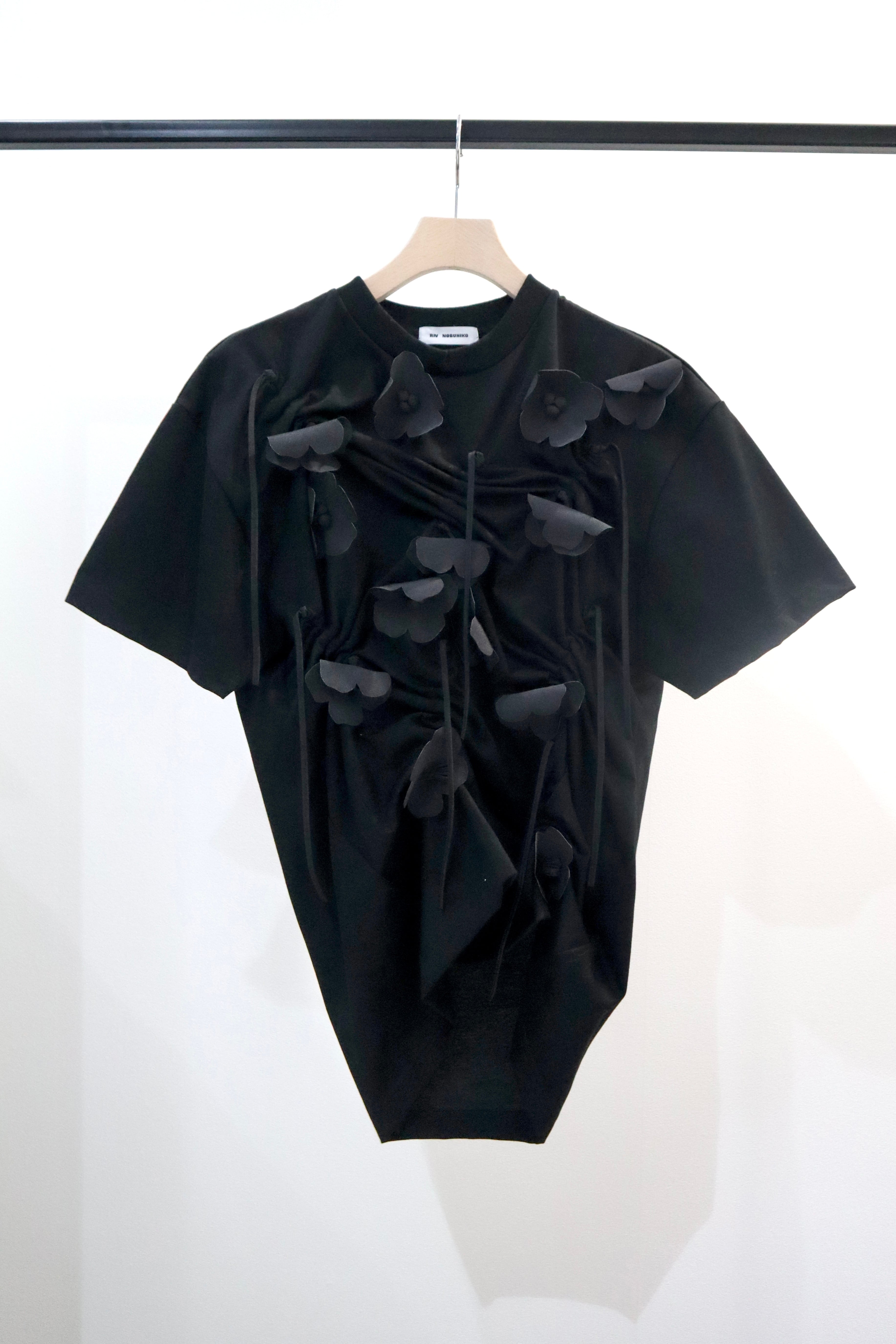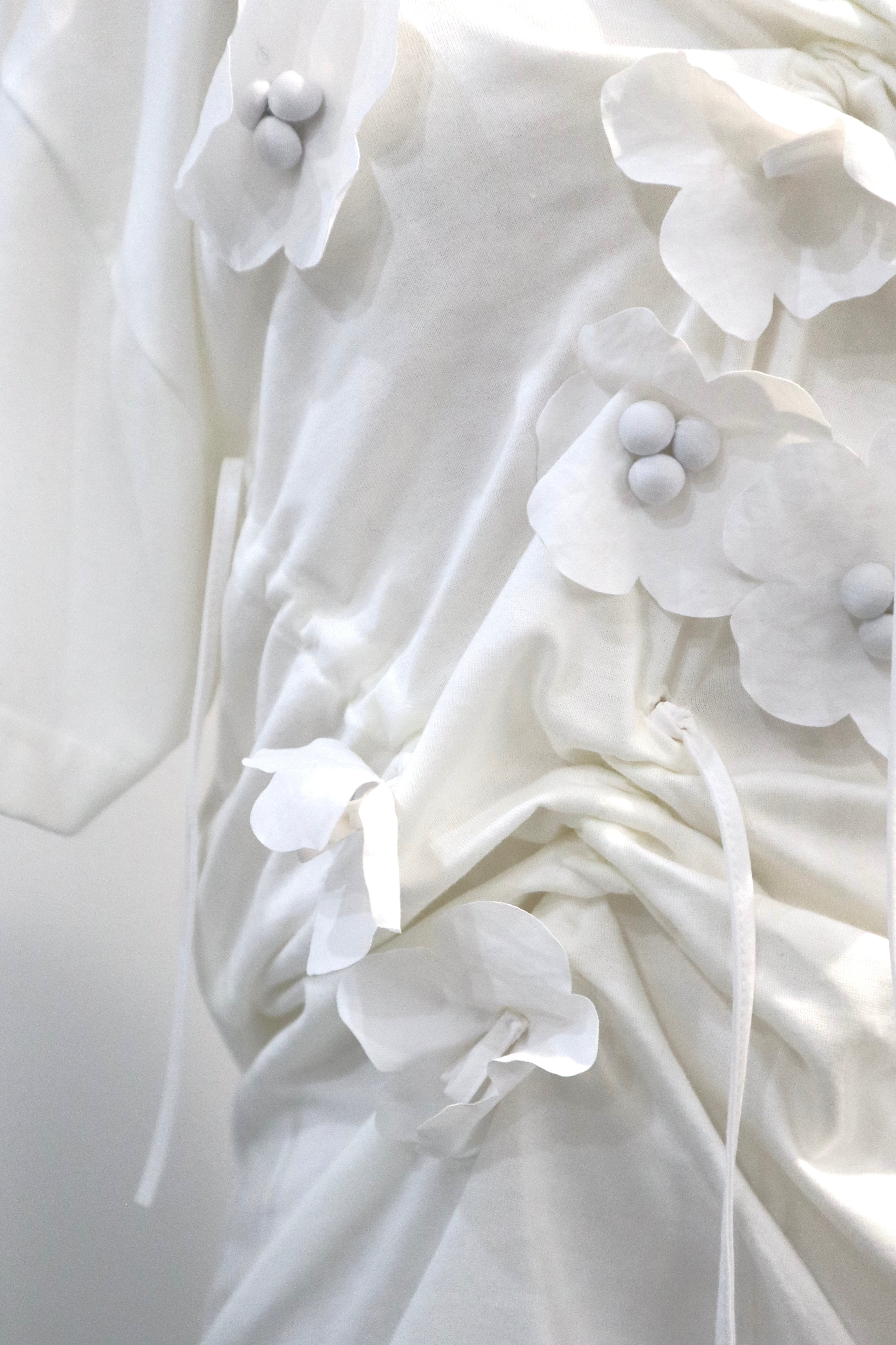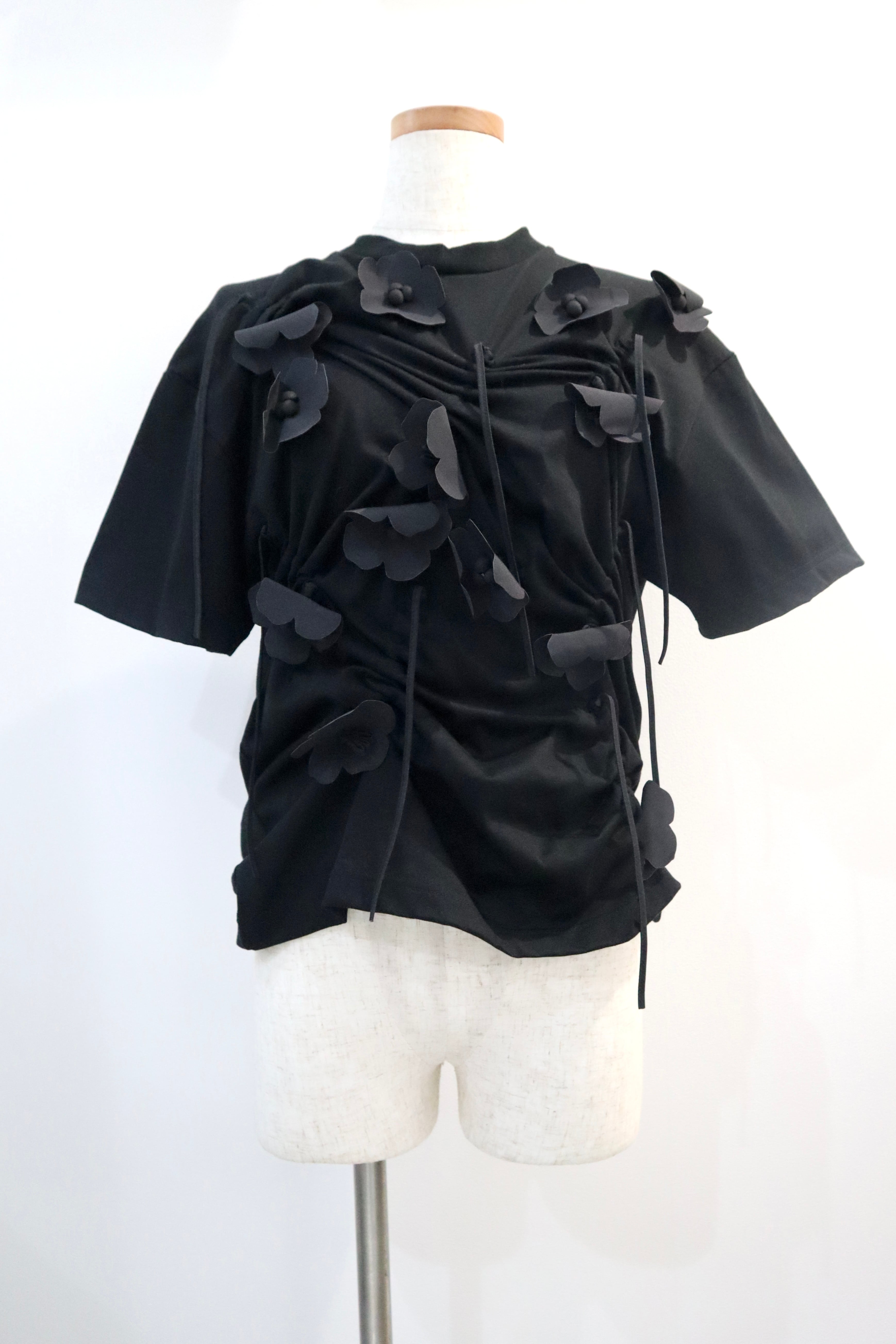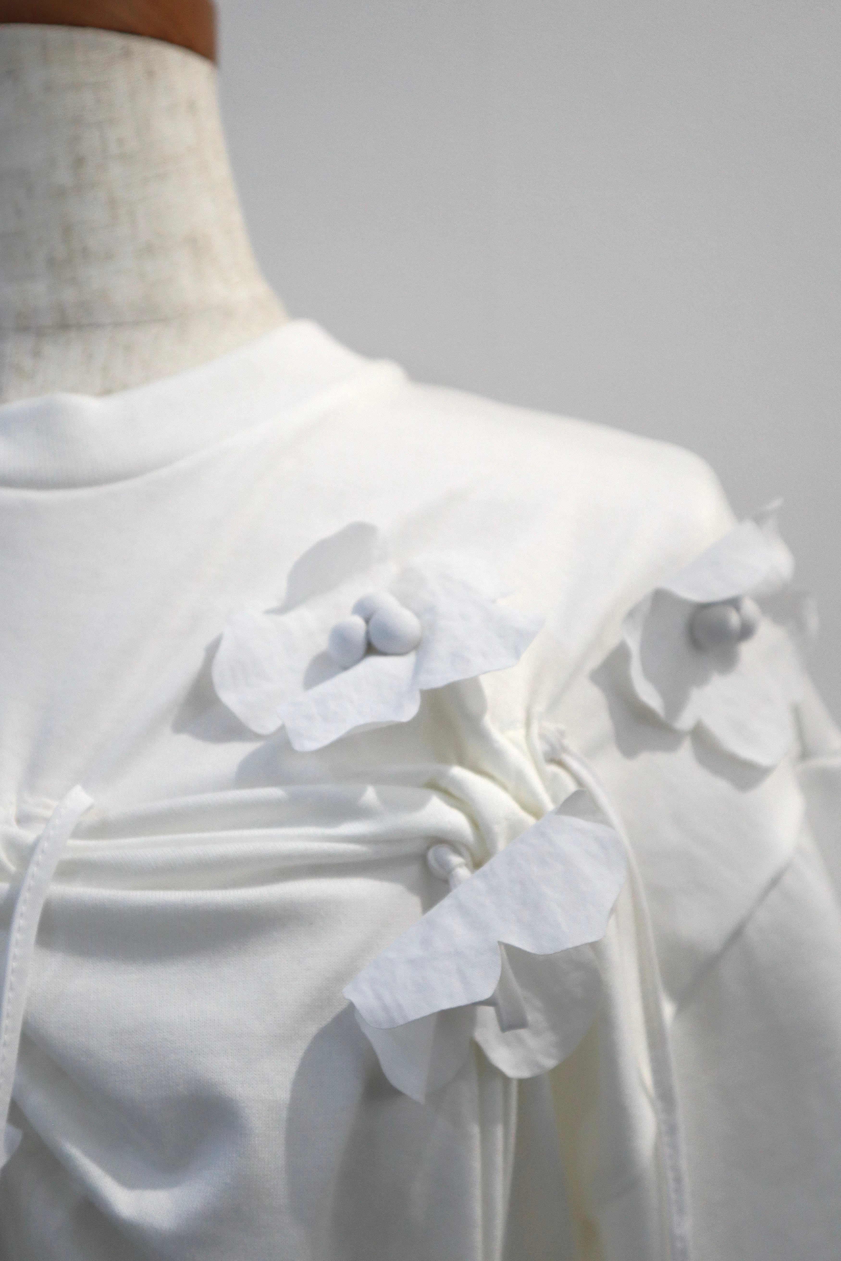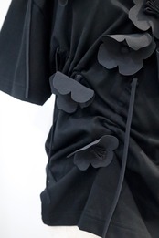ややボクシー調シルエットのクラシックなTシャツから、花が咲き誇るようにパッチが散りばめられているTシャツになります。茎を模したストラップがギャザーを作り、そこから生まれる歪みがコンテンポラリーでありながらフェミニンな印象のデザインになっております。