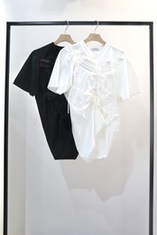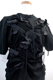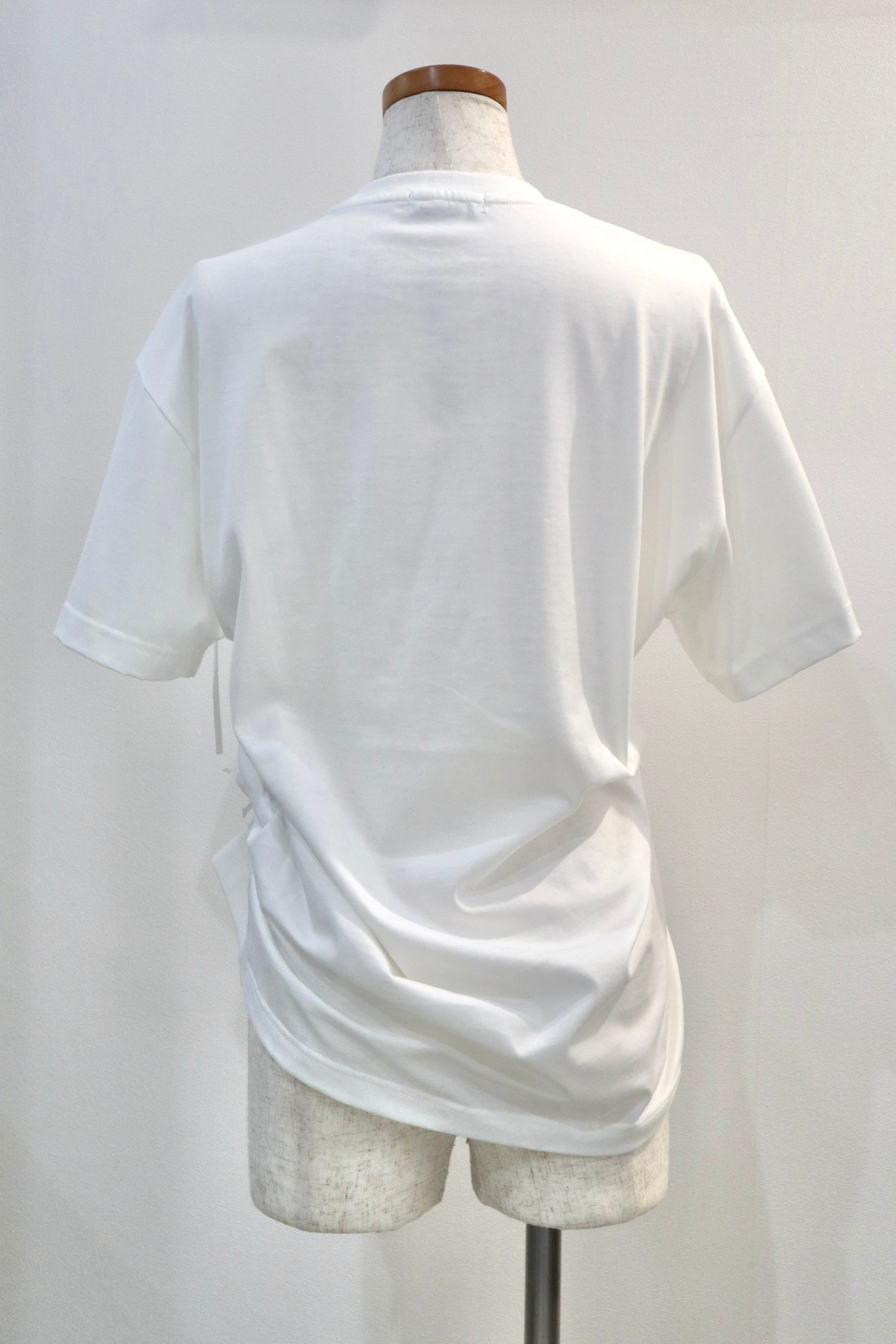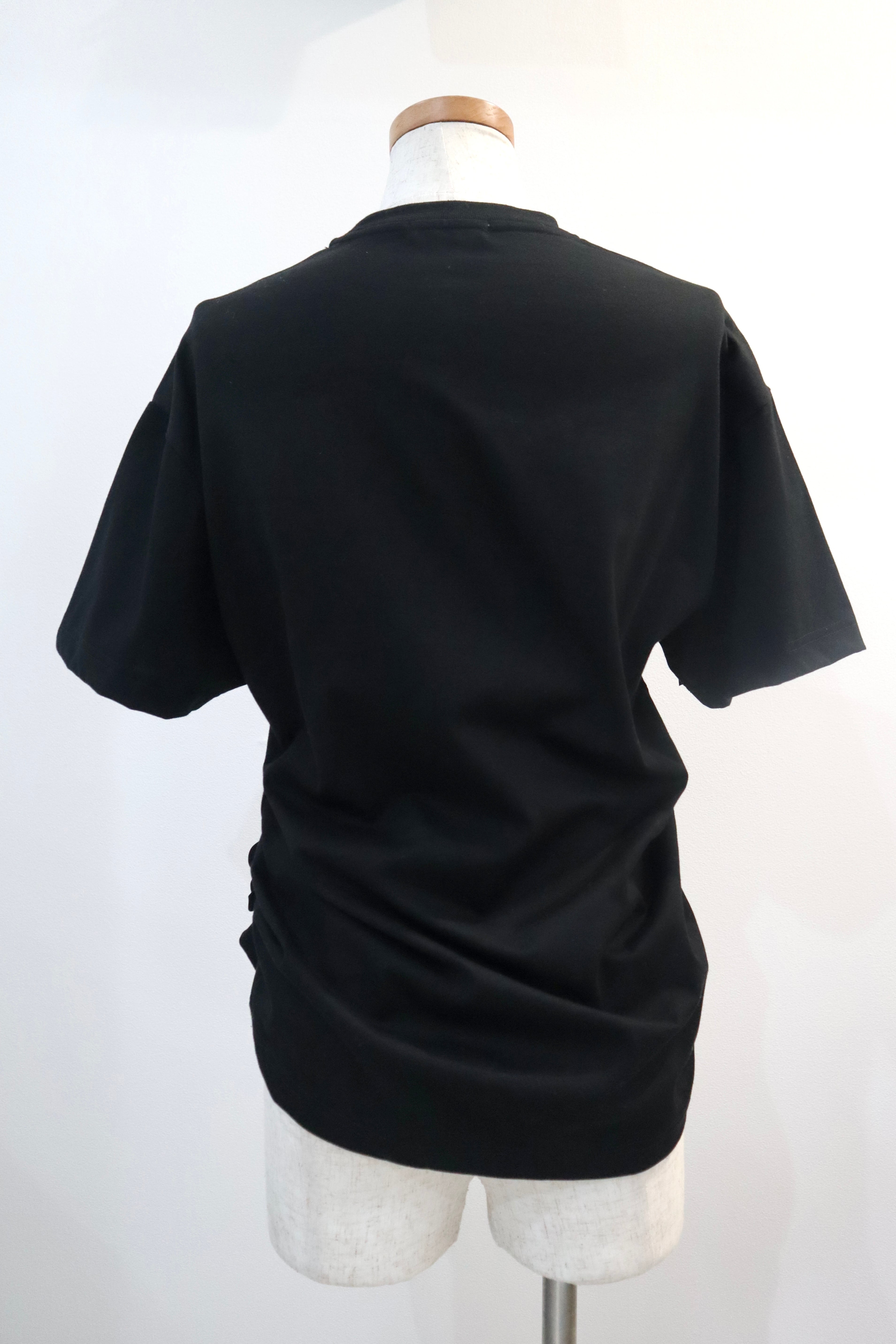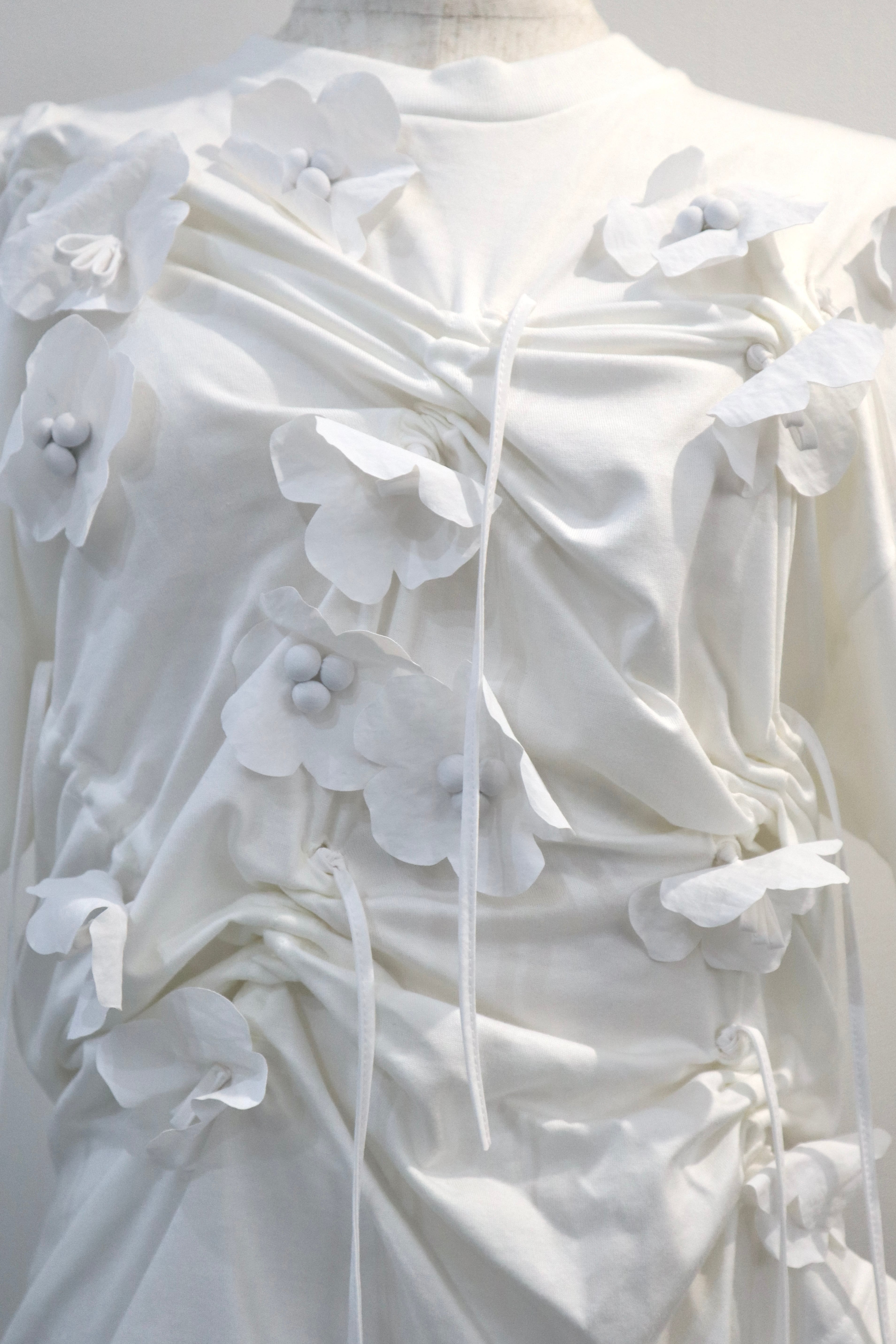 ややボクシー調シルエットのクラシックなTシャツから、花が咲き誇るようにパッチが散りばめられているTシャツになります。茎を模したストラップがギャザーを作り、そこから生まれる歪みがコンテンポラリーでありながらフェミニンな印象のデザインになっております。