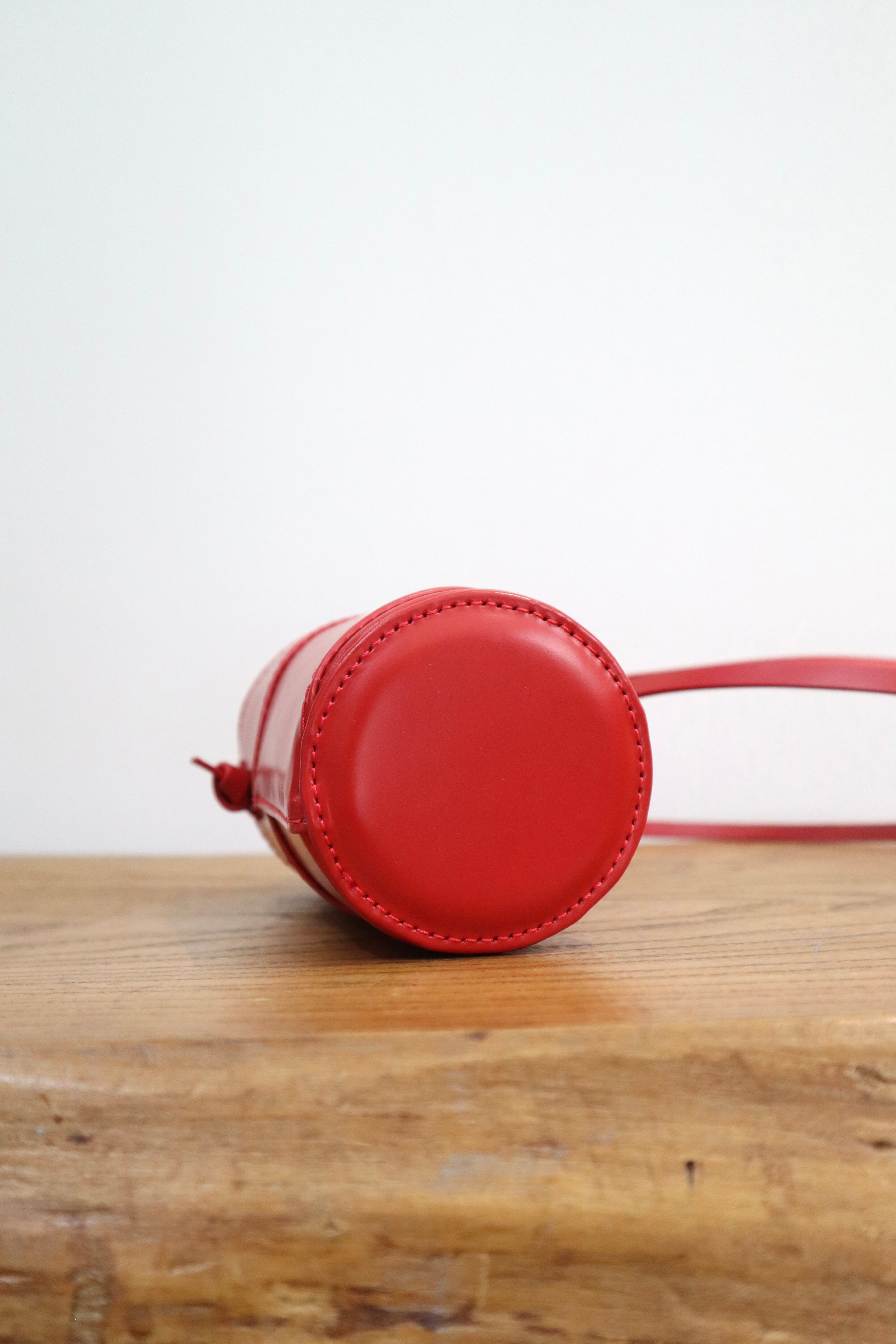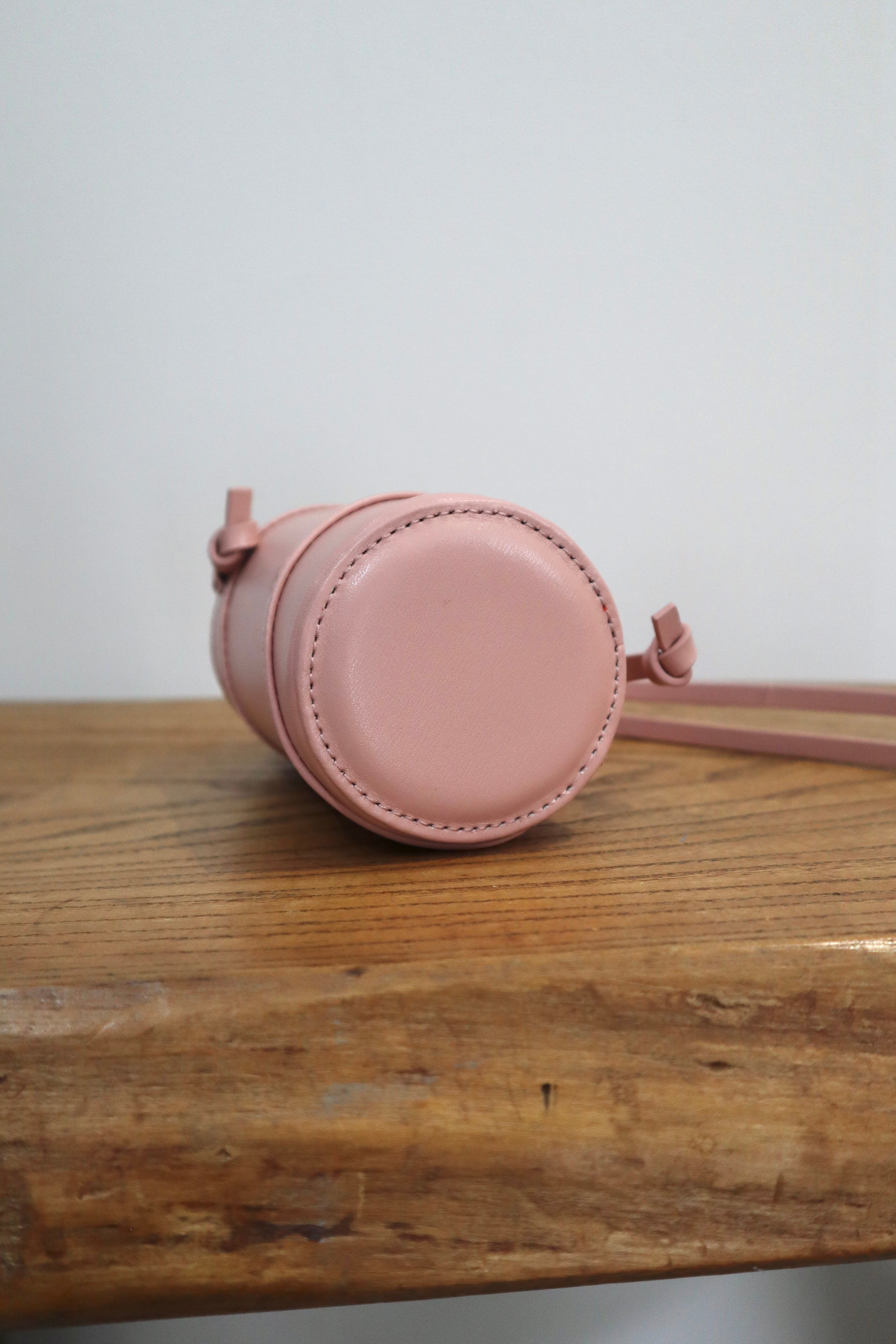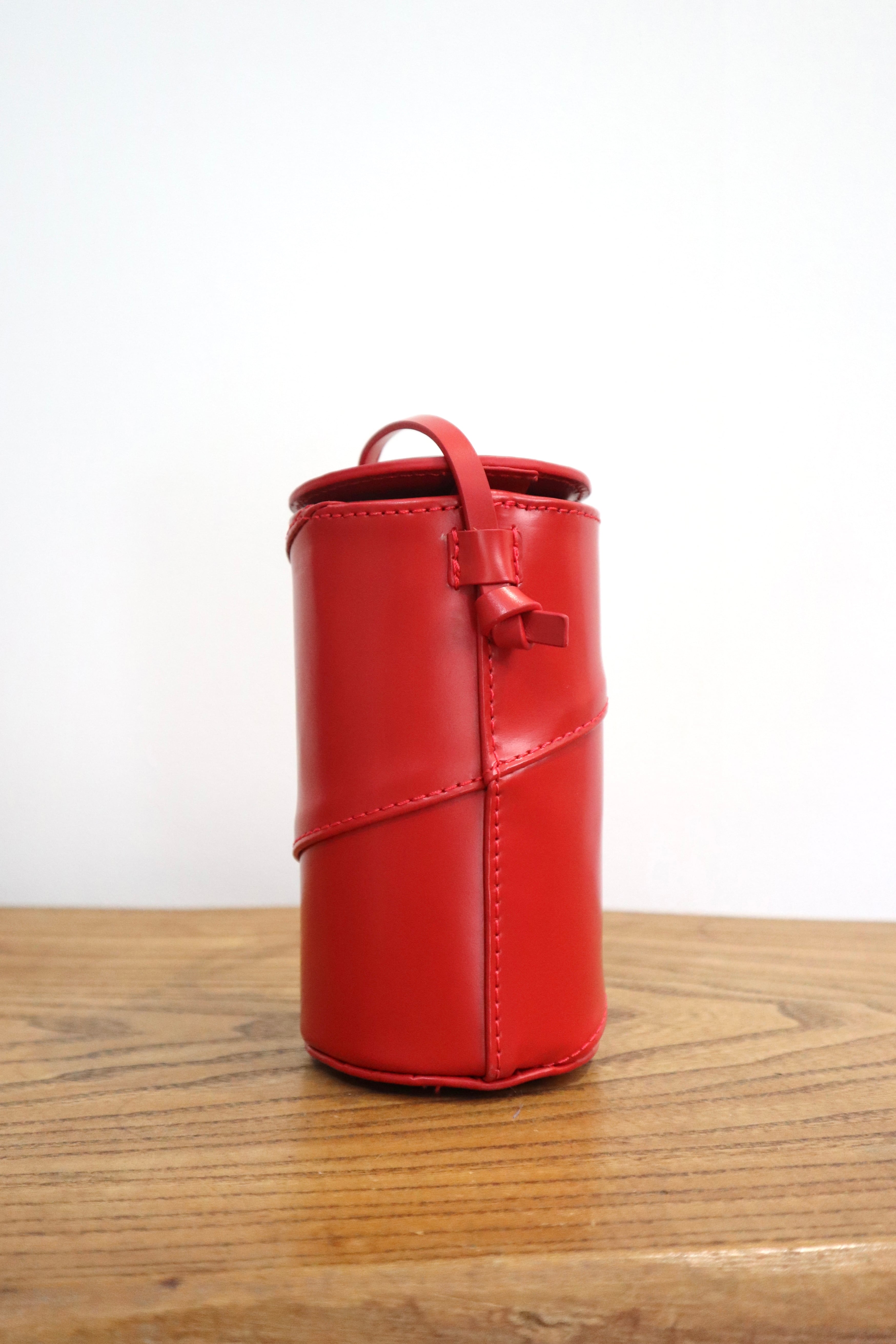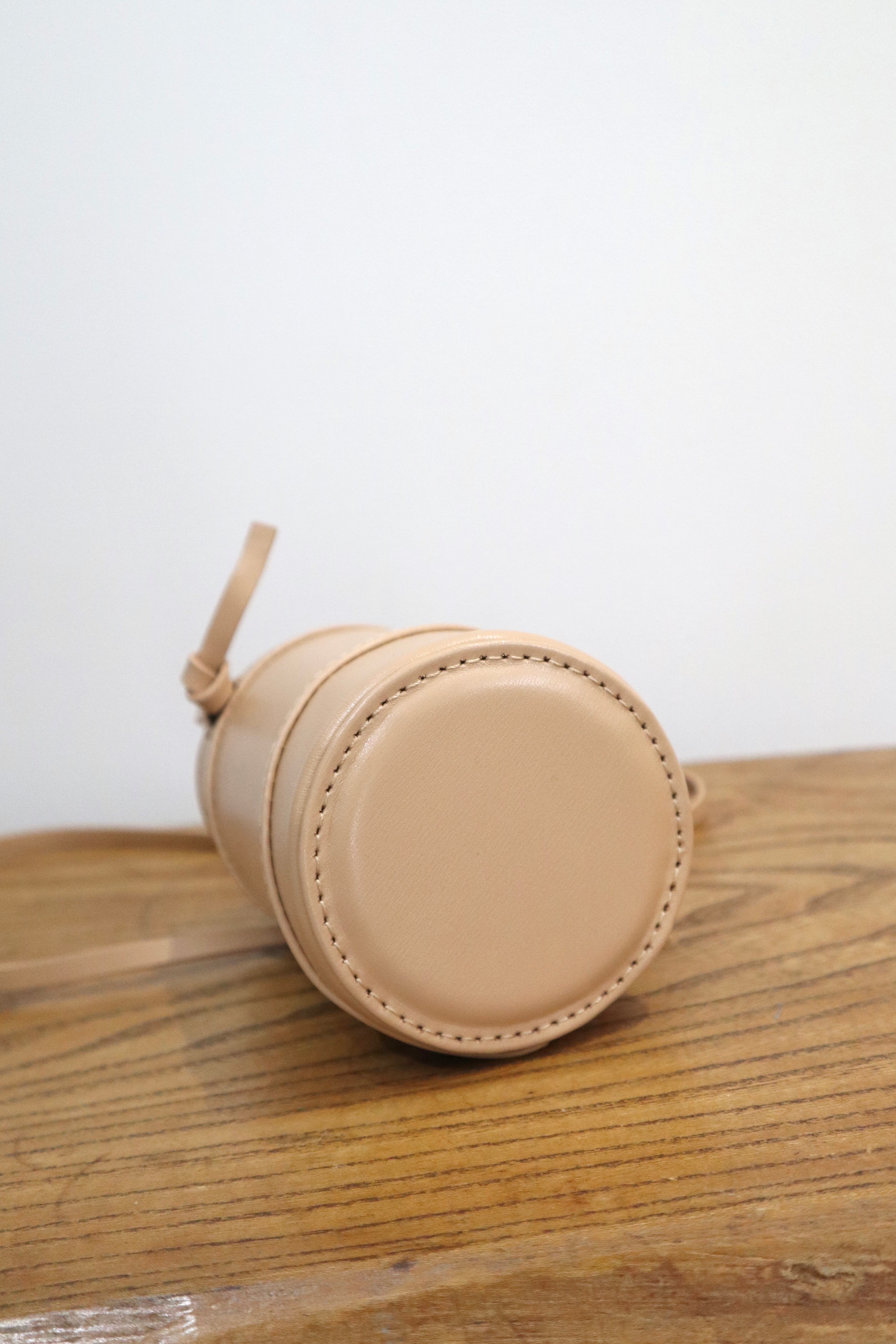 こちらは高さ14cmのMINIタイプ。横幅7.5cm以内の携帯電話ならすっぽりと収まります。ショルダーは紐の結び目を変えることで調節できるようになっております。サンプルからの修正点は蓋の裏側の芯材をもう少し厚みをだして蓋が遊ばないようになる予定です。
