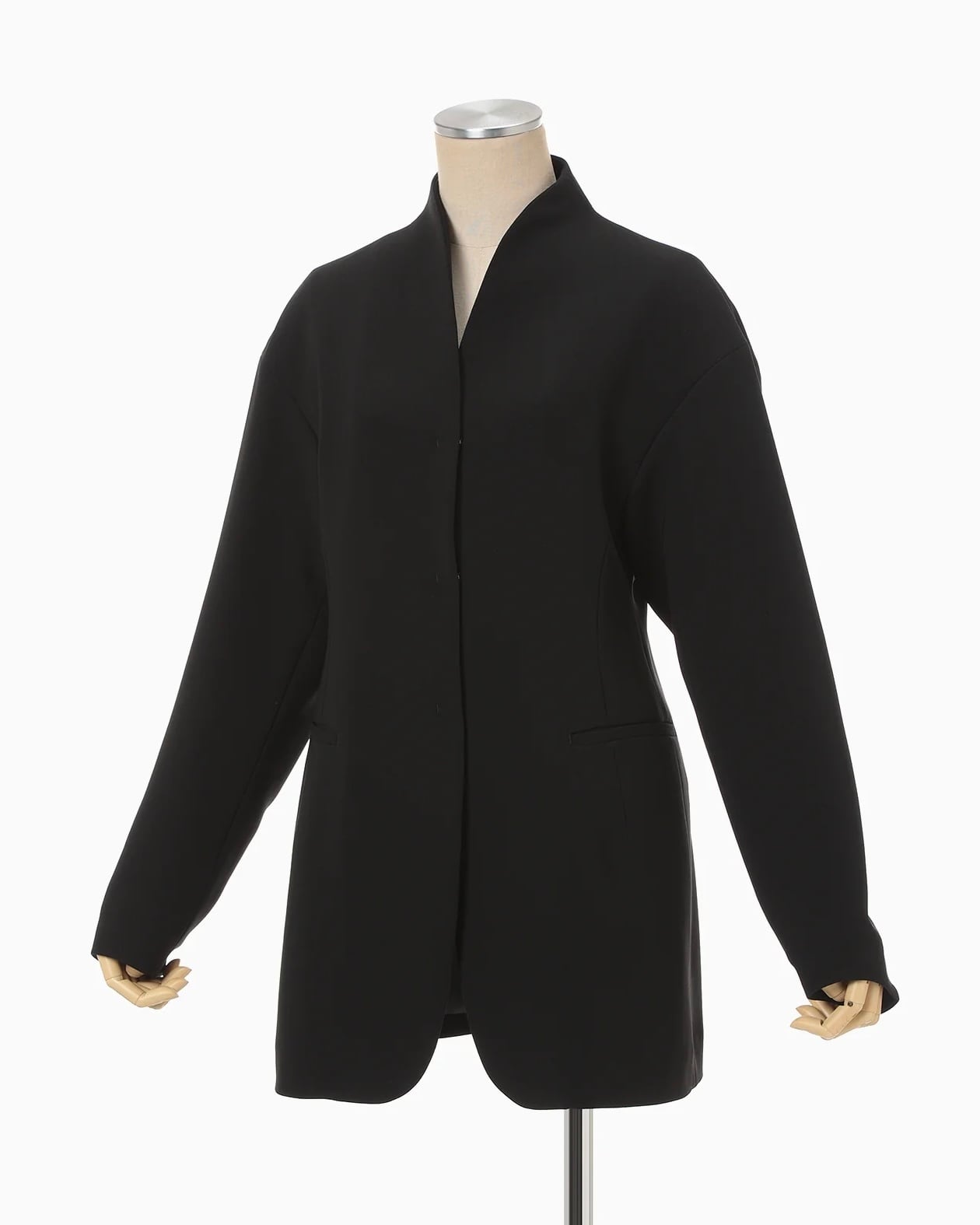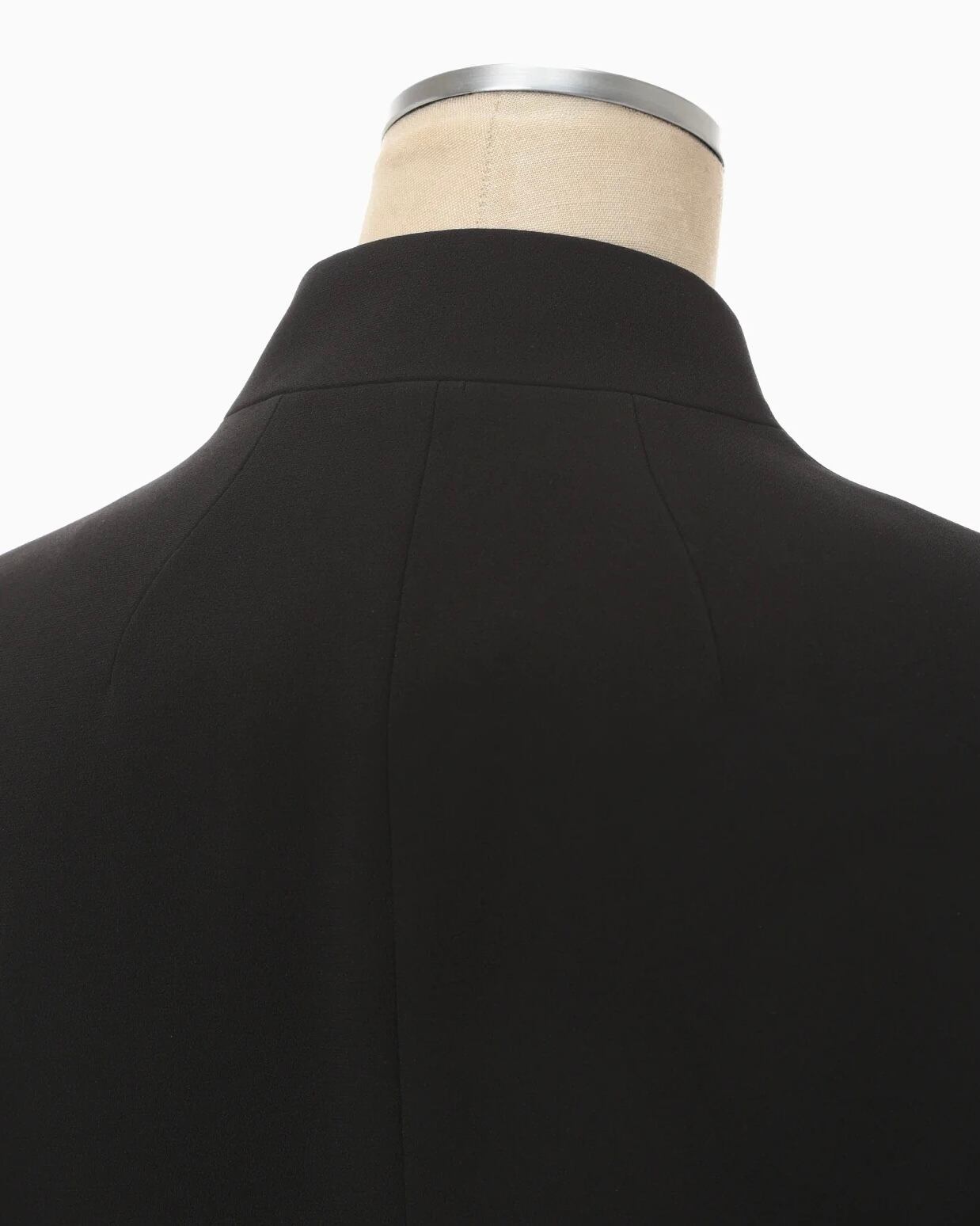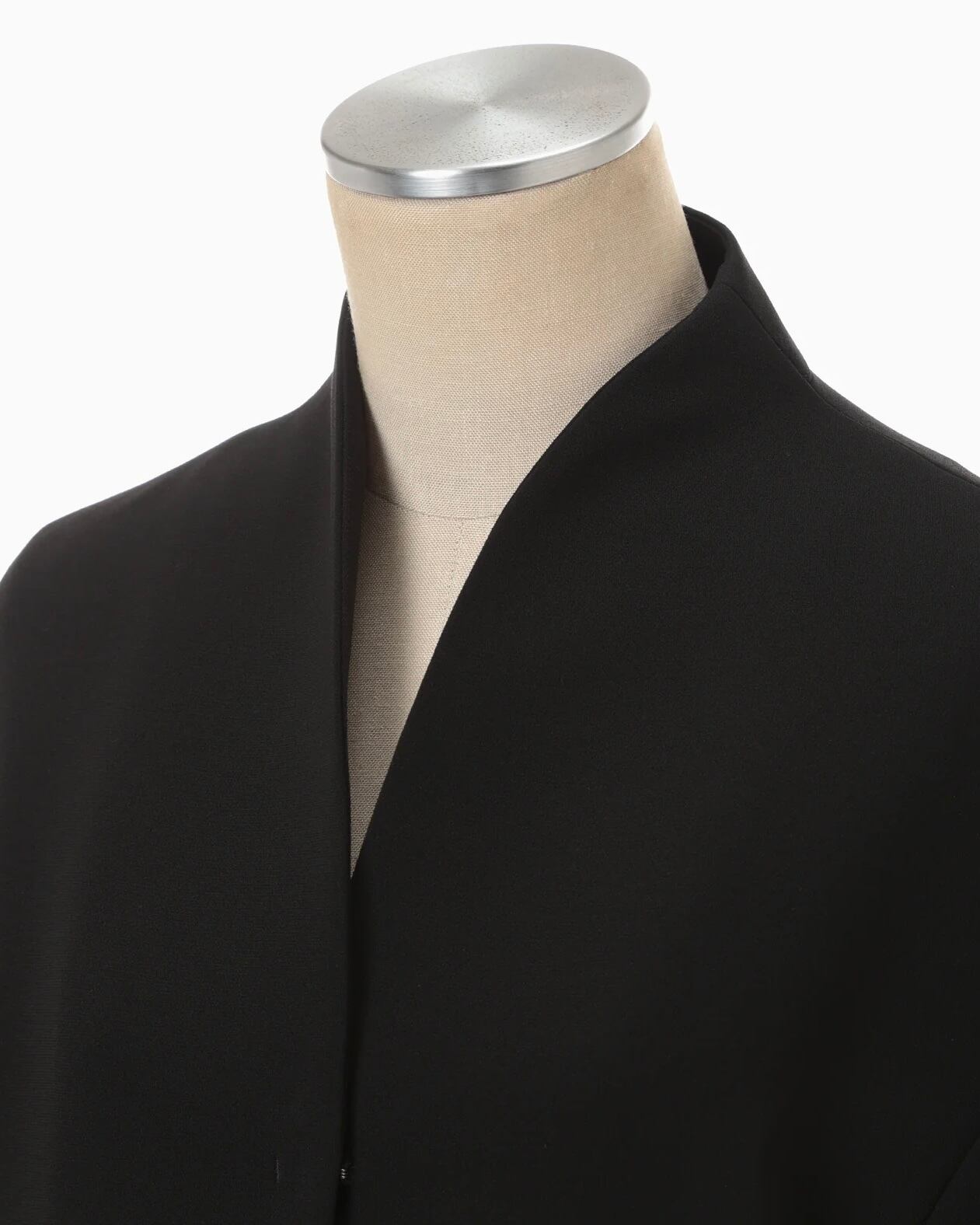 シルキーなタッチと豊かな膨らみがしっかりとした印象を与える。やや長めに設定された着丈に、襟のカッティングやペプラムのようなウエスト切り替えがメリハリのある立体的なシルエットを生み出し、身体を優しく包み込む。