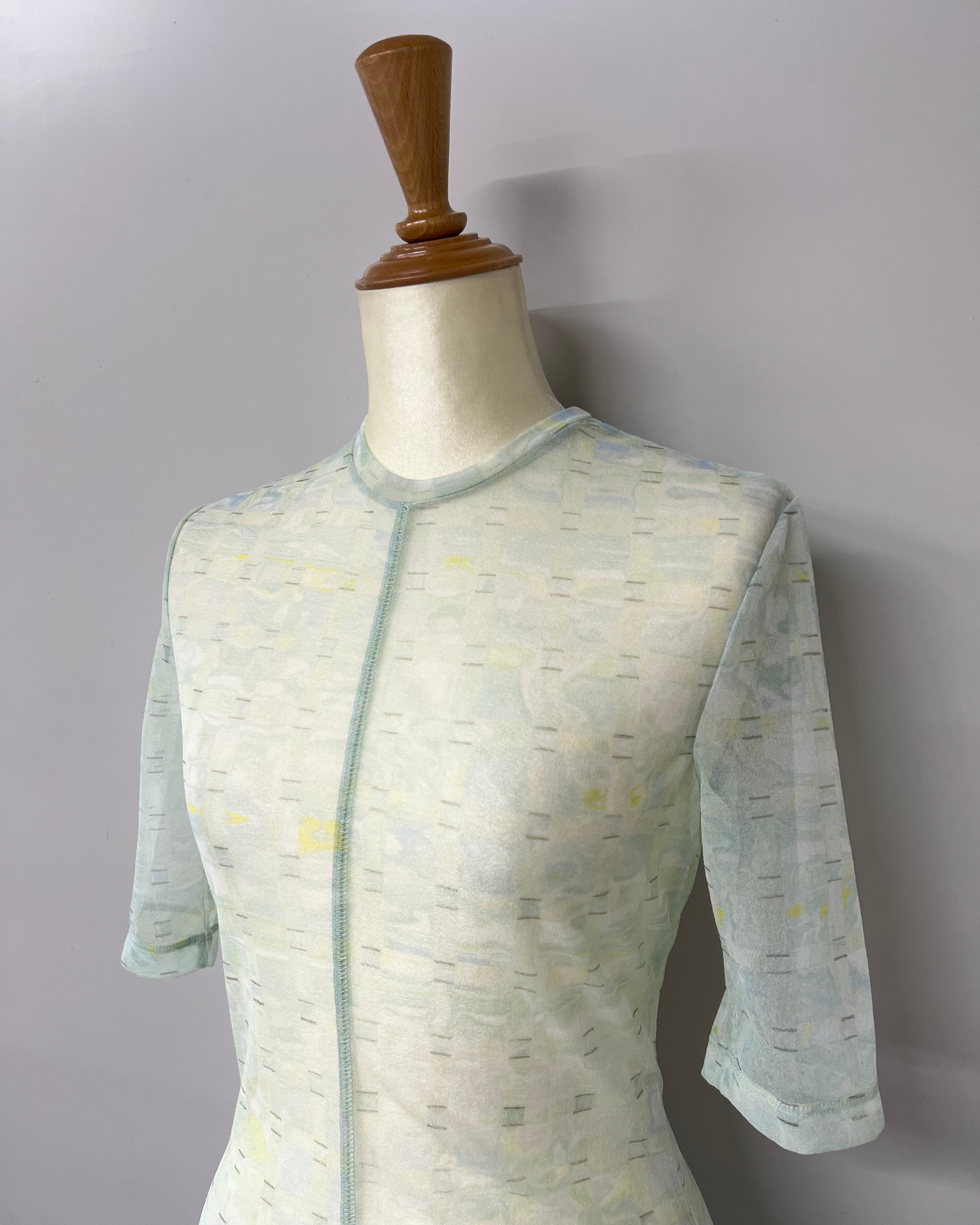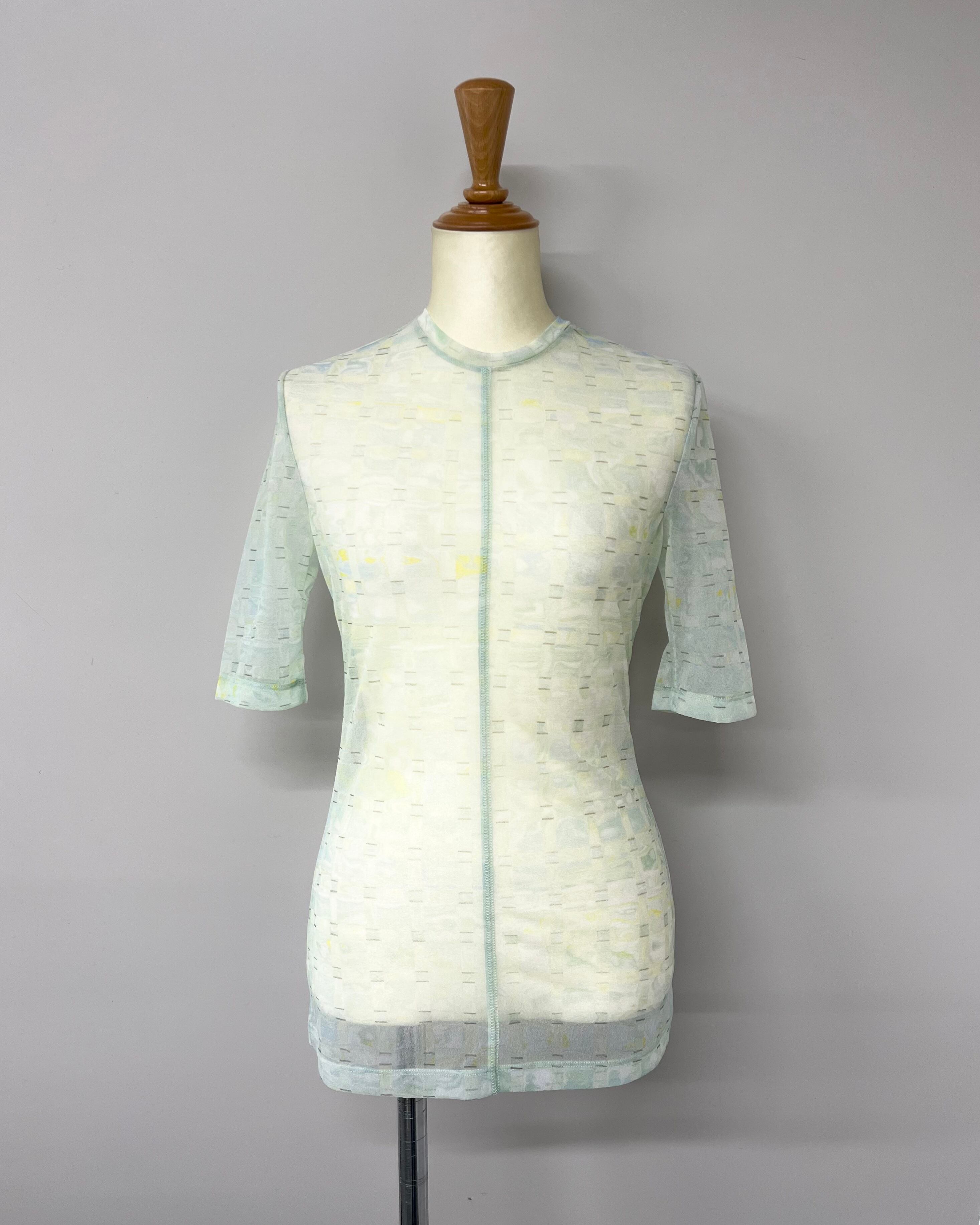 Mame Kurogouchi / Marble Printed Plaid Sheer Crew Neck Top - mint green◉