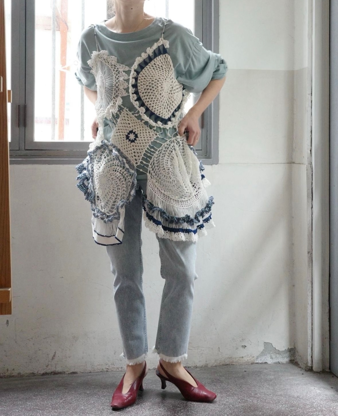 まるで陶器を纏っているかの様なニットドレスは、素材感の異なる3種の糸を組み合わせ、陶片を思わせる様々なパーツが幾重にも連なるアイコニックなデザインに。肩紐やパーツの隙間を埋めるビーズは手作業で仕上げられ、手仕事の丁寧さが感じられる1着に。ドレスとしての着用はもちろん、様々なトップスやボトムスとレイヤードすることで、忽ち装いをコンセプチュアルへと押し上げる。